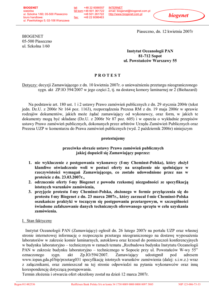 BIOGENET siedziba ul. Szkolna 1/60; 05-500 Piaseczno biuro handlowe: ul. Pawińskiego 5; 02-106 Warszawa tel: +48 22 6086557 tel kom:+48 601 361722 +48 501 261722 fax: +48 22 6086463 INTERNET email: [email protected] http://www.biogenet.com.pl biogenet Piaseczno, dn. 12 kwietnia 2007r BIOGENET 05-500 Piaseczno ul. Szkolna 1/60 Instytut Oceanologii PAN 81-712 Sopot ul. Powstańców Warszawy 55 PROTEST Dotyczy: decyzji Zamawiającego z dn. 10 kwietnia 2007r. o unieważnieniu przetargu nieograniczonego sygn. akt ZP.IO 594/2007 w jego części 2, tj. na dostawę komory laminarnej nr 2 (Biohazard) Na podstawie art. 180 ust. 1 i 2 ustawy Prawo zamówień publicznych z dn. 29 stycznia 2004r (tekst jedn. Dz.U. z 2006r Nr 164 poz. 1163), rozporządzenia Prezesa RM z dn. 19 maja 2006r w sprawie rodzajów dokumentów, jakich może żądać zamawiający od wykonawcy, oraz form, w jakich te dokumenty mogą być składane (Dz.U. z 2006r Nr 87 poz. 605) i w oparciu o wykładnie przepisów ustawy Prawo zamówień publicznych, dokonanych przez arbitrów Urzędu Zamówień Publicznych oraz Prezesa UZP w komentarzu do Prawa zamówień publicznych (wyd. 2 październik 2006r) niniejszym protestujemy przeciwko obrazie ustawy Prawo zamówień publicznych jakiej dopuścił się Zamawiający poprzez: 1. nie wykluczenie z postępowania wykonawcy (f-my Cheminst-Polska), który złożył kłamliwe oświadczenie woli w postaci oferty na urządzenie nie spełniające w rzeczywistości wymagań Zamawiającego, co zostało udowodnione przez nas w proteście z dn. 23.03.2007r., 2. odrzucenie oferty f-my Biogenet z powodu rzekomej niezgodności ze specyfikacją istotnych warunków zamówienia, 3. przyjęcie protestu f-my Cheminst-Polska, złożonego w formie przyłączenia się do protestu f-my Biogenet z dn. 23 marca 2007r., który zarzucał f-mie Cheminst-Polska oszukańcze praktyki w toczącym się postępowaniu przetargowym, w szczególności świadome zafałszowanie danych technicznych oferowanego sprzętu w celu uzyskania zamówienia. I. Stan faktyczny Instytut Oceanologii PAN (Zamawiający) ogłosił dn. 26 lutego 2007r na portalu UZP oraz własnej stronie internetowej informację o rozpoczęciu przetargu nieograniczonego na dostawę wyposażenia laboratoriów w zakresie komór laminarnych, autoklawu oraz krzeseł do pomieszczeń konferencyjnych w budynku laboratoryjno – technicznym w ramach tematu „Rozbudowa budynku Instytutu Oceanologii PAN w zakresie budynku laboratoryjno – technicznego w Sopocie przy ul. Powstańców W-wy 55” oznaczonego sygn. akt Zp.IO/594/2007. Zamawiający udostępnił pod adresem www.iopan.gda.pl/bip/przetarg031 specyfikację istotnych warunków zamówienia (dalej: s.i.w.z.) wraz z załącznikami, oraz zamieszczał na tej stronie odpowiedzi na pytania wykonawców oraz inną korespondencję dotyczącą postępowania. Termin złożenia i otwarcia ofert określony został na dzień 12 marca 2007r. Regon 011482536 Raiffeisen Bank Polska SA nr konta 34 1750 0009 0000 0000 0097 5885 NIP 123-006-73-33 BIOGENET siedziba ul. Szkolna 1/60; 05-500 Piaseczno biuro handlowe: ul. Pawińskiego 5; 02-106 Warszawa tel: +48 22 6086557 tel kom:+48 601 361722 +48 501 261722 fax: +48 22 6086463 INTERNET email: [email protected] http://www.biogenet.com.pl biogenet Dnia 19 marca 2007r Zamawiający rozstrzygnął częściowo postępowanie przetargowe, zamieszczając na swojej stronie internetowej informację, że w części 1 „komora laminarna” postępowanie unieważniono na podstawie art. 93 ust. 1 pkt 1 i ust. 2 wobec nie złożenia żadnej oferty, w części 2 „komora laminarna” wybrano ofertę firmy Cheminst-Polska (Olszewskiego 7, 51 642 Wrocław), w części 3 „autoklaw” wybrano ofertę firmy Sanlab s.c. (Okopowa 47, 01 059 Warszawa). Dnia 23 marca 2007r Zamawiający unieważnił postępowanie w części 4. Na decyzję Zamawiającego z dnia 10 marca 2007r w części 2, dotyczącej wyboru oferty firmy Cheminst-Polska, został złożony dnia 23 marca 2007r protest przez firmę Biogenet. II. Zarzut obrazy ustawy Prawo zamówień publicznych poprzez nie wykluczenie z postępowania firmy Cheminst-Polska podczas ponownego badania złożonych ofert Zamawiający uznał zarzuty postawione w proteście f-my Biogenet z dn. 23 marca 2007r, co potwierdził w piśmie z dn. 29 marca 2007r informując, że przeprowadzi ponowne badanie i ocenę ofert złożonych w tej części postępowania. Komisja przetargowa dopatrzyła się również innych (nazwanych delikatnie) rozbieżności w ofercie f-my Cheminst-Polska i zażądała złożenia wyjaśnień. Prawo zamówień publicznych wyraźnie nakazuje zamawiającemu w art. 24 ust. 2 pkt 2 wykluczenie z postępowania o udzielenie zamówienia wykonawców, którzy złożyli nieprawdziwe informacje mające wpływ na wynik prowadzonego postępowania. Prezes Urzędu Zamówień Publicznych w komentarzu do Pzp na str. 102 pisze: określenie „wyklucza się” [w art. 24] oznacza nałożony przez ustawodawcę na zamawiającego obowiązek dokonania czynności wykluczenia w przypadku zaistnienia którejkolwiek z przesłanek wykluczenia. Opisane wyżej oszukańcze działanie wykonawcy, wytknięte w proteście Biogenetu, jest przestępstwem ściganym z mocy prawa przez m. in. Kodeks karny, w szczególności jego art. 305, który brzmi: Art. 305. § 1. Kto, w celu osiągnięcia korzyści majątkowej, udaremnia lub utrudnia przetarg publiczny albo wchodzi w porozumienie z inną osobą działając na szkodę właściciela mienia albo osoby lub instytucji, na rzecz której przetarg jest dokonywany, podlega karze pozbawienia wolności do lat 3. § 2. Tej samej karze podlega, kto w związku z publicznym przetargiem rozpowszechnia informacje lub przemilcza istotne okoliczności mające znaczenie dla zawarcia umowy będącej przedmiotem przetargu albo wchodzi w porozumienie z inną osobą, działając na szkodę właściciela mienia albo osoby lub instytucji, na rzecz której pr
