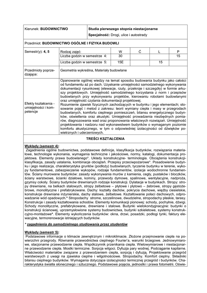 Kierunek: BUDOWNICTWO Studia pierwszego stopnia niestacjonarne Specjalność: Drogi, ulice i autostrady Przedmiot: BUDOWNICTWO OGÓLNE I FIZYKA BUDOWLI Semestr(y): 4, 5 Przedmioty poprzedzające: Efekty kształcenia umiejętności i kompetencje Rodzaj zajęć: Liczba godzin w semestrze 4: W 30 Liczba godzin w semestrze 5: 15E Ć L P 15 15 Geometria wykreślna, Materiały budowlane Opanowanie ogólnej wiedzy na temat sposobu budowania budynku jako całości od fundamentu aŜ po dach. Uzyskanie umiejętności samodzielnego wykonywania dokumentacji rysunkowej (elewacje, rzuty, przekroje i szczegóły) w formie arkuszy projektowych. Umiejętność samodzielnego korzystania z norm i przepisów budowlanych przy wykonywaniu projektów, kierowaniu robotami budowlanymi oraz umiejętność czytania dokumentacji projektowej. Rozumienie zjawisk fizycznych zachodzących w budynku i jego elementach; stosowanie pojęć i metod z zakresu: teorii wymiany ciepła i masy w przegrodach budowlanych, komfortu cieplnego pomieszczeń, bilansu energetycznego budynków, oświetlenia oraz akustyki. Umiejętność prowadzenia niezbędnych pomiarów, diagnozowania wad oraz proponowania właściwych rozwiązań. Umiejętność projektowania i nadzoru nad wykonawstwem budynków o wymaganym poziomie komfortu akustycznego, w tym o odpowiedniej izolacyjności od dźwięków powietrznych i uderzeniowych. TREŚCI KSZTAŁCENIA Wykłady (semestr 4): Zagadnienia ogólne budownictwa, podstawowe definicje, klasyfikacja budynków, rozwiązania materiałowe, technologie wykonania, wymagania techniczne i jakościowe, normy, katalogi, dokumentacja projektowa. Elementy prawa budowlanego*. Układy konstrukcyjne- terminologia. ObciąŜenia konstrukcjiklasyfikacja, zasady ustalania, kombinacje obciąŜeń. Przepisy przeciwpoŜarowe*. Posadowienie budynku i jego realizacja, charakterystyka gruntów (podłoŜy) budowlanych, tyczenie budynku w terenie, wykopy fundamentowe, zabezpieczenie wykopów, rodzaje fundamentów, izolacje wodochronne fundamentów. Ściany murowane budynków: zasady wykonywania murów z kamienia, cegły, pustaków i bloczków, ściany warstwowe, ścianki działowe, kominy, przewody dymowe, spalinowe, wentylacyjne, nadproŜa, gzymsy cokoły. Ściany budynków drewnianych rodzaje konstrukcji. Dylatacje w budynkach. Stropy: stropy drewniane, na belkach stalowych, stropy Ŝelbetowe – płytowe i płytowo – Ŝebrowe, stropy gęstoŜebrowe, monolityczne i prefabrykowane. Dachy: kształty dachów, pokrycia dachowe, więźby ciesielskie, konstrukcje drewniane inŜynierskie, dachy stalowe, Ŝelbetowe. Kształtowanie połaci dachowych, odprowadzanie wód opadowych.* Stropodachy strome, szczelinowe, dwudzielne, stropodachy płaskie, tarasy. Konstrukcje i zasady kształtowania schodów. Elementy komunikacji pionowej: schody, pochylnie, dźwigi. Schody monolityczne, prefabrykowane, drewniane i stalowe. Budynki wielokondygnacyjne: budynki o konstrukcji ścianowej, uprzemysłowione systemy budownictwa, budynki szkieletowe, systemy konstrukcyjno-montaŜowe*. Elementy wykończenia budynków: okna, drzwi, posadzki, podłogi tynki, faktury elewacyjne, termorenowacje istniejących budynków. * zagadnienia do samodzielnego studiowania przez studentów Wykłady (semestr 5): Podstawowe informacje o klimacie zewnętrznym i mikroklimacie. ZłoŜone przejmowanie ciepła na powierzchni przegrody. Równanie przewodnictwa cieplnego Fourier’a, warunki brzegowe. Jednowymiarowe, stacjonarne przewodzenie ciepła. Współczynnik przenikania ciepła. Wielowymiarowe i niestacjonarne przewodzenie ciepła. Mostki termiczne. Sorpcja wilgoci. Dyfuzja pary wodnej. Podciąganie kapilarne. Właściwości materiałów związane z przewodzeniem ciepła, sorpcją i dyfuzją. Projektowanie przegród warstwowych z uwagi na zjawiska cieplne i wilgotnościowe. Stropodachy. Komfort cieplny. Składniki bilansu cieplnego budynków. Wymagania dotyczące izolacyjności termicznej przegród i budynków. Charakterystyka światła słonecznego i sztucznego. Podstawowe pojęcia, jednostki i prawa fotometrii. Oświe- tlenie światłem dziennym, współczynnik oświetlenia. Wymagania dotyczące oświetlenia. Podstawowe zagadnienia z zakresu akustyki budynków (w tym akustyki pomieszczeń oraz środowiska) i ich właściwości w zakresie izolacyjności akustycznej i pochłaniania dźwięków. * zagadnienia do samodzielnego studiowania przez studentów Ćwiczenia projektowe (semestr 4): Ćwiczenia projektowe obejmują audytoria i elementy projektu architektoniczno–budowlanego budynku mieszkalnego niepodpiwniczonego w tym: arkusz 1 –rzut parteru, 2 –rzut więźby dachowej, 3 –przekrój poprzeczny budynku, 4 –elewacje, 5 –szczegóły i detale budynku. Laboratorium (semestr 5): Dotykowe i bezdotykowe metody i przyrządy do pomiaru temperatury. Metody i przyrządy do pomiaru wilgotności powietrza i materiałów budowlanych. Pomiar oporu cieplnego przegród. Zintegrowany miernik komfortu cieplnego. Pomiar miejscowego natęŜenia oświetlenia. Obliczenia i dobór konstrukcji budowlanych pod względem ich właściwości akustycznych, w tym izolacyjności od dźwięków powietrznych i uderzeniowych w ścianach masywnych i o konstrukcji warstwowej (z drzwiami i oknami), w stropach i podłogach pływających. Wykaz literatury podstawowej i uzupełniającej (semestr 4): 1. 2. 3. 4. 5. 6. 7. 8. 9. 10. Byrdy Cz., Kram D., Korepta K., Śliwiński M.: Podstawy budownictwa. Cz. II Skrypt-Politechnika Krakowska. Kraków 1998. Byrdy Cz.: Ciepłochronne konstrukcje ścian budynków mieszkalnych. Podręcznik akademicki P.K. Kraków 2006. Byrdy Cz.: Ciepłochronne stropodachy budynków mieszkalnych - analiza wad i usterek.. Podręcznik akademicki-Politechnika Krakowska. Kraków 2000. Byrdy Cz.: Podstawy projektowania energooszczędnych stropodachów szczelinowych poddaszy mieszkalnych. Pomoc dydaktyczna. P.K. Kraków 1998. Byrdy Cz.: Zasady ocieplania budynków mieszkalnych. Pomoc 