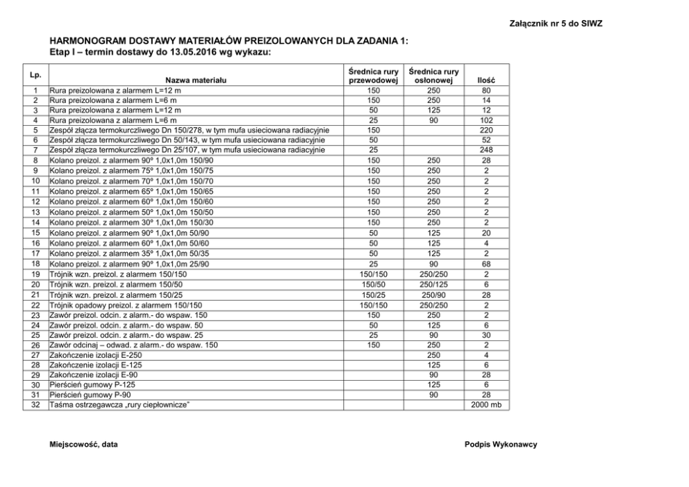 Załącznik nr 5 do SIWZ HARMONOGRAM DOSTAWY MATERIAŁÓW PREIZOLOWANYCH DLA ZADANIA 1: Etap I – termin dostawy do 13.05.2016 wg wykazu: Lp. 1 2 3 4 5 6 7 8 9 10 11 12 13 14 15 16 17 18 19 20 21 22 23 24 25 26 27 28 29 30 31 32 Nazwa materiału Rura preizolowana z alarmem L=12 m Rura preizolowana z alarmem L=6 m Rura preizolowana z alarmem L=12 m Rura preizolowana z alarmem L=6 m Zespół złącza termokurczliwego Dn 150/278, w tym mufa usieciowana radiacyjnie Zespół złącza termokurczliwego Dn 50/143, w tym mufa usieciowana radiacyjnie Zespół złącza termokurczliwego Dn 25/107, w tym mufa usieciowana radiacyjnie Kolano preizol. z alarmem 90º 1,0x1,0m 150/90 Kolano preizol. z alarmem 75º 1,0x1,0m 150/75 Kolano preizol. z alarmem 70º 1,0x1,0m 150/70 Kolano preizol. z alarmem 65º 1,0x1,0m 150/65 Kolano preizol. z alarmem 60º 1,0x1,0m 150/60 Kolano preizol. z alarmem 50º 1,0x1,0m 150/50 Kolano preizol. z alarmem 30º 1,0x1,0m 150/30 Kolano preizol. z alarmem 90º 1,0x1,0m 50/90 Kolano preizol. z alarmem 60º 1,0x1,0m 50/60 Kolano preizol. z alarmem 35º 1,0x1,0m 50/35 Kolano preizol. z alarmem 90º 1,0x1,0m 25/90 Trójnik wzn. preizol. z alarmem 150/150 Trójnik wzn. preizol. z alarmem 150/50 Trójnik wzn. preizol. z alarmem 150/25 Trójnik opadowy preizol. z alarmem 150/150 Zawór preizol. odcin. z alarm.- do wspaw. 150 Zawór preizol. odcin. z alarm.- do wspaw. 50 Zawór preizol. odcin. z alarm.- do wspaw. 25 Zawór odcinaj – odwad. z alarm.- do wspaw. 150 Zakończenie izolacji E-250 Zakończenie izolacji E-125 Zakończenie izolacji E-90 Pierścień gumowy P-125 Pierścień gumowy P-90 Taśma ostrzegawcza „rury ciepłownicze” Miejscowość, data Średnica rury przewodowej 150 150 50 25 150 50 25 150 150 150 150 150 150 150 50 50 50 25 150/150 150/50 150/25 150/150 150 50 25 150 Średnica rury osłonowej 250 250 125 90 250 250 250 250 250 250 250 125 125 125 90 250/250 250/125 250/90 250/250 250 125 90 250 250 125 90 125 90 Ilość 80 14 12 102 220 52 248 28 2 2 2 2 2 2 20 4 2 68 2 6 28 2 2 6 30 2 4 6 28 6 28 2000 mb Podpis Wykonawcy