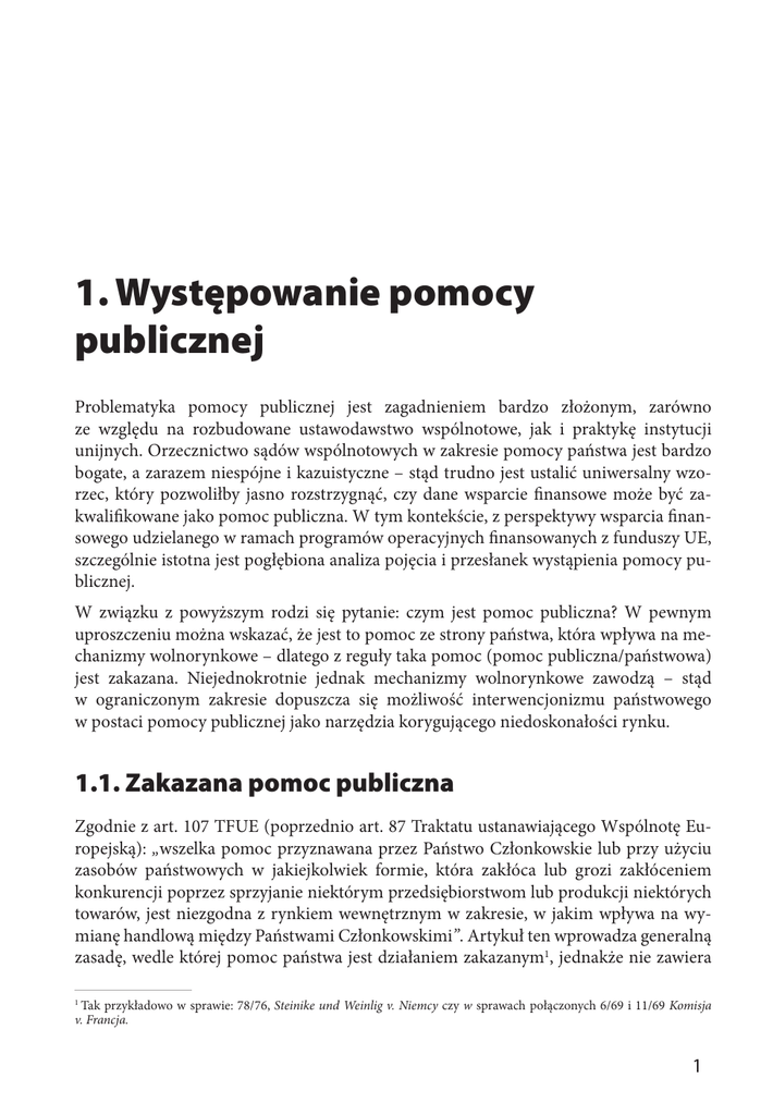 1. Występowanie pomocy publicznej Problematyka pomocy publicznej jest zagadnieniem bardzo złożonym, zarówno ze względu na rozbudowane ustawodawstwo wspólnotowe, jak i praktykę instytucji unijnych. Orzecznictwo sądów wspólnotowych w zakresie pomocy państwa jest bardzo bogate, a zarazem niespójne i kazuistyczne – stąd trudno jest ustalić uniwersalny wzorzec, który pozwoliłby jasno rozstrzygnąć, czy dane wsparcie finansowe może być zakwalifikowane jako pomoc publiczna. W tym kontekście, z perspektywy wsparcia finansowego udzielanego w ramach programów operacyjnych finansowanych z funduszy UE, szczególnie istotna jest pogłębiona analiza pojęcia i przesłanek wystąpienia pomocy publicznej. W związku z powyższym rodzi się pytanie: czym jest pomoc publiczna? W pewnym uproszczeniu można wskazać, że jest to pomoc ze strony państwa, która wpływa na mechanizmy wolnorynkowe – dlatego z reguły taka pomoc (pomoc publiczna/państwowa) jest zakazana. Niejednokrotnie jednak mechanizmy wolnorynkowe zawodzą – stąd w ograniczonym zakresie dopuszcza się możliwość interwencjonizmu państwowego w postaci pomocy publicznej jako narzędzia korygującego niedoskonałości rynku. 1.1. Zakazana pomoc publiczna Zgodnie z art. 107 TFUE (poprzednio art. 87 Traktatu ustanawiającego Wspólnotę Europejską): „wszelka pomoc przyznawana przez Państwo Członkowskie lub przy użyciu zasobów państwowych w jakiejkolwiek formie, która zakłóca lub grozi zakłóceniem konkurencji poprzez sprzyjanie niektórym przedsiębiorstwom lub produkcji niektórych towarów, jest niezgodna z rynkiem wewnętrznym w zakresie, w jakim wpływa na wymianę handlową między Państwami Członkowskimi”. Artykuł ten wprowadza generalną zasadę, wedle której pomoc państwa jest działaniem zakazanym1, jednakże nie zawiera Tak przykładowo w sprawie: 78/76, Steinike und Weinlig v. Niemcy czy w sprawach połączonych 6/69 i 11/69 Komisja v. Francja. 1 1 1. Występowanie pomocy publicznej on precyzyjnej definicji takiej pomocy, a jedynie wskazuje podstawowe cechy charakteryzujące pomoc publiczną. W doktrynie wskazuje się, że nie jest to zabieg przypadkowy. Artykuł 107 ust. 1 TFUE ma bowiem stanowić swoisty zawór bezpieczeństwa, dzięki któremu Komisja i TSUE mogą interpretować pojęcie pomocy publicznej w szeroki i elastyczny sposób, w zależności od specyfiki danej sprawy. W konsekwencji, każdorazowa ocena danego wsparcia jako spełniającego/niespełniającego kryteriów pomocy publicznej, wymaga nie tylko analizy odpowiednich aktów prawnych, lecz także (a często przede wszystkim) stanowiska Komisji i orzecznictwa Trybunału. W oparciu o treść art. 107 ust. 1 TFUE, ugruntowane stanowisko Komisji2 oraz orzecznictwo TSUE przyjmuje się, że co do zasady dane wsparcie finansowe może być zakwalifikowane jako pomoc publiczna, jeśli spełnia następujące kryteria3: 1) pochodzi od państwa lub ze źródeł państwowych; 2) stanowi korzyść dla beneficjenta wsparcia (przedsiębiorcy); 3) jest selektywne (uprzywilejowuje/sprzyja niektórym przedsiębiorcom lub produkcji niektórych towarów); 4) zakłóca lub zagraża zakłóceniem konkurencji oraz wpływa na wewnątrzwspólnotową wymianę handlową. Dane wsparcie można zakwalifikować jako pomoc publiczną wyłącznie wówczas, jeśli spełnia wszystkie powyższe kryteria. Dlatego, dla wykazania, że dofinansowanie nie jest pomocą publiczną, wystarczające jest udowodnienie, że nie została spełniona choćby jedna z wymienionych wyżej przesłanek. yy Kryterium pochodzenia środków od państwa lub ze źródeł państwowych Kryterium pochodzenia środków od państwa lub ze źródeł państwowych jest bardzo szeroko rozumiane. Zarówno orzecznictwo, jak i praktyka Komisji dostarczają w tym względzie wielu wskazówek pozwalających zinterpretować rozumienie tej przesłanki. Przez „pomoc pochodzącą od państwa” rozumie się taką pomoc, która zostaje przyznana przez jakiekolwiek organy państwowe (przykładowo: centralne organy państwa, władze regionalne i lokalne4, jednostki budżetowe, państwowe i samorządowe fundusze celowe, Narodowy Fundusz Zdrowia, Zakład Ubezpieczeń Społecznych i Kasa Rolniczego Ubezpieczenia Społecznego, a także państwowe i samorządowe osoby prawne utworzone w celu realizacji zadań publicznych). W konsekwencji, za pomoc państwa można uznać np.: pożyczki, gwarancje, poręczenia udzielane przez Skarb Państwa lub JST, subwencje, dotacje lub zwolnienia od podatków lub opłat przysługujących państwu5. Decyzja Komisji 90/70/EEC. Orzeczenie w sprawie C 280/00 Almarkt Trans. 4 C-248/84 Niemcy przeciwko Komisji. 5 Tak: B. Kurcz, Komentarz do Traktatu o funkcjonowaniu Unii Europejskiej, LEX 2012. 2 3 2 1.1. Zakazana pomoc publiczna Ponadto, za pomoc pochodzącą od państwa uznawana jest również taka pomoc, która nie zostaje udzielona bezpośrednio przez organy państwowe, jednak w praktyce władza publiczna ma znaczący wpływ na sam fakt przyznania wsparcia lub ukształtowanie jego warunków6. Co istotne, przedsiębiorstwa publiczne pozostające pod kontrolą państwa nie są automatycznie traktowane jako organy państwa, a tym samym działania takich przedsiębiorstw nie mogą być z góry uznawane za działania władzy publicznej7. Zgodnie z orzeczeniem w sprawie Van der Kooy i inni8, podstawową przesłanką, na podstawie której należy ustalić, czy dany podmiot/przedsiębiorstwo może zostać uznane za podmiot publiczny, jest realna kontrola jego działalności przez państwo. Wskazać należy, że jako pochodzące od państwa kwalifikowane będą nie tylko środki przyznawane w ramach programów operacyjnych, lecz także środki pochodzące z innych źródeł zagranicznych – omawiany przepis dotyczy bowiem wszelkich środków znajdujących się pod kontrolą państwa. Drugim elementem, którego znaczenie należy poddać analizie na gruncie omawianego kryterium
