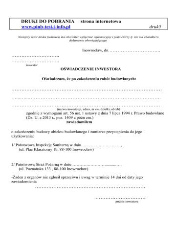 DRUKI DO POBRANIA www.pinb-test.i-info.pl strona internetowa druk5 Niniejszy wzór druku (wniosek) ma charakter wyłącznie informacyjny i pomocniczy tj. nie ma charakteru dokumentu obowiązującego. Inowrocław, dn………………………….. ……………………….. ……………………….. inwestor OŚWIADCZENIE INWESTORA Oświadczam, że po zakończeniu robót budowlanych: ……………………………………………………………………………… …...…...……………………………………………………………………. ……………………………………………………………………………… (nazwa inwestycji, adres, nr ew. działki, obreb) zgodnie z wymogami art. 56 ust. 1 ustawy z dnia 7 lipca 1994 r. Prawo budowlane (Dz. U. z 2013 r., poz. 1409 z późn zm.) zawiadomiłem o zakończeniu budowy obiektu budowlanego i zamiarze przystąpienia do jego użytkowania: 1/ Państwową Inspekcję Sanitarną w dniu ……… ………...….…, (ul. Plac Klasztorny 1b, 88-100 Inowrocław) 2/ Państwową Straż Pożarną w dniu ……………………..........…, (ul. Poznańska 133 , 88-100 Inowrocław) -Żaden z organów nie zgłosił sprzeciwu i uwag w terminie 14 dni od daty jego zawiadomienia ………………………………………………………… ………………………… podpis inwestora