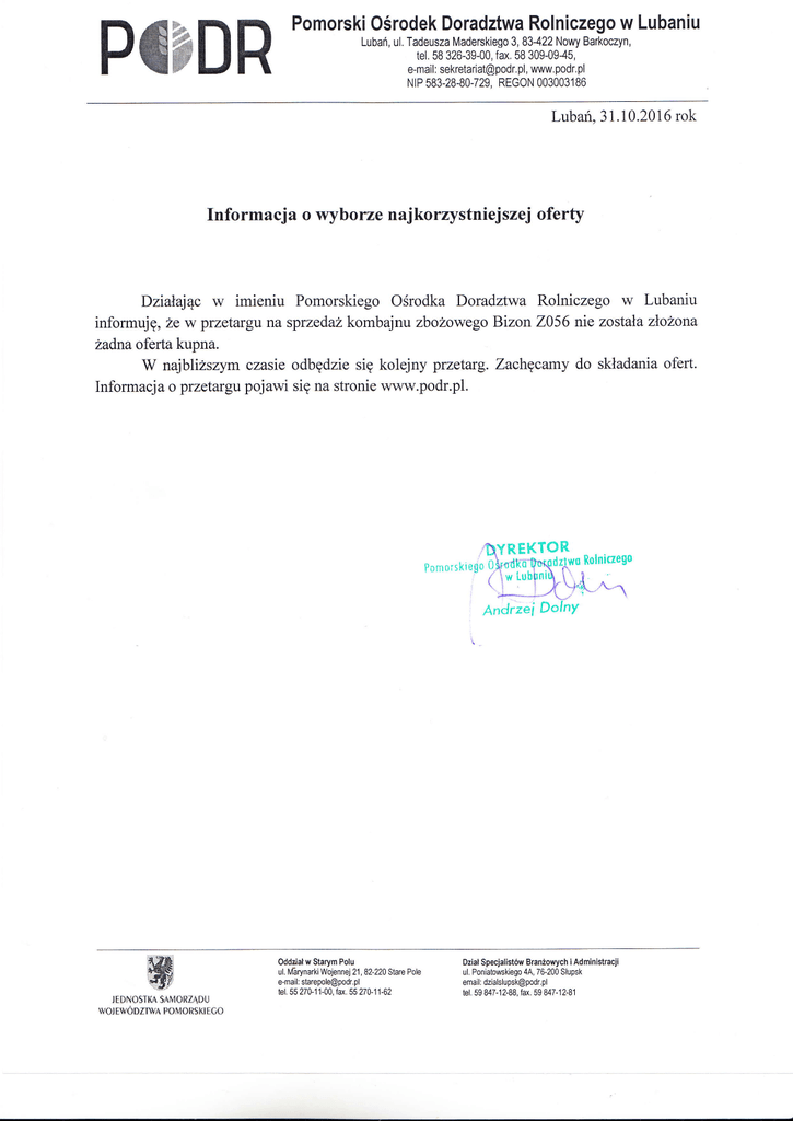 pWWDR Pomorski OśrodekDoradztwa Rolniczego w Lubaniu Lubań, ul. Tadeusza Maderskiego 3,83Ą22 Nowy Barkoczyn, tel. 58 326-39-00, fax. 58 309-0945, e-mail : [email protected], www.podr,pl NlP 583-28_80-729, REGoN 003003186 Lubań,31.10.2016 rok lnformacja o wyborze n aj ko rzystniej szej oferty Działając w imieniu Pomorskiego Ośrodka Doradztwa Rolniczego w Lubaniu informuję, że w przetargu na sprzedłżkombajnu zbożowego Bizon Z056 nie zostńa ńożona żadna oferta kupna. W najbliższym czasie odbędzie się kolejny przetatg. Zachęcamy do składania ofert. Informacja o przetargu pojawi się na stronie www.podr.pl. oddriał w starym Polu §$l\$§TM sArl$§ZĄau lv(x §\łó§;ll\}a P0§i$lł$xl !o{) ul, Mbrynarki Wojennej 2'1, 82-220 Stare Pole e-mail: starepole@podr,pl tel, 55 270-'1 1-00, fax, 55270-11-62 Dział specjalistów Branźowych i Administracji Ul. Poniatowskiego 4A, 76-200 Słupsk email: dzialslupsk@podr,pl tel, 59 847-12-88, fax. 59 847-12-81