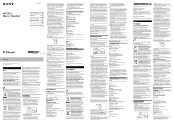 4-477-580-52(1) Wireless Stereo Headset Guia de Referência PT Przewodnik PL Áttekintő útmutató HU Referenční příručka CZ Referenčna priručka SK Справочно ръководство BG ˎˎ Uma vez que os dispositivos Bluetooth e LAN sem fios (IEEE802.11b/g) utilizam a mesma frequência, pode ocorrer interferência de micro-ondas e resultar na deterioração da velocidade de comunicação, ruído ou ligação inválida se este aparelho for utilizado perto de um dispositivo LAN sem fios. Nesse caso, faça o seguinte. ēē Utilize estes auscultadores a mais de 10 metros de um dispositivo LAN sem fios. ēē Se tiver de utilizar os auscultadores a menos de 10 metros de um dispositivo LAN sem fios, desligue o dispositivo. ēē Instale estes auscultadores e o dispositivo Bluetooth o mais perto possível um do outro. ˎˎ As micro-ondas emitidas por um dispositivo Bluetooth podem afetar o funcionamento de dispositivos médicos eletrónicos. Desligue os auscultadores e outros dispositivos Bluetooth nos seguintes locais, pois pode provocar um acidente: ēē onde existir gás inflamável, num hospital, comboio, avião ou bomba de combustível ēē perto de portas automáticas ou alarmes de incêndio ˎˎ Este aparelho suporta características de segurança que estão em conformidade com a norma Bluetooth, para proporcionar um ligação segura sempre que utilizar a tecnologia Bluetooth sem fios, mas dependendo da definição a segurança pode não ser suficiente. Tenha cuidado ao comunicar utilizando a tecnologia Bluetooth sem fios. ˎˎ Não assumimos quaisquer responsabilidades pela fuga de informação durante a comunicação Bluetooth. ˎˎ Não garantimos a ligação com todos os dispositivos Bluetooth. ēē É necessário um dispositivo com função Bluetooth estar em conformidade com a norma Bluetooth especificada pela Bluetooth SIG, Inc. e ser autenticado. ēē Mesmo que o dispositivo ligado esteja em conformidade com a norma Bluetooth acima mencionada, alguns dispositivos, dependendo das suas funções ou características técnicas, podem não ligar ou funcionar corretamente. ēē Dependendo do dispositivo ou do ambiente de comunicação, enquanto falar através de um sistema mãos livres pode ouvir ruído de fundo. ˎˎ Dependendo do dispositivo a ser ligado, pode precisar de algum tempo até começar a comunicação. Se não conseguir utilizar a unidade ˎˎ Restaure a unidade. Insira um pequeno pino, etc. no orifício e empurre até sentir um clique. As informações de sincronização não são eliminadas. 1) 2) 3) 4) 5) O alcance real varia consoante alguns fatores, como obstáculos entre dispositivos, campos magnéticos junto de um microondas, eletricidade estática, sensibilidade da receção, desempenho da antena, sistema operativo, aplicações de software, etc. Os perfis da norma BLUETOOTH indicam o objetivo da comunicação BLUETOOTH entre dispositivos. Codec: Compressão do sinal de áudio e formato de conversão Codec Sub-banda Codificação de Áudio Avançada Auscultadores estéreo sem fios Fonte de alimentação DC 3,7 V: Bateria recarregável interna de iões de lítio DC 5 V: Quando são carregados utilizando USB Massa Aprox. 210 g Temperatura de funcionamento 0 °C a 40 °C Consumo de potência nominal 1,5 W Número de horas de utilização Tempo de reprodução de música: Máx. 17 horas Tempo de comunicação: Máx. 17 horas Tempo em modo de espera: Máx. 450 horas Tempo de carregamento Aprox. 2,5 horas Carregamento da unidade unidade só poderá ser carregada através de USB. É necessário um computador pessoal com porta USB para o carregamento. ˎˎ Esta unidade não pode ser ligada através de BLUETOOTH durante o carregamento. Nota sobre eletricidade estática ˎˎ A eletricidade estática acumulada no corpo poderá provocar um leve formigueiro nos seus ouvidos. Para minimizar o efeito, utilize vestuário fabricado em materiais naturais. MDR-10RBT ©2013 Sony Corporation Printed in China http://www.sony.net/ Português Aviso Para evitar riscos de choque eléctrico, não abra a caixa do aparelho. Consulte a assistência técnica, a reparação só pode ser efectuada por pessoal qualificado. Não instale o aparelho num espaço fechado, como uma estante ou um armário embutido. Não exponha a bateria (bateria ou pilhas instaladas) a calor excessivo, como luz solar directa, fogo ou situações semelhantes, durante muito tempo. Nota para os clientes: as seguintes informações aplicam-se apenas ao equipamento comercializado nos países que aplicam as Directivas da UE Este produto foi fabricado por ou em nome da Sony Corporation, 1-7-1 Konan Minato-ku Tokyo, 108-0075 Japão. As questões relativas à conformidade dos produtos com base na legislação da União Europeia devem ser dirigidas ao representante autorizado, Sony Deutschland GmbH, Hedelfinger Strasse 61, 70327 Stuttgart, Alemanha. Para quaisquer assuntos de serviço ou garantia, consulte os endereços fornecidos nos documentos de serviço ou de garantia. Se por motivos de segurança, desempenho ou protecção de dados, os produtos necessitarem de uma ligação permanente a uma pilha integrada, esta só deve ser substituída por profissionais qualificados. Acabado o período de vida útil do aparelho, coloque-o no ponto de recolha de produtos eléctricos/electrónicos de forma a garantir o tratamento adequado da bateria integrada. Para as restantes pilhas, por favor, consulte as instruções do equipamento sobre a remoção da mesma. Deposite a bateria num ponto de recolha destinado a resíduos de pilhas e baterias. Para informações mais detalhadas sobre a reciclagem deste produto, por favor contacte o município onde reside, os serviços de recolha de resíduos da sua área ou a loja onde adquiriu o produto. A marca escrita e logótipos BLUETOOTH são propriedade da Bluetooth SIG, Inc. e permanece sob licença qualquer utilização de tais marcas pela Sony Corporation. A Marca N é uma marca co