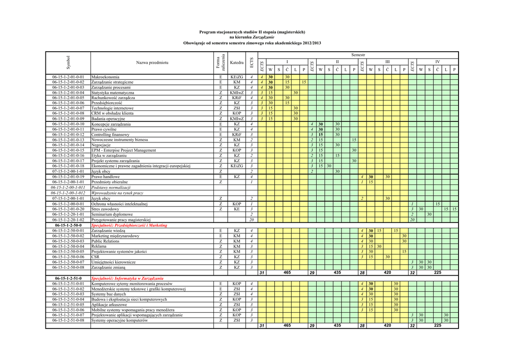 E E E Z Z Z Z Z Z E E E Z Z Z Z Z Z Z E Z Z Z Z E E Z Z Z Z Z Z KEiZG KM KZ KMIwZ KRiF KZ ZSI KOP KMIwZ KZ KZ KRiF KM KZ KOP KZ KZ KEiZG KZ KOP KE KZ KM KM KM KM KZ KZ KZ 4 4 4 3 4 3 3 3 3 4 4 3 2 3 3 2 3 3 2 4 1 4 4 4 3 4 3 3 3 3 30 30 30 15 30 30 15 15 15 Specjalność: Informatyka w Zarządzaniu Komputerowe sytemy monitorowania procesów Menedżerskie systemy tekstowe i grafiki komputerowej Systemy baz danych Budowa i eksploatacja sieci komputerowych Aplikacje arkuszowe Mobilne systemy wspomagania pracy menedżera Projektowanie aplikacji wspomagających zarządzanie Systemy operacyjne komputerów E E Z Z Z Z Z Z KOP ZSI ZSI KOP ZSI KOP KOP ZSI S Ć L 30 15 30 P II W S Ć 30 30 15 15 15 15 15 15 15 30 30 30 30 L P III W 4 1 30 15 S Ć L P ECTS W W S Ć L P 30 30 15 30 30 30 15 30 30 15 30 30 2 1 3 2 20 2 4 4 4 3 3 3 3 3 4 4 4 3 3 3 30 30 1 3 2 20 465 29 435 4 4 4 3 3 3 3 3 465 29 435 28 15 30 15 15 30 15 30 15 30 30 30 30 15 30 30 15 15 30 420 28 4 4 4 3 3 3 31 IV 15 4 4 3 2 3 3 2 3 3 2 31 06-15-1-2-51-0 06-15-1-2-51-0-01 06-15-1-2-51-0-02 06-15-1-2-51-0-03 06-15-1-2-51-0-04 06-15-1-2-51-0-05 06-15-1-2-51-0-06 06-15-1-2-51-0-07 06-15-1-2-51-0-08 I ECTS ECTS Katedra ECTS Makroekonomia Zarządzanie strategiczne Zarządzanie procesami Statystyka matematyczna Rachunkowość zarządcza Przedsiębiorczość Technologie internetowe CRM w obsłudze klienta Badania operacyjne Koncepcje zarządzania Prawo cywilne Controlling finansowy Nowoczesne instrumenty biznesu Negocjacje EPM - Enterpise Project Management Etyka w zarządzaniu Projekt systemu zarządzania Ekonomiczne i prawne zagadnienia integracji europejskiej Język obcy Prawo handlowe Przedmioty obieralne Podstawy normalizacji Wprowadzenie na rynek pracy Język obcy Ochrona własności intelektualnej Stres zawodowy Seminarium dyplomowe Przygotowanie pracy magisterskiej Specjalność: Przedsiębiorczość i Marketing Zarządzanie wiedzą Marketing międzynarodowy Public Relations Reklama Projektowanie systemów jakości CSR Umiejętności kierownicze Zarządzanie zmianą Semestr ECTS 06-15-1-2-01-0-01 06-15-1-2-01-0-02 06-15-1-2-01-0-03 06-15-1-2-01-0-04 06-15-1-2-01-0-05 06-15-1-2-01-0-06 06-15-1-2-01-0-07 06-15-1-2-01-0-08 06-15-1-2-01-0-09 06-15-1-2-01-0-10 06-15-1-2-01-0-11 06-15-1-2-01-0-12 06-15-1-2-01-0-13 06-15-1-2-01-0-14 06-15-1-2-01-0-15 06-15-1-2-01-0-16 06-15-1-2-01-0-17 06-15-1-2-01-0-18 07-15-1-2-00-1-01 06-15-1-2-01-0-19 06-15-1-2-00-1-01 06-15-1-2-00-1-011 06-15-1-2-00-1-012 07-15-1-2-00-1-01 06-15-1-2-00-0-01 06-15-1-2-01-0-20 06-15-1-2-20-1-01 06-15-1-2-20-1-02 06-15-1-2-50-0 06-15-1-2-50-0-01 06-15-1-2-50-0-02 06-15-1-2-50-0-03 06-15-1-2-50-0-04 06-15-1-2-50-0-05 06-15-1-2-50-0-06 06-15-1-2-50-0-07 06-15-1-2-50-0-08 Nazwa przedmiotu Forma zaliczenia Symbol Program stacjonarnych studiów II stopnia (magisterskich) na kierunku Zarządzanie Obowiązuje od semestru semestru zimowego roku akademickiego 2012/2013 3 3 32 30 30 30 30 3 3 32 30 30 225 30 30 30 30 30 30 30 30 30 15 15 15 420 30 30 225 06-15-1-2-53-0 06-15-1-2-53-0-01 06-15-1-2-53-0-02 06-15-1-2-53-0-03 06-15-1-2-53-0-04 06-15-1-2-53-0-05 06-15-1-2-53-0-06 06-15-1-2-53-0-07 06-15-1-2-53-0-08 Specjalność: Zarządzanie bezpieczeństwem Systemy bezpieczeństwa i ochrony Metody ilościowe i jakościowe oceny ryzyka Matematyczne metody wspomagania decyzji Biozagrożenia i Plany Bezpieczenstwa Ergonomia w systemach zautomatyzowanych Rachunek kosztów bezpieczeństwa Zarządzanie bezpieczeństwem publicznym Modelowanie zagrożeń KE KMIwZ KMIwZ KE KE KFiR KEiZG KMIwZ Specjalność: Gospodarka elektroniczna Bazy danych w internecie Programowanie aplikacji internetowych Inżynieria oprogramowania w e-Gospodarce Metody i narzędzia budowy serwisów WWW Internet i intranet w firmie Nowe technologie w marketingu Urządzenia mobilne i dostęp zdalny E-commerce E E Z Z Z Z Z Z ZSI ZSI ZSI ZSI ZSI KM ZSI ZSI Specjalność: Zarządzanie logistyczne w przedsiębiorstwie Zarządzanie łańcuchem dostaw Lean Production Bezpieczeństwo i ochrona danych Zintegrowane systemy zarządzania przedsiębiorstw Zarządzanie przepływem informacji w przedsębiorstwie Controlling logistyczny Symulacje i modelowanie procesów logistycznych Zarządzanie zmianami i wiedzą 06-15-1-2-56-0 06-15-1-2-56-0-01 06-15-1-2-56-0-02 06-15-1-2-56-0-03 06-15-1-2-56-0-04 06-15-1-2-56-0-05 06-15-1-2-56-0-06 06-15-1-2-56-0-07 06-15-1-2-56-0-08 Specjalność: Zarządzanie finansami Finanse samorządu terytorialnego Zaawansowana rachunkowość finansowa Funkcjonowanie rynku finansowego Zarządzanie projektami europejskimi Analizy finan.-ekon.w projektach unijnych Proces inwestycyjny w warunkach rozwoju zrównoważonego Efektywność ekonomiczna rozwiązań innowacyjnych Zarządzanie wartością przedsiębiorstwa E E Z Z Z Z Z Z KOP KOP KOP KOP KOP KOP KOP KOP KFiR KFiR KFiR KEiZG KEiZG KEiZG KEiZG KFiR W - Wykład Ć - Ćwiczenia L - Laboratorium P - Projekt S - Seminarium KE KEiZG KFiR KM KMIwZ KOP KZ ZSI W S Ć 465 29 435 L P 465 29 435 465 29 435 4 4 4 3 3 3 3 3 4 4 4 3 3 3 30 30 30 30 30 30 15 30 15 30 15 30 29 435 4 4 4 3 3 3 3 3 465 29 Katedra Ergonomii Katedra Ekonomii i Zarządzania Gospodarką Katedra Finansów i Rachunkowości Katedra Marketingu Katedra Metod Ilościowych w Zarządzaniu Katedra Organizacji Przedsiębiorstwa Katedra Zarządzania Zakład Systemów Informatycznych 435 30 30 30 30 30 30 30 30 30 15 15 15 L P 30 30 30 15 15 15 30 30 30 15 15 30 W 3 3 32 30 30 30 30 225 3 3 32 30 30 30 3 3 32 30 30 3 3 32 30 30 3 3 32 30 30 S Ć L 30 30 15 15 15 30 225 30 30 30 30 30 30 30 30 225 30 30 30 30 30 30 420 28 IV 30 420 28 28 Ć 420 28 4 4 4 3 3 3 S 420 28 4 4 4 3 3 3 465 III W 4 4 4 3 3 3 31 Z - Zaliczenie E - Egzamin P 4 4 4 3 3 3 3 3 31 E E Z Z Z Z Z Z L 4 4 4 3 3 3 31 06-15-1-2-55-0 06-15-1-2-55-0-01 06-15-1-2-55-0-02 06-15-1-2-55-0-03 06-15-1-2-55-0-04 06-15-1-2-55-0-05 06-15-1-2-55-0-06 06-15-1-2-55-0-07 06-15-1-2-55-0-08 Ć 4 4 4 3 3 3 3 3 31 06-15-1-2-54-0 06-15-1-2-54-0-01 06-15-1-2-54-0-