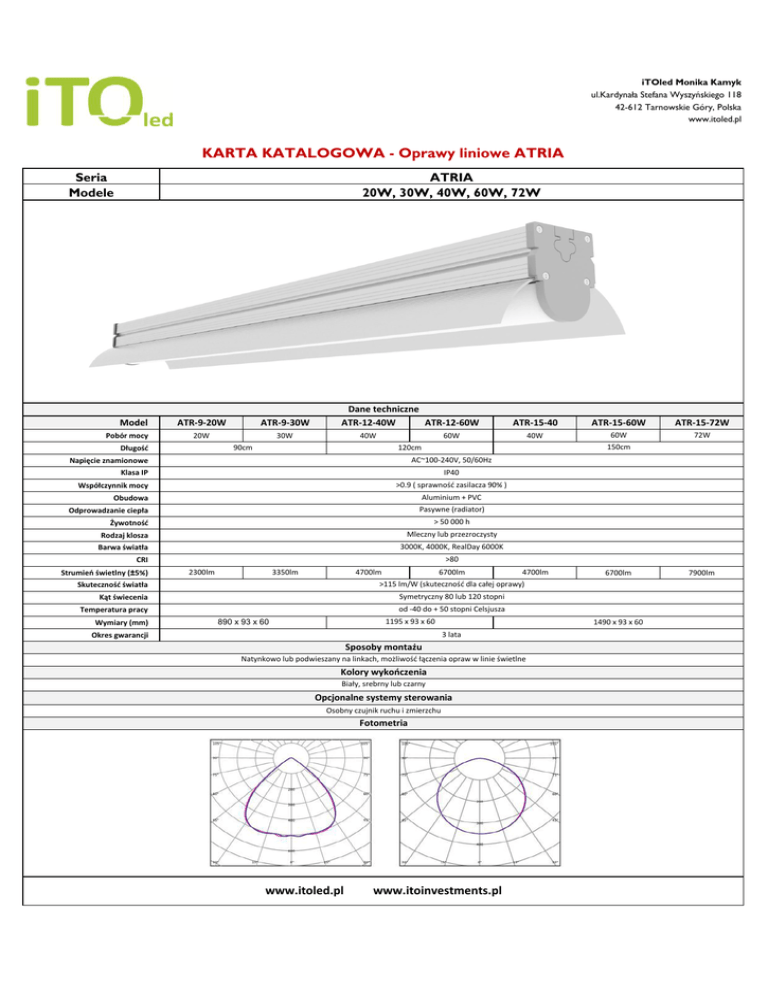 iTOled Monika Kamyk ul.Kardynała Stefana Wyszyńskiego 118 42-612 Tarnowskie Góry, Polska www.itoled.pl KARTA KATALOGOWA - Oprawy liniowe ATRIA Seria Modele ATRIA 20W, 30W, 40W, 60W, 72W Model Pobór mocy ATR-9-20W ATR-9-30W 20W 30W Dane techniczne ATR-12-40W ATR-12-60W 40W 90cm Długość ATR-15-72W 60W 72W 150cm AC~100-240V, 50/60Hz IP40 Klasa IP >0.9 ( sprawność zasilacza 90% ) Współczynnik mocy Aluminium + PVC Obudowa Pasywne (radiator) Odprowadzanie ciepła > 50 000 h Żywotność Rodzaj klosza Mleczny lub przezroczysty Barwa światła 3000K, 4000K, RealDay 6000K >80 CRI 2300lm 3350lm 4700lm 6700lm 4700lm 6700lm >115 lm/W (skuteczność dla całej oprawy) Skuteczność światła Kąt świecenia Symetryczny 80 lub 120 stopni Temperatura pracy od -40 do + 50 stopni Celsjusza Wymiary (mm) ATR-15-60W 40W 120cm Napięcie znamionowe Strumień świetlny (±5%) ATR-15-40 60W 1195 x 93 x 60 890 x 93 x 60 1490 x 93 x 60 3 lata Okres gwarancji Sposoby montażu Natynkowo lub podwieszany na linkach, możliwość łączenia opraw w linie świetlne Kolory wykończenia Biały, srebrny lub czarny Opcjonalne systemy sterowania Osobny czujnik ruchu i zmierzchu Fotometria www.itoled.pl www.itoinvestments.pl 7900lm