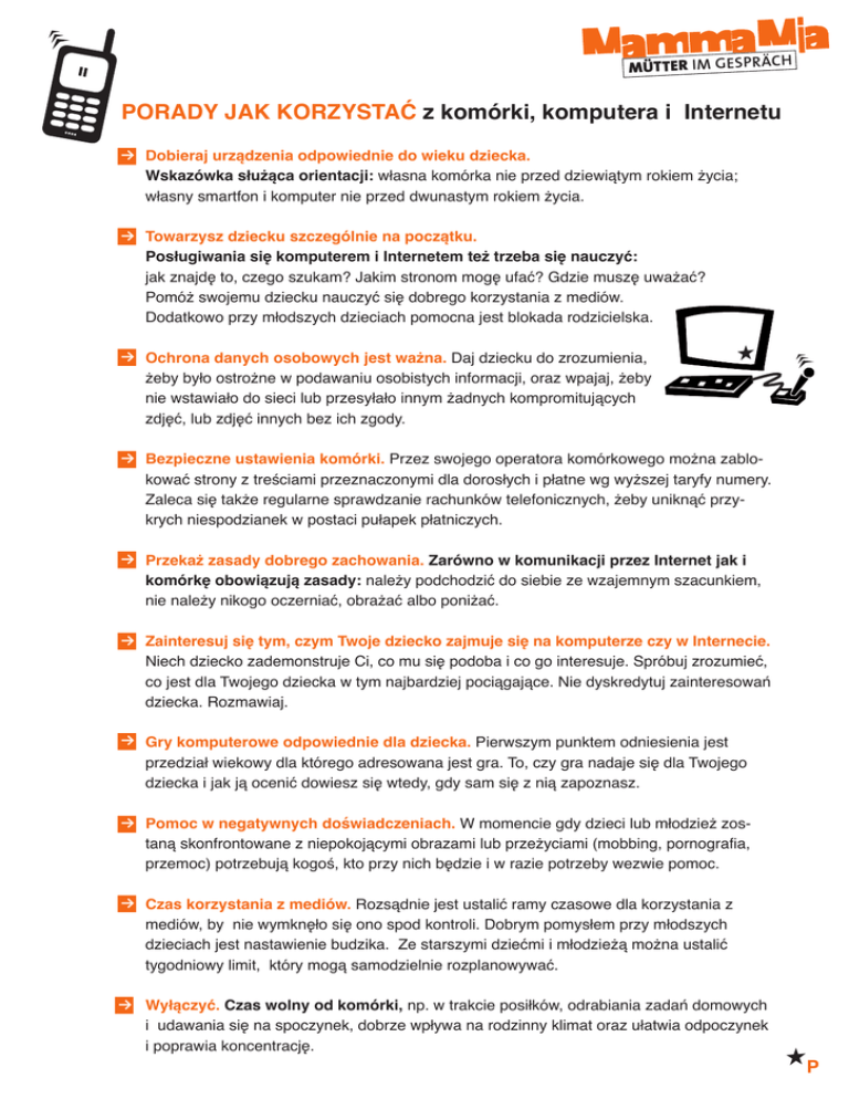 Mamma Mia MÜTTER IM GESPRÄCH II .. .. PORADY JAK KORZYSTAĆ z komórki, komputera i Internetu Y Dobieraj urządzenia odpowiednie do wieku dziecka. Wskazówka służąca orientacji: własna komórka nie przed dziewiątym rokiem życia; własny smartfon i komputer nie przed dwunastym rokiem życia. Y Towarzysz dziecku szczególnie na początku. Posługiwania się komputerem i Internetem też trzeba się nauczyć: jak znajdę to, czego szukam? Jakim stronom mogę ufać? Gdzie muszę uważać? Pomóż swojemu dziecku nauczyć się dobrego korzystania z mediów. Dodatkowo przy młodszych dzieciach pomocna jest blokada rodzicielska. Y Ochrona danych osobowych jest ważna. Daj dziecku do zrozumienia, żeby było ostrożne w podawaniu osobistych informacji, oraz wpajaj, żeby nie wstawiało do sieci lub przesyłało innym żadnych kompromitujących zdjęć, lub zdjęć innych bez ich zgody. Y Bezpieczne ustawienia komórki. Przez swojego operatora komórkowego można zablokować strony z treściami przeznaczonymi dla dorosłych i płatne wg wyższej taryfy numery. Zaleca się także regularne sprawdzanie rachunków telefonicznych, żeby uniknąć przykrych niespodzianek w postaci pułapek płatniczych. Y Przekaż zasady dobrego zachowania. Zarówno w komunikacji przez Internet jak i komórkę obowiązują zasady: należy podchodzić do siebie ze wzajemnym szacunkiem, nie należy nikogo oczerniać, obrażać albo poniżać. Y Zainteresuj się tym, czym Twoje dziecko zajmuje się na komputerze czy w Internecie. Niech dziecko zademonstruje Ci, co mu się podoba i co go interesuje. Spróbuj zrozumieć, co jest dla Twojego dziecka w tym najbardziej pociągające. Nie dyskredytuj zainteresowań dziecka. Rozmawiaj. Y Gry komputerowe odpowiednie dla dziecka. Pierwszym punktem odniesienia jest przedział wiekowy dla którego adresowana jest gra. To, czy gra nadaje się dla Twojego dziecka i jak ją ocenić dowiesz się wtedy, gdy sam się z nią zapoznasz. Y Pomoc w negatywnych doświadczeniach. W momencie gdy dzieci lub młodzież zostaną skonfrontowane z niepokojącymi obrazami lub przeżyciami (mobbing, pornografia, przemoc) potrzebują kogoś, kto przy nich będzie i w razie potrzeby wezwie pomoc. Y Czas korzystania z mediów. Rozsądnie jest ustalić ramy czasowe dla korzystania z mediów, by nie wymknęło się ono spod kontroli. Dobrym pomysłem przy młodszych dzieciach jest nastawienie budzika. Ze starszymi dziećmi i młodzieżą można ustalić tygodniowy limit, który mogą samodzielnie rozplanowywać. Y Wyłączyć. Czas wolny od komórki, np. w trakcie posiłków, odrabiania zadań domowych i udawania się na spoczynek, dobrze wpływa na rodzinny klimat oraz ułatwia odpoczynek i poprawia koncentrację. P