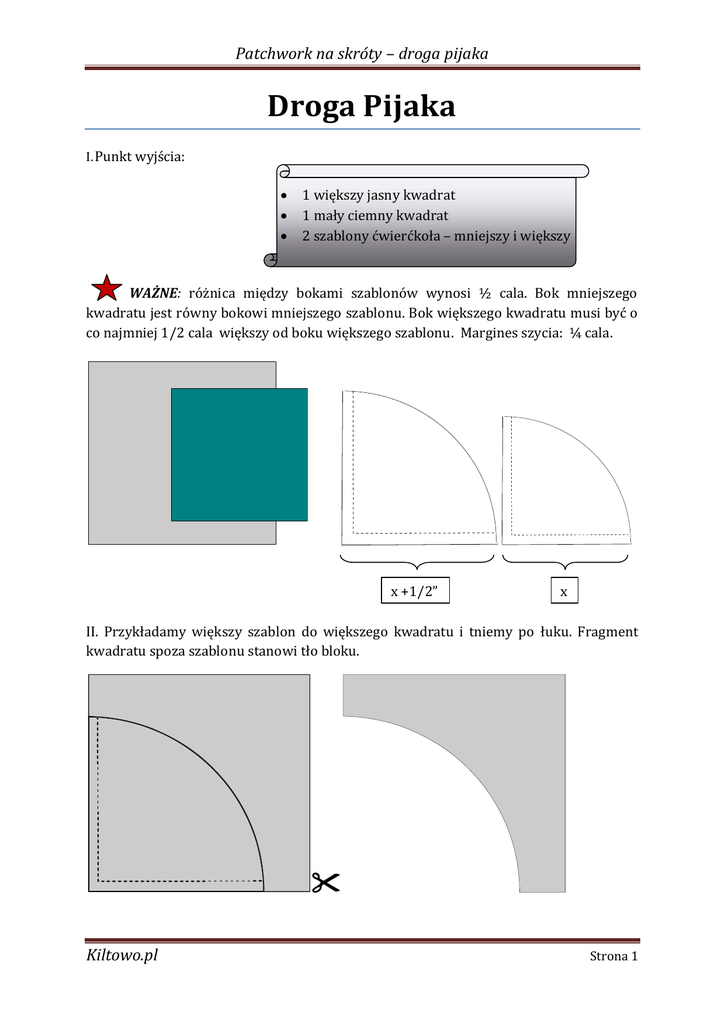 Patchwork na skróty – droga pijaka Droga Pijaka I. Punkt wyjścia: 1 większy jasny kwadrat 1 mały ciemny kwadrat 2 szablony ćwierćkoła – mniejszy i większy WAŻNE: różnica między bokami szablonów wynosi ½ cala. Bok mniejszego kwadratu jest równy bokowi mniejszego szablonu. Bok większego kwadratu musi być o co najmniej 1/2 cala większy od boku większego szablonu. Margines szycia: ¼ cala. x +1/2” x II. Przykładamy większy szablon do większego kwadratu i tniemy po łuku. Fragment kwadratu spoza szablonu stanowi tło bloku. Kiltowo.pl Strona 1 Patchwork na skróty – droga pijaka III. Przykładamy mniejszy szablon do mniejszego kwadratu i tniemy po łuku. Fragment kwadratu pod szablonem stanowi element główny bloku. IV. Spinamy fragmenty lewą stroną do siebie wzdłuż łuków nacinając brzeg ćwiećkoła, żeby go rozciągnąć (nie wychodząc poza margines szycia !). Zaczynamy od środka (można zagiąć elementy na pół, żeby znaleźć środek), potem spinamy ze sobą końce łuków i wreszcie gęsto cały łuk. V. Zszywamy i rozprasowujemy (szew na ciemniejszą stronę). Kiltowo.pl Strona 2 Patchwork na skróty – droga pijaka VI. Z kilku bloków można tworzyć różne wzory: Przyjemnego szycia ! Kiltowo.pl Kiltowo.pl Strona 3