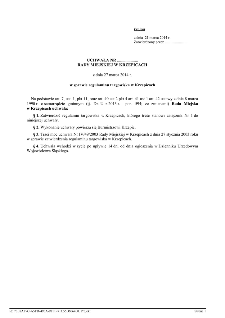 Projekt z dnia 21 marca 2014 r. Zatwierdzony przez ......................... UCHWAŁA NR .................... RADY MIEJSKIEJ W KRZEPICACH z dnia 27 marca 2014 r. w sprawie regulaminu targowiska w Krzepicach Na podstawie art. 7, ust. 1, pkt 11, oraz art. 40 ust.2 pkt 4 art. 41 ust 1 art. 42 ustawy z dnia 8 marca 1990 r. o samorządzie gminnym (tj. Dz. U. z 2013 r. poz. 594; ze zmianami) Rada Miejska w Krzepicach uchwala: § 1. Zatwierdzić regulamin targowiska w Krzepicach, którego treść stanowi załącznik Nr 1 do niniejszej uchwały. § 2. Wykonanie uchwały powierza się Burmistrzowi Krzepic. § 3. Traci moc uchwała Nr IV/49/2003 Rady Miejskiej w Krzepicach z dnia 27 stycznia 2003 roku w sprawie zatwierdzenia regulaminu targowiska w Krzepicach. § 4. Uchwała wchodzi w życie po upływie 14 dni od dnia ogłoszenia w Dzienniku Urzędowym Województwa Śląskiego. Id: 73E8AF9C-A5FD-493A-9FFF-71C55B606400. Projekt Strona 1 Załącznik Nr 1 do Uchwały Nr .................... Rady Miejskiej w Krzepicach z dnia 27 marca 2014 r. REGULAMIN TARGOWISKA W KRZEPICACH Rozdział 1. Przepisy ogólne § 1. 1. Targowisko miejskie zwane dalej „targowiskiem” jest własnością Gminy Krzepice. 2. Targowiskiem zarządza Zakład Działalności Komunalnej i Mieszkaniowej w Krzepicach, z siedzibą przy ulicy Targowej 19, zwany dalej „zarządzającym”. 3. Nadzór nad prowadzeniem targowiska sprawuje Burmistrz Krzepic. 4. Targowisko w Krzepicach przy ulicy Targowej czynne jest w każdy czwartek miesiąca w godz. 5.00 do 13.00 i obejmuje teren ogrodzony z wyznaczonymi drogami komunikacyjnymi (dojazdowymi) oraz wydzielonymi miejscami sprzedaży. 5. Targowisko w Krzepicach przy ulicy Solnej czynne jest od poniedziałku do soboty w godzinach 7.00 do 15.00 i obejmuje teren pomiędzy ulicami: Krakowską, a Dzielną. 6. Zezwala się na handel na targowisku przy ul. Targowej w pozostałe dni tygodnia oprócz niedzieli i świąt w godz. 7.00 do 15.00, po uzgodnieniu z zarządzającym targowiskiem. Wszystkich handlujących i we wszystkie dni handlowe obowiązują stawki opłaty jak w dzień targowy tj. w czwartek. § 2. 1. Uprawnionymi do handlowania na targowisku są przedsiębiorcy prowadzący działalność gospodarczą w rozumieniu ustawy – Prawo działalności gospodarczej, rolnicy i inne osoby fizyczne, po uiszczeniu opłaty targowej w wysokości określonej w Uchwale Rady Miejskiej w Krzepicach oraz opłat określonych w Zarządzeniu Burmistrza Krzepic o których mowa w § 10 ust.6 niniejszego regulaminu. § 3. Dopuszcza się na targowisku sprzedaż: a) z budek, straganów, lad itp. b) w ramach handlu okrężnego (obwoźnego, obnośnego) - z ręki, koszy, stoisk, wozów konnych, przyczep, pojazdów samochodowych itp. § 4. 1. Na targowisku mogą być sprzedawane wszystkie towary z wyjątkiem: a) paliw płynnych (nafta, benzyna itp.), b) gazów, c) napojów alkoholowych, d) środkó leczniczych i trucizn, e) papierów wartościowych, f) waluty obcej w postaci banknotów, monet, papierów wartościowych i akcji ( z wyjątkiejm numizmatów), g) kamieni i metali szlachetnych oraz wyrobów z nich wykonanych, h) broni, amunicji, materiałów wybuchowych i artykułów pirotechnicznych w tym petardy, race i inne artykuły w wyniku użycia których następuje wybuch znajdujących się w nich materiałów pirotechnicznych, dających efekt akustyczny i świetlny, Id: 73E8AF9C-A5FD-493A-9FFF-71C55B606400. Projekt Strona 1 i) zwierząt gospodarskich i domowych, j) innych artykułów, których sprzedaż zabroniona jest na podstawie odrębnych przepisów. § 5. 1. Zabrania się na targowisku: a) prowadzenia gier hazardowych, sprzedaży towarów w drodze publicznych losowań i przetargów, b) wystawiania, reklamowania, spożywania napojów alkoholowych, c) zaśmiecania i zanieczyszczania targowiska, d) prowadzenia sprzedaży w miejscach przeznaczonych dla ruchu lub w sposób utrudniający ruch, e) ustawiania samochodów w miejscach nie wyznaczonych do postoju. 2. Zabrania się sprzedaży w handlu obwoźnym następujących środków spożywczych bez opakowań jednostkowych: a) mięsa i przetworów mięsnych oraz podrobów z przetworów podrobowych zwierząt rzeźnych, b) drobiu bitego i przetworów drobiowych oraz podrobów i przetworów podrobowych ze zwierząt rzeźnych, c) ryb i przetworów rybnych, d) tłuszczów zwierzęcych i roślinnych, e) mleka i przetworów mlecznych, f) innych środków spożywczych wymagających zabezpieczenia przed niewłaściwą temperaturą i nasłonecznieniem, 3. Prowadzący sprzedaż ze specjalistycznych środków transportu powinni posiadać decyzję Stacji Sanitarno-Epidemiologicznej wyrażającą zgodę na sprzedaż określonych środków spożywczych określonych w ust. 2. 4. Środki spożywcze wymienione w ust.3 powinny być sprzedawane tylko w opakowaniach jednostkowych, znakowanych zgodnie z odrębnymi przepisami. Rozdział 2. Obowiązki osób prowadzących handel na targowisku § 6. 1. Osoby posiadające rezerwację stałego miejsca zobowiązane są do zajęcia go do godz. 8.00 2. Nie zajęcie zarezerwowanego miejsca w wyżej określonym czasie upoważnia prowadzącego targowisko do wyznaczenia go innej osobie. 3. Miejsce sprzedaży nie może być odstępowane przez osobę, której miejsce to wyznaczono. 4. Bez zgody prowadzącego targowisko zabrania się ustawienia na terenie targowiska jakichkolwiek straganów, kiosków i innych urządzeń. 5. Zaopatrywanie punktów sprzedaży pojazdami samochodowymi może odbywać się do godz. 7.30. 6. Punkty, z których prowadzona jest sprzedaż na targowisku winny być oznaczone tabliczkami informacyjnymi zawierającymi dane: imię i nazwisko osoby dokonującej sprzedaży i numer zaświadczenia działalności gospodarczej lub nazwę firmy i jej siedziby. 7. Osoby prowadzące handel na targowisku obowiązane są uwidocznić ceny na towarach wystawionych do sprzedaży. Id: 73E8AF9C-A5FD-493A-9FFF-71C55B606400. Projekt Strona 2 8. Do waż