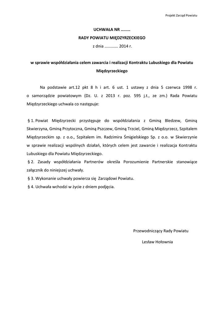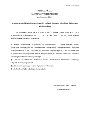Projekt Zarząd Powiatu UCHWAŁA NR ……… RADY POWIATU MIĘDZYRZECKIEGO z dnia …………. 2014 r. w sprawie współdziałania celem zawarcia i realizacji Kontraktu Lubuskiego dla Powiatu Międzyrzeckiego Na podstawie art.12 pkt 8 h i art. 6 ust. 1 ustawy z dnia 5 czerwca 1998 r. o samorządzie powiatowym (Dz. U. z 2013 r. poz. 595 j.t., ze zm.) Rada Powiatu Międzyrzeckiego uchwala co następuje: § 1. Powiat Międzyrzecki przystępuje do współdziałania z Gminą Bledzew, Gminą Skwierzyna, Gminą Przytoczna, Gminą Pszczew, Gminą Trzciel, Gminą Międzyrzecz, Szpitalem Międzyrzeckim sp. z o.o., Szpitalem im. Radzimira Śmigielskiego Sp. z o.o. w Skwierzynie w sprawie realizacji wspólnych działań, których celem jest zawarcie i realizacja Kontraktu Lubuskiego dla Powiatu Międzyrzeckiego. § 2. Zasady współdziałania Partnerów określa Porozumienie Partnerskie stanowiące załącznik do niniejszej uchwały. § 3. Wykonanie uchwały powierza się Zarządowi Powiatu. § 4. Uchwała wchodzi w życie z dniem podjęcia. Przewodniczący Rady Powiatu Lesław Hołownia Projekt Zarząd Powiatu Załącznik do uchwały nr …… Rady Powiatu Międzyrzeckiego z dnia ….. 2014r. POROZUMIENIE PARTNERSKIE zawarte między następującymi stronami: 1. Gminą Międzyrzecz, reprezentowaną przez Burmistrza Międzyrzecza - Pana Tadeusza Dubickiego – zwaną Liderem Porozumienia; 2. Gminą Bledzew, reprezentowaną przez Wójta - Pana Leszka Zimnego - zwaną Partnerem Porozumienia; 3. Gminą Skwierzyna, reprezentowaną przez Burmistrza - Pana Tomasza Watrosa - zwaną Partnerem Porozumienia; 4. Gminą Przytoczna, reprezentowaną przez Wójta - Pana Bartłomieja Kucharyka - zwaną Partnerem Porozumienia; 5. Gmina Pszczew, reprezentowaną przez Wójta - Pana Waldemara Górczyńskiego - zwaną Partnerem Porozumienia; 6. Gminą Trzciel, reprezentowaną przez Burmistrza - Panią Jolantę Górną-Bobrowską - zwaną Partnerem Porozumienia; 7. Powiatem Międzyrzeckim, reprezentowanym przez Wicestarostę Remigiusza Lorenza i Członka Zarządu Zofię Plewę – zwanym Partnerem Porozumienia; 8. Szpitalem Międzyrzeckim Sp. z o. o., reprezentowany przez Prezesa Zarządu Pana Kamila Jakubowskiego - zwanym Partnerem Interesariuszem Porozumienia; 9. Szpitalem im. Radzimira Śmigielskiego Sp. z o. o. w Skwierzynie, reprezentowany przez Prezesa Zarządu Pana Marcina Szulwińskiego - zwanym Partnerem Interesariuszem Porozumienia. Preambuła §1 Strony Porozumienia: - uznając obszar Powiatu Międzyrzeckiego za obszar funkcjonalny, charakteryzujący się wspólnymi uwarunkowaniami i przewidywaniami, jednolitymi celami rozwoju; - kierując się ideą zrównoważonego rozwoju obszaru funkcjonalnego oraz poprawą standardów życia jego mieszkańców; - realizując zadania i cele związane z zacieśnianiem współpracy Stron Porozumienia Projekt Zarząd Powiatu oraz zwiększeniem zaangażowania stron porozumienia w zarządzaniu środkami strukturalnymi UE; - dążąc do efektywnego wykorzystania środków unijnych przez obszary funkcjonalne w ramach realizacji polityki terytorialnej województwa lubuskiego ze środków zewnętrznych; uzgadniają jak poniżej: 2. Strony Porozumienia deklarują wolę współpracy w szczególności w zakresie: 1) promowania partnerskiego modelu współpracy; 2) wzmocnienia powiązań pomiędzy jednostkami samorządu terytorialnego, samorządu powiatowego, jednostek społeczno-gospodarczych; 3) wspólnego diagnozowania problemów i barier rozwojowych dla całego Obszaru; 4) aktywnego współdziałania w opracowywaniu i realizacji projektów finansowanych ze środków Zewnętrznych. 1. Porozumienie jest Cel porozumienia §2 zawiązane celem realizacji przedsięwzięć wynikających z przygotowanej koncepcji Kontraktu Lubuskiego dla Powiatu Międzyrzeckiego: Zintegrowany program zagospodarowania walorów przyrodniczych Powiatu Międzyrzeckiego na cele turystyczne; Kompleksowe uzbrojenie terenów inwestycyjnych w Powiecie Międzyrzeckim; Zintegrowany projekt poprawy jakości kształcenia i jego dostosowania do potrzeb rynku lokalnego Powiatu Międzyrzeckiego; Redukcja niskiej emisji w Powiecie Międzyrzeckim poprzez termomodernizację obiektów publicznych; Dostosowanie placówek opieki medycznej w powiecie międzyrzeckim do trendów demograficznych i epidemiologicznych poprzez rozbudowę i doposażenie oddziałów świadczących usługi medyczne dla dzieci i osób starszych; 2. Realizacja powyższych przedsięwzięć będzie zależna od wybrania projektów złożonych przez Partnerów Porozumienia w trybie konkursowym i zawarcie umowy o dofinansowanie. Role Partnerów §3 1. Partnerzy porozumienia realizują w szczególności następujące zadania: Projekt Zarząd Powiatu 1) Lider Porozumienia: - Koordynuje całość projektu oraz wspiera Partnerów w realizacji powierzonych zadań; 2) Partnerzy Porozumienia: - Na podstawie opracowanej Koncepcji do Kontraktu Lubuskiego negocjują przedsięwzięcia w nim zawarte przed Zarządem Województwa Lubuskiego w części ich dotyczących; - Poszczególni Partnerzy Porozumienia podpisują z Zarządem Województwa Lubuskiego porozumienie dotyczące zasad realizacji Kontraktu Lubuskiego; - Poszczególni Partnerzy Porozumienia odpowiadają za realizację działań planowanych w ramach proponowanych przedsięwzięć na ich terenie. Postanowienia końcowe §4 1. Zmiany w niniejszym Porozumieniu wymagają formy pisemnej pod rygorem nieważności. 2. Porozumienie wygasa w przypadku nie podpisania Kontraktu Lubuskiego z Zarządem Województwa Lubuskiego. Partnerzy porozumienia: Gmina Międzyrzecz: ……………………………………… ………………………………………… Gmina Bledzew: Gmina Skwierzyna: ………………………………………. Gmina Przytoczna: ………………………………………. Gmina Pszczew: ……………………………………….. Gmina Trzciel: ……………………………………
