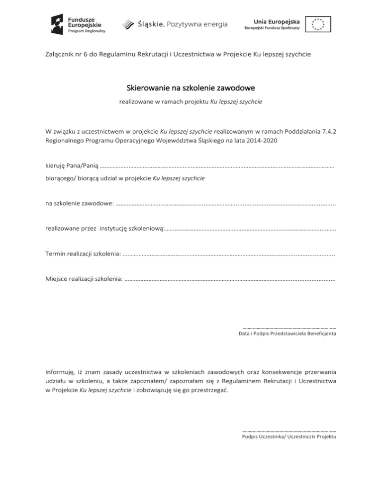 Załącznik nr 6 do Regulaminu Rekrutacji i Uczestnictwa w Projekcie Ku lepszej szychcie Skierowanie na szkolenie zawodowe realizowane w ramach projektu Ku lepszej szychcie W związku z uczestnictwem w projekcie Ku lepszej szychcie realizowanym w ramach Poddziałania 7.4.2 Regionalnego Programu Operacyjnego Województwa Śląskiego na lata 2014-2020 kieruję Pana/Panią ………………………………………………………………………………………………………………………………… biorącego/ biorącą udział w projekcie Ku lepszej szychcie na szkolenie zawodowe: ………………………………………………..………………........................................................... realizowane przez instytucję szkoleniową:………………………………………………………………………………………..…… Termin realizacji szkolenia: …………………………………………………………………………………………….......................... Miejsce realizacji szkolenia: …………………………………………………………………………………………............................ ………………………………………………………..…..… Data i Podpis Przedstawiciela Beneficjenta Informuję, iż znam zasady uczestnictwa w szkoleniach zawodowych oraz konsekwencje przerwania udziału w szkoleniu, a także zapoznałem/ zapoznałam się z Regulaminem Rekrutacji i Uczestnictwa w Projekcie Ku lepszej szychcie i zobowiązuję się go przestrzegać. ………………………………………………………..…..… Podpis Uczestnika/ Uczestniczki Projektu