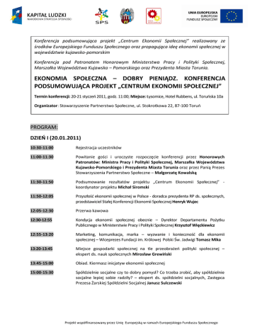 Konferencja podsumowująca projekt „Centrum Ekonomii Społecznej” realizowany ze środków Europejskiego Funduszu Społecznego oraz propagująca ideę ekonomii społecznej w województwie kujawsko-pomorskim Konferencja pod Patronatem Honorowym Ministerstwa Pracy i Polityki Społecznej, Marszałka Województwa Kujawsko – Pomorskiego oraz Prezydenta Miasta Torunia. EKONOMIA SPOŁECZNA – DOBRY PIENIĄDZ. KONFERENCJA PODSUMOWUJĄCA PROJEKT „CENTRUM EKONOMII SPOŁECZNEJ” Termin konferencji: 20-21 styczeo 2011, godz. 11:00; Miejsce: Łysomice, Hotel Rubbens, ul. Toruoska 10a Organizator: Stowarzyszenie Partnerstwo Społeczne, ul. Stokrotkowa 22, 87-100 Toruo PROGRAM: DZIEO I (20.01.2011) 10:30-11:00 Rejestracja uczestników 11:00-11:30 Powitanie gości i uroczyste rozpoczęcie konferencji przez Honorowych Patronatów: Ministra Pracy i Polityki Społecznej, Marszałka Województwa Kujawsko-Pomorskiego i Prezydenta Miasta Torunia oraz przez Panią Prezes Stowarzyszenia Partnerstwo Społeczne – Małgorzatę Kowalską 11:30-11:50 Podsumowanie rezultatów projektu „Centrum Ekonomii Społecznej” koordynator projektu Michał Siromski 11:50-12:05 Przyszłośd ekonomii społecznej w Polsce - doradca prezydenta RP ds. społecznych, przedstawiciel Stałej Konferencji Ekonomii Społecznej Henryk Wujec 12:05-12:30 Przerwa kawowa 12:30-12:55 Kondycja ekonomii społecznej obecnie – Dyrektor Departamentu Pożytku Publicznego w Ministerstwie Pracy i Polityki Społecznej Krzysztof Więckiewicz 12:55-13:20 Marketing, komunikacja, marka – wyzwanie i koniecznośd dla ekonomii społecznej – Wiceprezes Fundacji im. Królowej Polski Św. Jadwigi Tomasz Mika 13:20-13:45 Miejsce gospodarki społecznej na tle przeobrażeo polityki społecznej – ekspert ds. nauk społecznych Mirosław Grewioski 13:45-15:00 Obiad. Kiermasz inicjatyw ekonomii społecznej 15:00-15:30 Spółdzielnie socjalne czy to dobry pomysł? Co trzeba zrobid, aby spółdzielnie socjalne lepiej sobie radziły? – ekspert ds. spółdzielni socjalnych, Zastępca Prezesa Żarskiej Spółdzielni Socjalnej Janusz Sulczewski Projekt współfinansowany przez Unię Europejską w ramach Europejskiego Funduszu Społecznego 15:30-16:00 Perspektywy na rok 2011 dla rozwoju ekonomii społecznej w województwie kujawsko-pomorskim - Dyrektor Regionalnego Ośrodka Polityki społecznej w Toruniu Dorota Wróblewska 16:00-16:30 Przerwa kawowa 16:30-17:00 Kolejny okres programowania dla ekonomii społecznej – ekspert w zakresie ekonomii społecznej, wiceminister pracy w latach 2004-2005, Radca Ministra w Ministerstwie Rozwoju Regionalnego w latach 2006-2009 Cezary Miżejewski 17:00-18:00 Panel dyskusyjny z przedstawicielami ośrodków ekonomii społecznej z województwa kujawsko-pomorskiego – Michał Siromski 19:00 Uroczysta kolacja DZIEO II (21.01.2011) 10:00-10:10 Otwarcie II dnia konferencji 10:10-12:00 Dyskusje panelowe – 3 grupy 1 Czy środki UE pomagają, czy też psują ekonomię społeczną w kontekście spółdzielni socjalnych i NGO? – Krzysztof Więckiewicz 2 Możliwości współpracy ekonomii społecznej, pomocy społecznej i rynku pracy na rzecz osób wykluczonych społecznie – Cezary Miżejewski 3 Wizerunek ekonomii społecznej. Co można zrobid, żeby rozpoznawalnośd ekonomii społecznej była większa? – dziennikarz TVP Bydgoszcz Marek Mikielewicz 12:00-12:30 Podsumowanie konferencji 12:30 Obiad MARSZAŁEK WOJEWÓDZTWA KUJAWSKO-POMORSKIEGO PIOTR CAŁBECKI PREZYDENT MIASTA TORUNIA MICHAŁ ZALESKI Projekt współfinansowany przez Unię Europejską w ramach Europejskiego Funduszu Społecznego