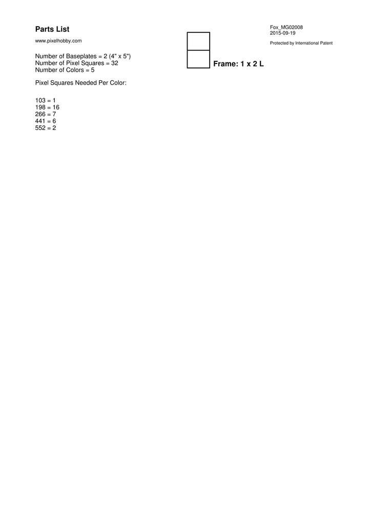 Fox_MG02008 2015-09-19 Parts List www.pixelhobby.com Number of Baseplates = 2 (4" x 5") Number of Pixel Squares = 32 Number of Colors = 5 Pixel Squares Needed Per Color: 103 = 1 198 = 16 266 = 7 441 = 6 552 = 2 Protected by International Patent Frame: 1 x 2 L www.pixelhobby.com Fox_MG02008 2015-09-19 Protected by International Patent Page 1/2 Baseplate 1 Pixelcolor 103 = Pixelcolor 198 = Pixelcolor 266 = Pixelcolor 441 = Baseplate 1 Pixelcolor 552 = Agentstvo Reklamy "Mayak" www.pixelhobby.com Fox_MG02008 2015-09-19 Protected by International Patent Page 2/2 Baseplate 2 Pixelcolor 198 = Pixelcolor 266 = Pixelcolor 441 = Pixelcolor 552 = Agentstvo Reklamy "Mayak"