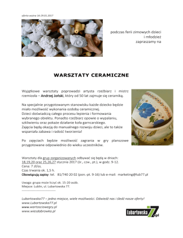 oferta ważna 16-29.01.2017 podczas ferii zimowych dzieci i młodzież zapraszamy na WARSZTATY CERAMICZNE Wyjątkowe warsztaty poprowadzi artysta rzeźbiarz i mistrz rzemiosła – Andrzej Joński, który od 50 lat zajmuje się ceramiką. Na specjalnie przygotowanym stanowisku każde dziecko będzie miało możliwość wykonania ozdoby ceramicznej. Dzieci doświadczą całego procesu lepienia i formowania wybranego obiektu. Ponadto rzeźbiarz opowie o wypalaniu, szkliwieniu oraz pokaże działanie koła garncarskiego. Zajęcia będą okazją do manualnego rozwoju dzieci, ale to także wspaniała zabawa i radość tworzenia! Po zajęciach będzie możliwość zagrania w gry planszowe przygotowane odpowiednio do wieku uczestników. Warsztaty dla grup zorganizowanych odbywać się będą w dniach: 18,19,20 oraz 25,26,27 stycznia 2017 (śr., czw., pt.), w godz. 9-12. Cena: 7 zł/os. Czas trwania ok. 1,5 h. Obowiązują zapisy: tel. 81/740 20 02 (pon.-pt. 9-16) lub e-mail: [email protected] Uwaga: grupa może liczyć ok. 15-20 osób. Miejsce: Lublin, ul. Lubartowska 77. -----------------------------Lubartowska77 – jedno miejsce, wiele możliwości. Odwiedź nas i śledź nasze oferty! www.Lubartowska77.pl www.wartosciowegry.pl www.wiesdabrowka.pl