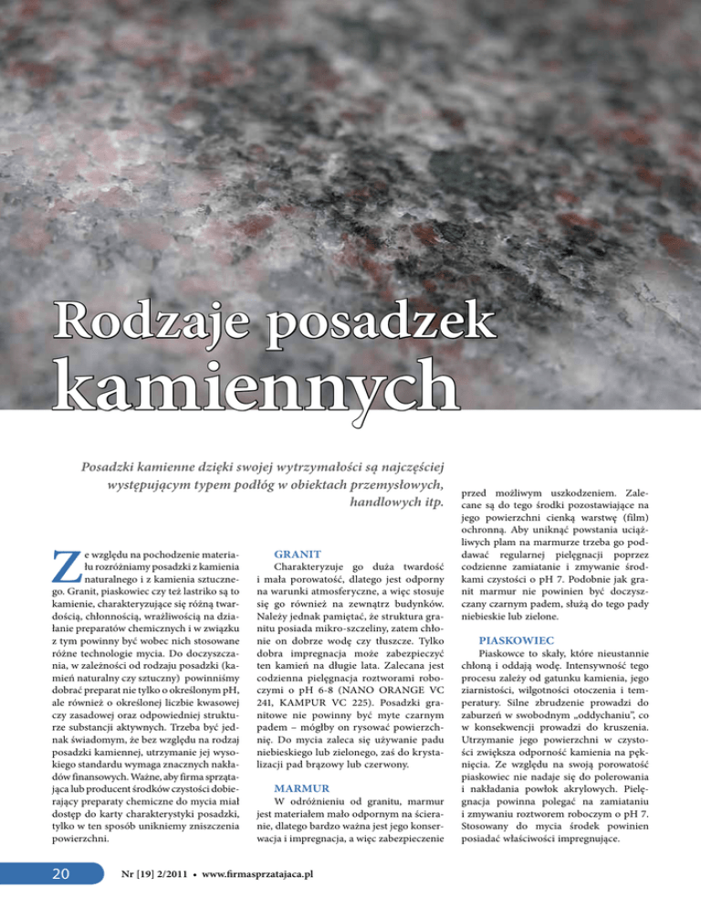 Posadzki kamienne Rodzaje posadzek kamiennych Posadzki kamienne dzięki swojej wytrzymałości są najczęściej występującym typem podłóg w obiektach przemysłowych, handlowych itp. Z e względu na pochodzenie materiału rozróżniamy posadzki z kamienia naturalnego i z kamienia sztucznego. Granit, piaskowiec czy też lastriko są to kamienie, charakteryzujące się różną twardością, chłonnością, wrażliwością na działanie preparatów chemicznych i w związku z tym powinny być wobec nich stosowane różne technologie mycia. Do doczyszczania, w zależności od rodzaju posadzki (kamień naturalny czy sztuczny) powinniśmy dobrać preparat nie tylko o określonym pH, ale również o określonej liczbie kwasowej czy zasadowej oraz odpowiedniej strukturze substancji aktywnych. Trzeba być jednak świadomym, że bez względu na rodzaj posadzki kamiennej, utrzymanie jej wysokiego standardu wymaga znacznych nakładów finansowych. Ważne, aby firma sprzątająca lub producent środków czystości dobierający preparaty chemiczne do mycia miał dostęp do karty charakterystyki posadzki, tylko w ten sposób unikniemy zniszczenia powierzchni. 20 GRANIT Charakteryzuje go duża twardość i mała porowatość, dlatego jest odporny na warunki atmosferyczne, a więc stosuje się go również na zewnątrz budynków. Należy jednak pamiętać, że struktura granitu posiada mikro-szczeliny, zatem chłonie on dobrze wodę czy tłuszcze. Tylko dobra impregnacja może zabezpieczyć ten kamień na długie lata. Zalecana jest codzienna pielęgnacja roztworami roboczymi o pH 6-8 (NANO ORANGE VC 241, KAMPUR VC 225). Posadzki granitowe nie powinny być myte czarnym padem – mógłby on rysować powierzchnię. Do mycia zaleca się używanie padu niebieskiego lub zielonego, zaś do krystalizacji pad brązowy lub czerwony. MARMUR W odróżnieniu od granitu, marmur jest materiałem mało odpornym na ścieranie, dlatego bardzo ważna jest jego konserwacja i impregnacja, a więc zabezpieczenie Nr [19] 2/2011 • www.firmasprzatajaca.pl przed możliwym uszkodzeniem. Zalecane są do tego środki pozostawiające na jego powierzchni cienką warstwę (film) ochronną. Aby uniknąć powstania uciążliwych plam na marmurze trzeba go poddawać regularnej pielęgnacji poprzez codzienne zamiatanie i zmywanie środkami czystości o pH 7. Podobnie jak granit marmur nie powinien być doczyszczany czarnym padem, służą do tego pady niebieskie lub zielone. PIASKOWIEC Piaskowce to skały, które nieustannie chłoną i oddają wodę. Intensywność tego procesu zależy od gatunku kamienia, jego ziarnistości, wilgotności otoczenia i temperatury. Silne zbrudzenie prowadzi do zaburzeń w swobodnym „oddychaniu”, co w konsekwencji prowadzi do kruszenia. Utrzymanie jego powierzchni w czystości zwiększa odporność kamienia na pęknięcia. Ze względu na swoją porowatość piaskowiec nie nadaje się do polerowania i nakładania powłok akrylowych. Pielęgnacja powinna polegać na zamiataniu i zmywaniu roztworem roboczym o pH 7. Stosowany do mycia środek powinien posiadać właściwości impregnujące. Posadzki kamienne WAPIEŃ (TRAWERTYN) Kamienie te w odróżnieniu od marmuru i granitu charakteryzują sie mocno porowatą strukturą. Ze względu na porowatość trawertyny wymagają zabiegów impregnacyjnych, które zabezpieczą jego powierzchnię. Najlepiej więc do mycia stosować preparaty chemiczne, które nie tylko usuną brud ze szczelin, kanalików, ale jednocześnie wypełnią je i na jak najdłużej zabezpieczą otwory przed osadzaniem się zanieczyszczeń. Zabiegi związane z pielęgnacją trawertynu należy regularnie powtarzać. Codzienna pielęgnacja powinna polegać na zamiataniu i myciu roztworem roboczym o pH 7. Do doczyszczania zalecamy stosowanie alkalicznych preparatów (BRUDPUR VC 242). LASTRIKO Jest to wyszlifowana posadzka betonowa, wzmocniona elementami kamienia naturalnego. Jest odporna na ścieranie i wnikanie zabrudzeń. Cement, który stanowi 1/3 zawartości, jest porowaty i wrażliwy na działanie kwasów i tłuszczy. Do mycia zalecamy stosowanie roztworów roboczych o pH 8. Bardzo dobre rezultaty uzyskujemy stosując środki mydlane, na bazie mydeł wapniowych lub magnezowych (KAMPUR VC 225). GRES I KLINKIER Są materiałami wykonanymi z glin i wypalanymi w piecach. Gresy możemy podzielić na porowate (impregnacja) i glaserowane (bez zabezpieczeń). Ich powierzchnie są odporne na związki chemiczne. Pielęgnujemy je poprzez zamiatanie i zmywanie – nie na makro, raczej wilgotno, najlepiej mopem z mikrofazy. Jeśli powierzchnia gresu jest porowata (duże pory) możemy poddać ją procesowi polimeryzacji. Nie zalecamy stosować tej technologii, gdy materiał posiada małe pory. Większość posadzek kamiennych podlega renowacji: Krystalizacja – polega na wcieraniu w powierzchnie marmuru fluorokrzemianu, który w połączeniu z minerałem podstawowym (wapń) tworzy fluorokrzemian wapnia na powierzchni kamienia. Proszkowanie – z zastosowaniem proszków polerskich (cynasz) przeprowadzamy odnowienie zmatowionych płyt. Szlifowanie – dokonujemy ścierania mechanicznego używając odpowiednich segmentów – diament techniczny. Oprac. Szymon Pucher Specjalista ds. Marketingu, PPUH VOIGT sp. z o.o. Nr [19] 2/2011 • www.firmasprzatajaca.pl 21