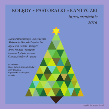 KOLĘDY * PASTORAŁKI * KANTYCZKI instrumentalnie 2016 Dariusz Dobroszczyk - klawisze jazz Aleksandra Skoczek-Zapała - flet Agnieszka Guśtak - skrzypce Anna Huszczo - fortepian Ireneusz Trybulec - lutnia Krzysztof Nieborak - gitara uczniowie: Kasia Kalisz & Wiktoria Gałka* duet gitarowy Krystian Kica - skrzypce, ukulele projekt: Katarzyna Karaś