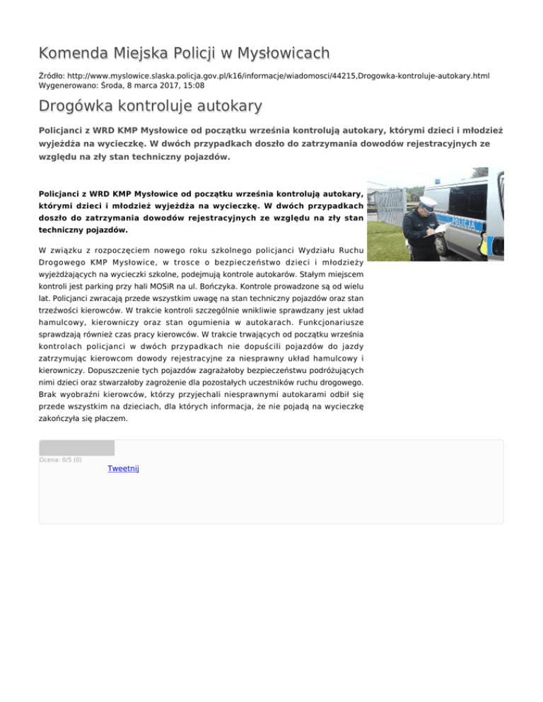 Komenda Miejska Policji w Mysłowicach Źródło: http://www.myslowice.slaska.policja.gov.pl/k16/informacje/wiadomosci/44215,Drogowka-kontroluje-autokary.html Wygenerowano: Środa, 8 marca 2017, 15:08 Drogówka kontroluje autokary Policjanci z WRD KMP Mysłowice od początku września kontrolują autokary, którymi dzieci i młodzież wyjeżdża na wycieczkę. W dwóch przypadkach doszło do zatrzymania dowodów rejestracyjnych ze względu na zły stan techniczny pojazdów. Policjanci z WRD KMP Mysłowice od początku września kontrolują autokary, którymi dzieci i młodzież wyjeżdża na wycieczkę. W dwóch przypadkach doszło do zatrzymania dowodów rejestracyjnych ze względu na zły stan techniczny pojazdów. W związku z rozpoczęciem nowego roku szkolnego policjanci Wydziału Ruchu Drogowego KMP Mysłowice, w trosce o bezpieczeństwo dzieci i młodzieży wyjeżdżających na wycieczki szkolne, podejmują kontrole autokarów. Stałym miejscem kontroli jest parking przy hali MOSiR na ul. Bończyka. Kontrole prowadzone są od wielu lat. Policjanci zwracają przede wszystkim uwagę na stan techniczny pojazdów oraz stan trzeźwości kierowców. W trakcie kontroli szczególnie wnikliwie sprawdzany jest układ hamulcowy, kierowniczy oraz stan ogumienia w autokarach. Funkcjonariusze sprawdzają również czas pracy kierowców. W trakcie trwających od początku września kontrolach policjanci w dwóch przypadkach nie dopuścili pojazdów do jazdy zatrzymując kierowcom dowody rejestracyjne za niesprawny układ hamulcowy i kierowniczy. Dopuszczenie tych pojazdów zagrażałoby bezpieczeństwu podróżujących nimi dzieci oraz stwarzałoby zagrożenie dla pozostałych uczestników ruchu drogowego. Brak wyobraźni kierowców, którzy przyjechali niesprawnymi autokarami odbił się przede wszystkim na dzieciach, dla których informacja, że nie pojadą na wycieczkę zakończyła się płaczem. Ocena: 0/5 (0) Tweetnij