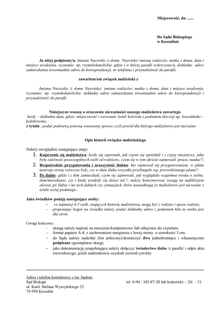 Miejscowość, dn. ...... Do Sądu Biskupiego w Koszalinie Ja niżej podpisany/a, Imiona Nazwisko /z domu Nazwisko/ imiona rodziców, matka z domu, data i miejsce urodzenia, wyznanie: np. rzymskokatolickie, gdzie i w której parafii ochrzczony/a, dokładny adres zamieszkania (ewentualnie adres do korespondencji, nr telefonu) i przynależność do parafii, zawarłem/am związek małżeński z Imiona Nazwisko /z domu Nazwisko/, imiona rodziców, matka z domu, data i miejsce urodzenia, wyznanie: np. rzymskokatolickie, dokładny adres zamieszkania (ewentualnie adres do korespondencji) i przynależność do parafii Niniejszym wnoszę o orzeczenie nieważności naszego małżeństwa zawartego kiedy – dokładna data, gdzie: miejscowość i wezwanie /tytuł/ kościoła z podaniem diecezji np. koszalińsko – kołobrzeska; z tytułu : podać podstawę prawną wnoszonej sprawy czyli powód dla którego małżeństwo jest nieważne Opis historii związku małżeńskiego Należy uwzględnić następujące etapy: 1. Kojarzenie się małżeństwa: kiedy się zapoznali, jak często się spotykali i z czyjej inicjatywy, jaka była zależność poszczególnych osób od rodziców, czym się w tym okresie zajmowali /praca, nauka/?; 2. Bezpośrednie przygotowania i uroczystość ślubna: kto zajmował się przygotowaniem, w jakim nastroju strony wówczas były, czy w dniu ślubu wszystko przebiegało wg. przewidzianego planu?; 3. Po ślubie: gdzie i z kim zamieszkali, czym się zajmowali, jak wyglądała wzajemna troska o siebie, dom/mieszkanie, czy i kiedy urodziły się dzieci itd.?; należy koncentrować uwagę na najbliższym okresie po ślubie i na tych faktach czy sytuacjach, które uzasadniają że małżeństwo jest nieważne z tytułu wyżej podanego . Jako świadków podaję następujące osoby: - co najmniej 4-5 osób, znających historię małżeństwa, mogą być z rodziny i spoza rodziny; - proponując kogoś na świadka należy podać dokładny adres z podaniem kim ta osoba jest dla stron. Uwagi końcowe: - skargę należy napisać na maszynie/komputerowo lub odręcznie ale czytelnie; - format papieru A-4, z zachowaniem marginesu z lewej strony o szerokości 3 cm; - do Sądu należy nadesłać (list polecony)/dostarczyć dwa jednobrzmiące i własnoręcznie podpisane egzemplarze skargi; - jako dokumentację uzupełniająca należy dołączyć świadectwo ślubu /z parafii/ i odpis aktu rozwodowego, jeżeli małżonkowie uzyskali rozwód cywilny Adres i telefon kontaktowy z tut. Sądem: Sąd Biskupi ul. Kard. Stefana Wyszyńskiego 25 75-950 Koszalin tel. 0-94 / 343-87-20 lub końcówki: - 24; - 31.