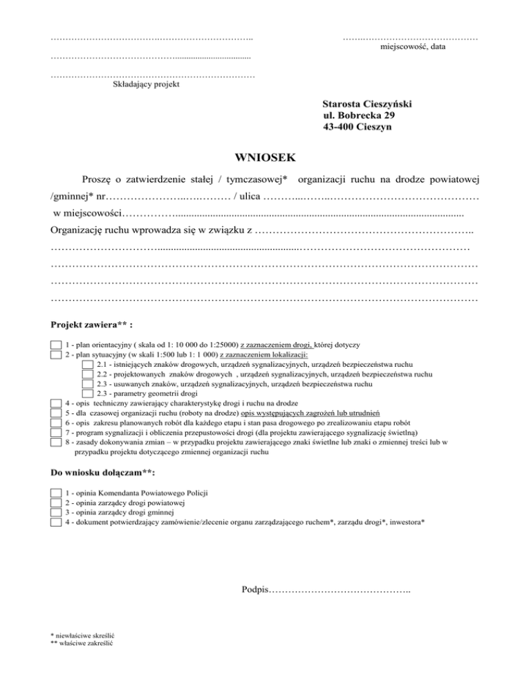 ……………………………….………………………….. …….………………………………… miejscowość, data …………………………………….................................. …………………………………………………………… Składający projekt Starosta Cieszyński ul. Bobrecka 29 43-400 Cieszyn WNIOSEK Proszę o zatwierdzenie stałej / tymczasowej* organizacji ruchu na drodze powiatowej /gminnej* nr…………………..….……… / ulica ………...……..…………………………………… w miejscowości……………............................................................................................................ Organizację ruchu wprowadza się w związku z …………………………………………………….. ………………………….....................................................………………………………………… ………………………………………………………………………………………………………… ………………………………………………………………………………………………………… ………………………………………………………………………………………………………… Projekt zawiera** : 1 - plan orientacyjny ( skala od 1: 10 000 do 1:25000) z zaznaczeniem drogi, której dotyczy 2 - plan sytuacyjny (w skali 1:500 lub 1: 1 000) z zaznaczeniem lokalizacji: 2.1 - istniejących znaków drogowych, urządzeń sygnalizacyjnych, urządzeń bezpieczeństwa ruchu 2.2 - projektowanych znaków drogowych , urządzeń sygnalizacyjnych, urządzeń bezpieczeństwa ruchu 2.3 - usuwanych znaków, urządzeń sygnalizacyjnych, urządzeń bezpieczeństwa ruchu 2.3 - parametry geometrii drogi 4 - opis techniczny zawierający charakterystykę drogi i ruchu na drodze 5 - dla czasowej organizacji ruchu (roboty na drodze) opis występujących zagrożeń lub utrudnień 6 - opis zakresu planowanych robót dla każdego etapu i stan pasa drogowego po zrealizowaniu etapu robót 7 - program sygnalizacji i obliczenia przepustowości drogi (dla projektu zawierającego sygnalizację świetlną) 8 - zasady dokonywania zmian – w przypadku projektu zawierającego znaki świetlne lub znaki o zmiennej treści lub w przypadku projektu dotyczącego zmiennej organizacji ruchu Do wniosku dołączam**: 1 - opinia Komendanta Powiatowego Policji 2 - opinia zarządcy drogi powiatowej 3 - opinia zarządcy drogi gminnej 4 - dokument potwierdzający zamówienie/zlecenie organu zarządzającego ruchem*, zarządu drogi*, inwestora* Podpis…………………………………….. * niewłaściwe skreślić ** właściwe zakreślić POUCZENIE Projekt organizacji ruchu należy złożyć w 2 egzemplarzach Projekt organizacji ruchu powinien zawierać: 1. 2. plan orientacyjny w skali od 1:10 000 do 1:25 000 z zaznaczeniem drogi lub dróg, których projekt dotyczy; plan sytuacyjny w skali 1:500 lub 1:1000 (w uzasadnionych przypadkach organ zarządzający ruchem może dopuścić skalę 1:2000 lub szkic bez skali) zawierający: a. lokalizację istniejących, projektowanych oraz usuwanych znaków drogowych, urządzeń sygnalizacyjnych i urządzeń bezpieczeństwa ruchu; dla projektów zmian stałej organizacji ruchu dopuszcza się zaznaczenie lokalizacji tylko znaków i urządzeń dla nowej organizacji ruchu, b. parametry geometrii drogi; program sygnalizacji i obliczenia przepustowości drogi – w przypadku projektu zawierającego sygnalizację świetlną; zasady dokonywania zmian oraz sposób ich rejestracji – w przypadku projektu zawierającego znaki świetlne lub znaki o zmiennej treści oraz w przypadku projektu dotyczącego zmiennej organizacji ruchu lub zawierającego inne zmienne elementów mające wpływ na ruch drogowy; opis techniczny zawierający charakterystykę drogi i ruchu na drodze, a w przypadku organizacji ruchu związanej z robotami prowadzonymi w pasie drogowym – opis występujących zagrożeń lub utrudnień; przy robotach prowadzonych w dwóch lub więcej etapach opis powinien zawierać zakres planowanych robót dla każdego etapu i stan pasa drogowego po zrealizowaniu etapu robót; przewidywany termin wprowadzenia czasowej organizacji ruchu oraz termin wprowadzenia nowej stałej organizacji ruchu lub przywrócenia poprzedniej stałej organizacji ruchu – w przypadku projektu dotyczącego wykonywania robót na drodze; nazwisko i podpis projektanta. 3. 4. 5. 6. 7. Jeżeli wnioskodawca nie jest organem zarządzającym ruchem, zarządcą drogi bądź inwestorem, do wniosku o zatwierdzenie projektu organizacji ruchem należy dołączyć dokument potwierdzający realizację zamówienia tych jednostek. Do przedstawionego do zatwierdzenia projektu organizacji ruchu powinny być dołączone opinie: 1. 2. 3. komendanta powiatowego Policji – w przypadku projektu obejmującego drogę powiatową zarządu drogi, jeżeli nie jest on jednostką składającą projekt; organu zarządzającego ruchem na drodze krzyżującej się lub objętej objazdem,