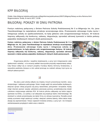KPP BIŁGORAJ Źródło: http://bilgoraj.lubelska.policja.gov.pl/lbg/informacje/aktualnosci/30575,Bilgoraj-Pokazy-w-dniu-Patrona.html Wygenerowano: Środa, 8 marca 2017, 15:08 BIŁGORAJ: POKAZY W DNIU PATRONA Festyn rodzinny połączony z Dniem Patrona Szkoły Podstawowej Nr 5 w Biłgoraju im. Ks. Jana Twardowskiego to największa atrakcja wczorajszego dnia. Promowanie zdrowego trybu życia i integracja szkoły ze społeczeństwem, to były główne cele zorganizowanego festynu. W trakcie imprezy odbywały się konkursy, zabawy, degustacja, sprzedaż zdrowej żywności a także pokazy pojazdów służbowych różnych służb pomocowych. Festyn rodzinny połączony z dniem Patrona Szkoły Podstawowej Nr 5 w Biłgoraju im. Ks. Jana Twardowskiego to największa atrakcja wczorajszego dnia. Promowanie zdrowego trybu życia i integracja szkoły ze społeczeństwem, to były główne cele zorganizowanego festynu. W trakcie imprezy odbywały się konkursy, zabawy, degustacja, sprzedaż zdrowej żywności a także pokazy pojazdów służbowych różnych służb pomocowych. załącznik Organizacja pikniku i wspólne świętowanie, a przy tym integrowanie całej społeczności szkolnej - o to wczoraj zadbali nauczyciele przyrody wspomnianej szkoły. Cały festyn odbył się w ramach projektu Fundacji Banku Ochrony Środowiska, a wszystkie podmioty biorące w nim udział promują na codzień zdrowy tryb życia na różnych płaszczyznach. Na placu pod szkołą odbyła się między innymi prezentacja karetki, wozu strażackiego i radiowozu policyjnego. Dzieci mogły wejść do samochodów służbowych, obejrzeć sprzęt i bliżej przyjrzeć się pracy ratowników, policjantów i strażaków. Każdy mógł również poznać zasady udzielania pierwszej pomocy przedmedycznej dzięki członkom miejscowego oddziału PCK. W trakcie pikniku odbywały się także zajęcia sportowe na Orliku, a w jednej z sal odbywała się projekcja teatru internetowego. Na stoiskach w szkole prezentowały się także firmy ze zdrowa żywnością. Ponadto przed szkołą uczniowie mogli zatańczyć zumbę i obejrzeć szkolne talenty, które także miały okazję się zaprezentować. Festyn zapewnił mnóstwo atrakcji, a przy tym nie mniejsze zainteresowanie przybyłych rodzin wraz z dziećmi. Ocena: 0/5 (0) Tweetnij