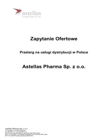 Zapytanie Ofertowe Przetarg na usługi dystrybucji w Polsce Astellas Pharma Sp. z o.o. Astellas Pharma Sp. z o.o. ul. Osmańska 14, 02-823 Warszawa tel.: (22) 545 11 11, fax. (22) 545 11 10 Wpisana do Krajowego Rejestru Sądowego Sądu Rejonowego dla m. st. Warszawy – XIII Wydział Gospodarczy pod numerem KRS 27 928 NIP 113-18-28-467 Kapitał zakładowy 50000 PLN Zachowanie poufności Astellas Pharma Sp. z o.o (“Astellas”) będzie traktować wszelkie informacje dotyczące niniejszego postępowania, przekazane lub ujawnione w jakiejkolwiek formie, jako informacje poufne. Podobnie, Astellas oczekuje, że podmioty, które otrzymają niniejszy dokument, będą traktować wszelkie informacje przekazane lub ujawnione przez Astellas lub omawiane z Astellas, jako informacje poufne i będą stosować się do postanowień podpisanej z Astellas umowy o zachowanie poufności. Cel niniejszego Zapytania Ofertowego („ZO”) Obecny model dystrybucji Astellas Astellas korzysta obecnie z usług pewnej liczby dystrybutorów prowadzących hurtownie, w celu magazynowania i dystrybucji swoich produktów leczniczych do aptek, szpitali i innych grup klientów w Polsce. Dotychczas Astellas sprzedawał swoje produkty lecznicze pewnej liczbie dystrybutorów prowadzących hurtownie w celu dalszej dystrybucji dla głównych grup klientów. Na podstawie modeli sprawdzonych w innych krajach Astellas wyraża przekonanie, że współdziałanie z mniejszą liczbą agentów w miejsce dotychczasowych dystrybutorów, w odniesieniu do wybranych produktów leczniczych przyczyni się do podniesienia poziomu usług na kolejnych szczeblach obrotu i na rzecz pacjentów, zwiększy efektywność działania Astellas i w perspektywie długoterminowej przyniesie istotne korzyści handlowe dla wszystkich stron. Nowy, planowany model dystrybucji Astellas Astellas zamierza zmniejszyć liczbę podmiotów, z którymi współpracuje w związku z dystrybucją na rynku polskim wybranych produktów leczniczych (określonych w dalszej części ZO) („Wybrane Produkty”). Niniejsze Zapytanie Ofertowe jest zaproszeniem skierowanym do potencjalnych kontrahentów do złożenia oferty przetargowej: • • • na prawo do działania w charakterze agenta w odniesieniu do Wybranych Produktów, (Astellas zachowa prawo własności produktów do czasu ich sprzedaży końcowym klientom w Polsce). na świadczenie usług, od przyjęcia zamówienia do inkasa należności, dla klientów w odniesieniu do Wybranych Produktów. na świadczenie usług zarządzania należnościami dotyczących Wybranych Produktów. Celem partnerskiej współpracy z jednym lub większą liczbą agentów na podstawie umów dystrybucyjnych („Nowe Umowy”) jest dla wypracowanie trwałych i obustronnie korzystnych relacji biznesowych. Oczekuje się, że nowy model dystrybucji zapewni Astellas większą wydajność i przejrzystość łańcucha dostaw, a współpracującemu agentowi (agentom) okazję do maksymalnego rozwój własnych usług handlowych. Wybranemu agentowi (agentom) zostanie przedstawiony projekt Nowej Umowy, która określi całość zasad i warunków współpracy, które agent (agenci) stosować będą zamiast własnych zasad i warunków dystrybucji. Astellas Pharma Sp. z o.o. ul. Osmańska 14, 02-823 Warszawa tel.: (22) 545 11 11, fax. (22) 545 11 10 Wpisana do Krajowego Rejestru Sądowego Sądu Rejonowego dla m. st. Warszawy – XIII Wydział Gospodarczy pod numerem KRS 27 928 NIP 113-18-28-467 Kapitał zakładowy 50000 PLN Informacje ogólne o Astellas Astellas Pharma Inc. W wyniku połączenia Yamanouchi i Fujisawa, w 20015r. Astellas Pharma Inc. (“API”) stała się jedną z 20 największych firm farmaceutycznych na świecie, zatrudniającą w skali całego świata 18.000 osób. Głównym celem API jest opracowywanie najnowocześniejszych i najlepszych w swojej klasie produktów w kluczowych obszarach terapeutycznych, takich jak: transplantologia, urologia, dermatologia i środki przeciwzakaźne. API łączy znakomitą działalność badawczo-rozwojową z dużymi możliwościami w zakresie marketingu i jej udział w światowym rynku farmaceutycznym systematycznie wzrasta. API dąży do zwiększania posiadanych możliwości jako firma farmaceutyczna z bogatym zapleczem badawczym, odrywająca niezwykle ważną rolę w zakresie udostępniania innowacyjnych terapii pacjentom na całym świecie i stale budująca sieci relacji opartych na zaufaniu kontaktów z lekarzami i współpracującymi partnerami. W kwietniu 2008 r. API otworzyła w Deerfield Illinois, w Stanach Zjednoczonych, światowe centrum badawczo-rozwojowe - Astellas Pharma Global Development Inc. (APGD). APGD posiada ponadto placówki w Japonii i Europie. Na całym świecie API posiada 30 dużych projektów w fazie 3. lub w trakcie procedury dopuszczenia do obrotu oraz ponad 50 projektów we wczesnej fazie badań klinicznych. Astellas Europe posiada 20 podmiotów zależnych i 9 biur handlowych w całej Europie, na Bliskim Wschodzie i w Afryce. W Astellas skupiamy się głównie na urologii, immunologii i chorobach zakaźnych, prowadząc prace badawczo rozwojowe w dziedzinie diabetologii/nefrologii, chorób centralnego układu nerwowego / zwalczania bólu i nowotworów. Astellas Pharma Spółka z ograniczoną odpowiedzialnością („Astellas”) Astellas jest polskim podmiotem zależnym API z siedzibą w Warszawie (ul. Osmańska 14, 02-823 Warszawa). Astellas Pharma Sp. z o.o. ul. Osmańska 14, 02-823 Warszawa tel.: (22) 545 11 11, fax. (22) 545 11 10 Wpisana do Krajowego Rejestru Sądowego Sądu Rejonowego dla m. st. Warszawy – XIII Wydział Gospodarczy pod numerem KRS 27 928 NIP 113-18-28-467 Kapitał zakładowy 50000 PLN Postępowanie na podstawie Zapytania Ofertowego Harmonogram Działanie Data publikacji Zapytania Ofertowego: Data/Termin 18 maja 2015 Termin zgłaszania przez potencjalnych kontrahentów zapytań do Astellas o dodatkowe informacje, wskazówki lub wyjaśnienia dotyczące 