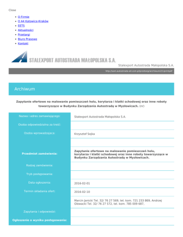 Close O Firmie O A4 Katowice-Kraków EETS Aktualności Przetargi Biuro Prasowe Kontakt Stalexport Autostrada Małopolska S.A. http://sam.autostrada-a4.com.pl/przetargi/archiwum/21/printpdf Archiwum Zapytanie ofertowe na malowanie pomieszczeń holu, korytarza i klatki schodowej oraz inne roboty towarzyszące w Budynku Zarządzania Autostradą w Mysłowicach. (nr) Nazwa i adres zamawiającego: Stalexport Autostrada Małopolska S.A. Osoba odpowiedzialna za treść: Osoba wprowadzajaca: Przedmiot zamówienia: Krzysztof Sojka Zapytanie ofertowe na malowanie pomieszczeń holu, korytarza i klatki schodowej oraz inne roboty towarzyszące w Budynku Zarządzania Autostradą w Mysłowicach. Rodzaj zamówienia: Tryb postępowania: Data ogłoszenia: 2016-02-01 Termin składania ofert: 2016-02-10 Marcin Janicki Tel. 32/ 76 27 569, tel. kom. 721 233 869, Andrzej Głowacki Tel. 32/ 76 27 572, tel. kom. 785 009 687, Zapytania i odpowiedzi: Ogłoszenie o wyniku postępowania: Ogłoszenie o wyniku postępowania: Kategoria: Powiązane pliki [5] Nazwa / Kategoria Data publikacji Rozmiar Pobierz pobierz plik: Zapytanie. pdf pdf Zapytanie.pdf 16-02-01 15:48 308,06K B pdf Zał.1.pdf 16-02-01 15:49 207,6KB pobierz plik: Zał.1.pdf pdf Zał.2.pdf 16-02-01 15:50 167,45K B pobierz plik: Zał.2.pdf 135,4KB pobierz plik: Zał.3 przedmiar. pdf 216,16K B pobierz plik: Zał Nr 4 (umowa).p df pdf pdf Zał.3 - przedmiar.pdf Zał Nr 4 (umowa).pdf 16-02-01 15:51 16-02-01 15:52
