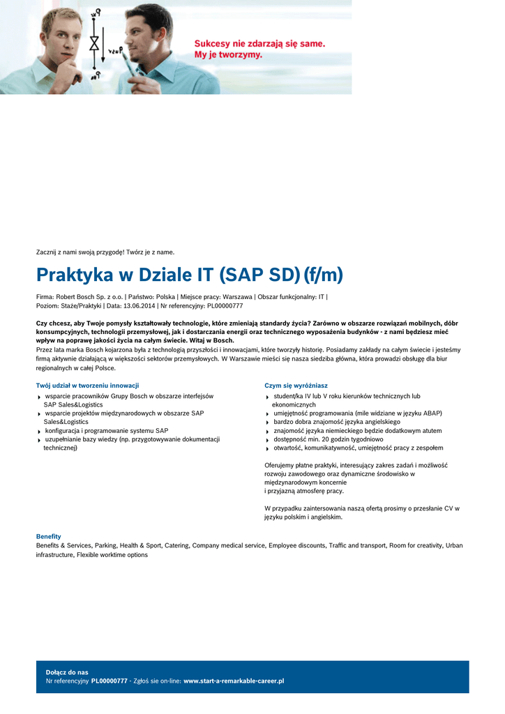 Zacznij z nami swoją przygodę! Twórz je z name. Praktyka w Dziale IT (SAP SD) (f/m) Firma: Robert Bosch Sp. z o.o. | Państwo: Polska | Miejsce pracy: Warszawa | Obszar funkcjonalny: IT | Poziom: Staże/Praktyki | Data: 13.06.2014 | Nr referencyjny: PL00000777 Czy chcesz, aby Twoje pomysły kształtowały technologie, które zmieniają standardy życia? Zarówno w obszarze rozwiązań mobilnych, dóbr konsumpcyjnych, technologii przemysłowej, jak i dostarczania energii oraz technicznego wyposażenia budynków - z nami będziesz mieć wpływ na poprawę jakości życia na całym świecie. Witaj w Bosch. Przez lata marka Bosch kojarzona była z technologią przyszłości i innowacjami, które tworzyły historię. Posiadamy zakłady na całym świecie i jesteśmy firmą aktywnie działającą w większości sektorów przemysłowych. W Warszawie mieści się nasza siedziba główna, która prowadzi obsługę dla biur regionalnych w całej Polsce. Twój udział w tworzeniu innowacji wsparcie pracowników Grupy Bosch w obszarze interfejsów SAP Sales&Logistics wsparcie projektów międzynarodowych w obszarze SAP Sales&Logistics konfiguracja i programowanie systemu SAP uzupełnianie bazy wiedzy (np. przygotowywanie dokumentacji technicznej) Czym się wyróżniasz student/ka IV lub V roku kierunków technicznych lub ekonomicznych umięjętność programowania (mile widziane w języku ABAP) bardzo dobra znajomość języka angielskiego znajomość języka niemieckiego będzie dodatkowym atutem dostępność min. 20 godzin tygodniowo otwartość, komunikatywność, umiejętność pracy z zespołem Oferujemy płatne praktyki, interesujący zakres zadań i możliwość rozwoju zawodowego oraz dynamiczne środowisko w międzynarodowym koncernie i przyjazną atmosferę pracy. W przypadku zaintersowania naszą ofertą prosimy o przesłanie CV w języku polskim i angielskim. Benefity Benefits & Services, Parking, Health & Sport, Catering, Company medical service, Employee discounts, Traffic and transport, Room for creativity, Urban infrastructure, Flexible worktime options Dołącz do nas Nr referencyjny PL00000777 - Zgłoś sie on-line: www.start-a-remarkable-career.pl