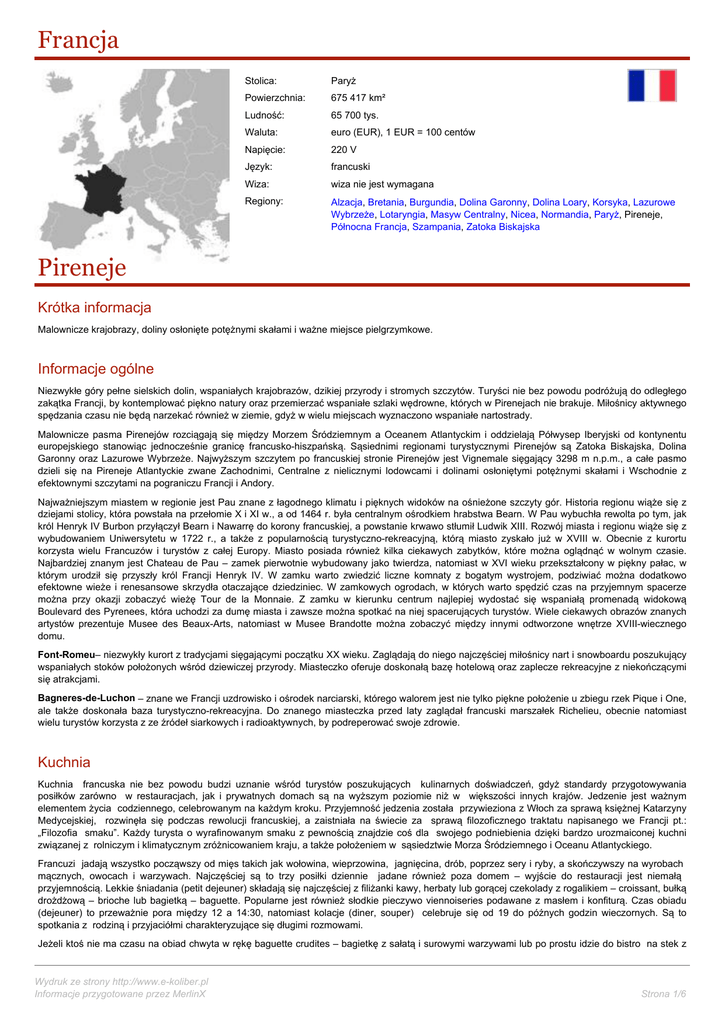 Francja Stolica: Paryż Powierzchnia: 675 417 km² Ludność: 65 700 tys. Waluta: euro (EUR), 1 EUR = 100 centów Napięcie: 220 V Język: francuski Wiza: wiza nie jest wymagana Regiony: Alzacja, Bretania, Burgundia, Dolina Garonny, Dolina Loary, Korsyka, Lazurowe Wybrzeże, Lotaryngia, Masyw Centralny, Nicea, Normandia, Paryż, Pireneje, Północna Francja, Szampania, Zatoka Biskajska Pireneje Krótka informacja Malownicze krajobrazy, doliny osłonięte potężnymi skałami i ważne miejsce pielgrzymkowe. Informacje ogólne Niezwykłe góry pełne sielskich dolin, wspaniałych krajobrazów, dzikiej przyrody i stromych szczytów. Turyści nie bez powodu podróżują do odległego zakątka Francji, by kontemplować piękno natury oraz przemierzać wspaniałe szlaki wędrowne, których w Pirenejach nie brakuje. Miłośnicy aktywnego spędzania czasu nie będą narzekać również w ziemie, gdyż w wielu miejscach wyznaczono wspaniałe nartostrady. Malownicze pasma Pirenejów rozciągają się między Morzem Śródziemnym a Oceanem Atlantyckim i oddzielają Półwysep Iberyjski od kontynentu europejskiego stanowiąc jednocześnie granicę francusko-hiszpańską. Sąsiednimi regionami turystycznymi Pirenejów są Zatoka Biskajska, Dolina Garonny oraz Lazurowe Wybrzeże. Najwyższym szczytem po francuskiej stronie Pirenejów jest Vignemale sięgający 3298 m n.p.m., a całe pasmo dzieli się na Pireneje Atlantyckie zwane Zachodnimi, Centralne z nielicznymi lodowcami i dolinami osłoniętymi potężnymi skałami i Wschodnie z efektownymi szczytami na pograniczu Francji i Andory. Najważniejszym miastem w regionie jest Pau znane z łagodnego klimatu i pięknych widoków na ośnieżone szczyty gór. Historia regionu wiąże się z dziejami stolicy, która powstała na przełomie X i XI w., a od 1464 r. była centralnym ośrodkiem hrabstwa Bearn. W Pau wybuchła rewolta po tym, jak król Henryk IV Burbon przyłączył Bearn i Nawarrę do korony francuskiej, a powstanie krwawo stłumił Ludwik XIII. Rozwój miasta i regionu wiąże się z wybudowaniem Uniwersytetu w 1722 r., a także z popularnością turystyczno-rekreacyjną, którą miasto zyskało już w XVIII w. Obecnie z kurortu korzysta wielu Francuzów i turystów z całej Europy. Miasto posiada również kilka ciekawych zabytków, które można oglądnąć w wolnym czasie. Najbardziej znanym jest Chateau de Pau – zamek pierwotnie wybudowany jako twierdza, natomiast w XVI wieku przekształcony w piękny pałac, w którym urodził się przyszły król Francji Henryk IV. W zamku warto zwiedzić liczne komnaty z bogatym wystrojem, podziwiać można dodatkowo efektowne wieże i renesansowe skrzydła otaczające dziedziniec. W zamkowych ogrodach, w których warto spędzić czas na przyjemnym spacerze można przy okazji zobaczyć wieżę Tour de la Monnaie. Z zamku w kierunku centrum najlepiej wydostać się wspaniałą promenadą widokową Boulevard des Pyrenees, która uchodzi za dumę miasta i zawsze można spotkać na niej spacerujących turystów. Wiele ciekawych obrazów znanych artystów prezentuje Musee des Beaux-Arts, natomiast w Musee Brandotte można zobaczyć między innymi odtworzone wnętrze XVIII-wiecznego domu. Font-Romeu– niezwykły kurort z tradycjami sięgającymi początku XX wieku. Zaglądają do niego najczęściej miłośnicy nart i snowboardu poszukujący wspaniałych stoków położonych wśród dziewiczej przyrody. Miasteczko oferuje doskonałą bazę hotelową oraz zaplecze rekreacyjne z niekończącymi się atrakcjami. Bagneres-de-Luchon – znane we Francji uzdrowisko i ośrodek narciarski, którego walorem jest nie tylko piękne położenie u zbiegu rzek Pique i One, ale także doskonała baza turystyczno-rekreacyjna. Do znanego miasteczka przed laty zaglądał francuski marszałek Richelieu, obecnie natomiast wielu turystów korzysta z ze źródeł siarkowych i radioaktywnych, by podreperować swoje zdrowie. Kuchnia Kuchnia francuska nie bez powodu budzi uznanie wśród turystów poszukujących kulinarnych doświadczeń, gdyż standardy przygotowywania posiłków zarówno w restauracjach, jak i prywatnych domach są na wyższym poziomie niż w większości innych krajów. Jedzenie jest ważnym elementem życia codziennego, celebrowanym na każdym kroku. Przyjemność jedzenia została przywieziona z Włoch za sprawą księżnej Katarzyny Medycejskiej, rozwinęła się podczas rewolucji francuskiej, a zaistniała na świecie za sprawą filozoficznego traktatu napisanego we Francji pt.: „Filozofia smaku”. Każdy turysta o wyrafinowanym smaku z pewnością znajdzie coś dla swojego podniebienia dzięki bardzo urozmaiconej kuchni związanej z rolniczym i klimatycznym zróżnicowaniem kraju, a także położeniem w sąsiedztwie Morza Śródziemnego i Oceanu Atlantyckiego. Francuzi jadają wszystko począwszy od mięs takich jak wołowina, wieprzowina, jagnięcina, drób, poprzez sery i ryby, a skończywszy na wyrobach mącznych, owocach i warzywach. Najczęściej są to trzy posiłki dziennie jadane również poza domem – wyjście do restauracji jest niemałą przyjemnością. Lekkie śniadania (petit dejeuner) składają się najczęściej z filiżanki kawy, herbaty lub gorącej czekolady z rogalikiem – croissant, bułką drożdżową – brioche lub bagietką – baguette. Popularne jest również słodkie pieczywo viennoiseries podawane z masłem i konfiturą. Czas obiadu (dejeuner) to przeważnie pora między 12 a 14:30, natomiast kolacje (diner, souper) celebruje się od 19 do późnych godzin wieczornych. Są to spotkania z rodziną i przyjaciółmi charakteryzujące się długimi rozmowami. Jeżeli ktoś nie ma czasu na obiad chwyta w rękę baguette crudites – bagietkę z sałatą i surowymi warzywami lub po prostu idzie do bistro na stek z Wydruk ze strony http://www.e-koliber.pl Informacje przygotowane przez MerlinX Strona 1/6 frytkami. Turyści próbujący kupić pieczywo przekonają się, że wy