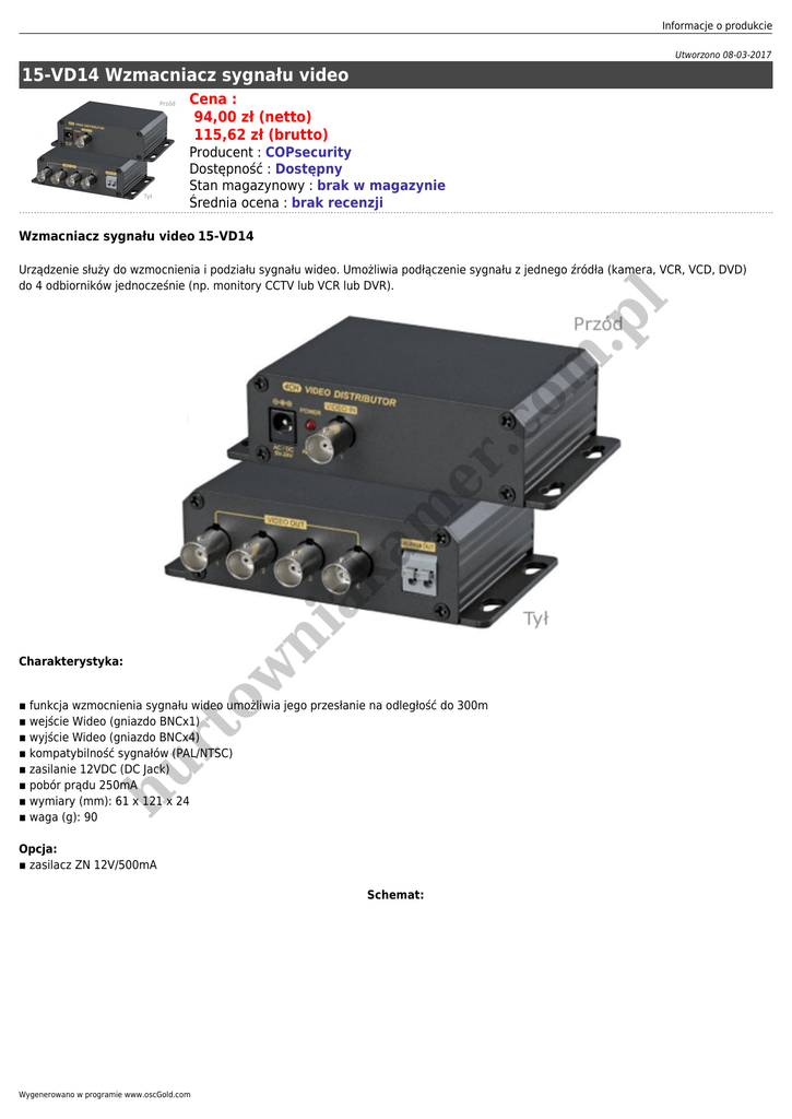 Informacje o produkcie Utworzono 08-03-2017 15-VD14 Wzmacniacz sygnału video Cena : 94,00 zł (netto) 115,62 zł (brutto) Producent : COPsecurity Dostępność : Dostępny Stan magazynowy : brak w magazynie Średnia ocena : brak recenzji Wzmacniacz sygnału video 15-VD14 ni ak am er .c om .p l Urządzenie służy do wzmocnienia i podziału sygnału wideo. Umożliwia podłączenie sygnału z jednego źródła (kamera, VCR, VCD, DVD) do 4 odbiorników jednocześnie (np. monitory CCTV lub VCR lub DVR). ow Charakterystyka: hu rt ▪ funkcja wzmocnienia sygnału wideo umożliwia jego przesłanie na odległość do 300m ▪ wejście Wideo (gniazdo BNCx1) ▪ wyjście Wideo (gniazdo BNCx4) ▪ kompatybilność sygnałów (PAL/NTSC) ▪ zasilanie 12VDC (DC Jack) ▪ pobór prądu 250mA ▪ wymiary (mm): 61 x 121 x 24 ▪ waga (g): 90 Opcja: ▪ zasilacz ZN 12V/500mA Schemat: Wygenerowano w programie www.oscGold.com .p l er .c om ni ak am ow rt hu
