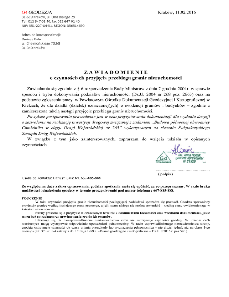 G4 GEODEZJA Kraków, 11.02.2016 31-619 Kraków, ul. Orła Białego 29 Tel. 012 647 01 40, fax 012 647 01 40 NIP: 551-227-84-51, REGON: 356514690 Adres do korespondencji: Dariusz Gala ul. Chełmońskiego 70d/8 31-340 Kraków ZAWIADOMIENIE o czynnościach przyjęcia przebiegu granic nieruchomości Zawiadamia się zgodnie z § 6 rozporządzenia Rady Ministrów z dnia 7 grudnia 2004r. w sprawie sposobu i trybu dokonywania podziałów nieruchomości (Dz.U. 2004 nr 268 poz. 2663) oraz na podstawie zgłoszenia pracy w Powiatowym Ośrodku Dokumentacji Geodezyjnej i Kartograficznej w Kielcach, że dla działki (działek) oznaczonej(ych) w ewidencji gruntów i budynków – zgodnie z zamieszczoną tabelą nastąpi przyjęcie przebiegu granic nieruchomości. Powyższe postępowanie prowadzone jest w celu przygotowania dokumentacji dla wydania decyzji o zezwoleniu na realizację inwestycji drogowej związanej z zadaniem „Budowa północnej obwodnicy Chmielnika w ciągu Drogi Wojewódzkiej nr 765” wykonywanym na zlecenie Świętokrzyskiego Zarządu Dróg Wojewódzkich. W związku z tym jako zainteresowanych, zapraszam do wzięcia udziału w opisanych czynnościach. ............................................... ( podpis ) Osoba do kontaktu: Dariusz Gala: tel. 667-885-888 Ze względu na duży zakres opracowania, godzina spotkania może się opóźnić, za co przepraszamy. W razie braku możliwości odnalezienia geodety w terenie proszę dzwonić pod numer telefonu : 667-885-888. POUCZENIE W toku czynności przyjęcia granic nieruchomości podlegającej podziałowi sporządza się protokół. Geodeta uprawniony przyjmuje granice według istniejącego stanu prawnego, a jeśli stanu takiego nie można stwierdzić – według stanu uwidocznionego w katastrze nieruchomości. Strony proszone są o przybycie w oznaczonym terminie z dokumentami tożsamości oraz wszelkimi dokumentami, jakie mogą być potrzebne przy przyjmowaniu granic ich gruntów. Informuje się, że nieusprawiedliwione niestawiennictwo stron nie wstrzymuje czynności geodety. W imieniu osób nieobecnych mogą występować odpowiednio upoważnieni pełnomocnicy. W razie usprawiedliwionego niestawiennictwa strony, geodeta wstrzymuje czynności do czasu ustania przeszkody lub wyznaczenia pełnomocnika – nie dłużej jednak niż na okres 1-go miesiąca (art. 32 ust. 1-4 ustawy z dn. 17 maja 1989 r. – Prawo geodezyjne i kartograficzne – Dz.U. z 2015 r. poz 520.) Województwo świętokrzyskie, powiat kielecki, gmina Chmielnik obszar wiejski Jednostka ewidencyjna Chmielnik obszar wiejski, obręb 0019 Suchowola Oznaczenie Księgi Wieczystej (inne dokumenty) Właściciel - Nazwa Spotkanie - Data Spotkanie - Godzina Spotkanie Miejsce Spotkanie szczegóły Działka AN 106/96 ZM 25/96 RAFAŁ GABRIEL PAKOSIŃSKI 08.03.2016 9:05 na działce przedmiotowej od strony południowej miasta Chmielnik 293 KI1B/00060749/7; JOANNA STANISŁAWA WCISŁO 08.03.2016 r. 9:05 na działce przedmiotowej od strony wsi Lubania 307/3 AN 613/2011, PS 695/12 JULITA STEFANIA WCISŁO KI1B/00059871/1 ANETTA ELŻBIETA ANGIELSKA 08.03.2016 r. 9:15 na działce przedmiotowej od strony południowej miasta Chmielnik 294 AN 7543/00 TOMASZ MICHAŁ WÓJCIK 08.03.2016 r. 9:15 na działce przedmiotowej od strony południowej miasta Chmielnik 295 od strony południowej miasta Chmielnik 296 JUSTYNA JÓZEFA WÓJCIK PS 728/91,40/01 GRAŻYNA HALINA SKIBA 08.03.2016 r. 9:20 na działce przedmiotowej KW 12888 SŁAWOMIR KWIEK 08.03.2016 r. 9:35 na działce przedmiotowej 297 STANISŁAW JUSZCZAK 08.03.2016 r. 9:45 na działce przedmiotowej 298 ZDZISŁAW HANSZKE 08.03.2016 r. 10:00 na działce przedmiotowej 299 08.03.2016 r. 10:15 na działce przedmiotowej 300 08.03.2016 r. 10:25 na działce przedmiotowej 301 KI1B/00009948/7 WANDA MAŁGORZATA HANSZKE KI1B/00056489/5 PAWEŁ URBAŃCZYK AN 969/2011 BRONISŁAW URBAŃCZYK WANDA URBAŃCZYK KW 38395 WITOLD HANSZKE AN 69/2006 ALINA HANSZKE D IG.IV.7723-7-10/08 GMINA CHMIELNIK 08.03.2016 r. 9:20 na działce przedmiotowej od strony wschodniej -wsi Lubania 285 KI1B/00008878/8 AN 10950/2011 ANNA STRADOMSKA 08.03.2016 r. 10:55 na działce przedmiotowej od strony drogi 292 KI1B/00051539/6 JERZY ANTONI SIRUGA 08.03.2016 r. 10:55 na działce przedmiotowej od strony drogi 291 KW 52126 KRZYSZTOF KOZAK 08.03.2016 r. 10:55 na działce przedmiotowej od strony drogi 290 AN 7396/94 REGINA KUDŁA 08.03.2016 r. 10:55 na działce przedmiotowej 135 PS 365/89 JANUSZ KAŁANDYK 08.03.2016 r. 12:00 na działce przedmiotowej 1/1 Województwo świętokrzyskie, powiat kielecki, gmina Chmielnik obszar wiejski Jednostka ewidencyjna Chmielnik obszar wiejski, obręb 0019 Suchowola Oznaczenie Księgi Wieczystej (inne dokumenty) Właściciel - Nazwa Spotkanie - Data Spotkanie - Godzina Spotkanie Miejsce AN 2324/88 MARIAN WÓJCIK 08.03.2016 r. 12:20 na działce przedmiotowej 310/2 08.03.2016 r. 12:20 na działce przedmiotowej 309 Spotkanie szczegóły Działka DANIELA WÓJCIK KI1B/00051540/6 WACŁAW SIRUGA ZDZISŁAWA SIRUGA KI1B/00008878/8 AN 10950/2011 ANNA STRADOMSKA 08.03.2016 r. 12:20 na działce przedmiotowej 308 KI1B/00062940/0 SKARB PAŃSTWA 08.03.2016 r. 10:35 na działce przedmiotowej 315 08.03.2016 r. 10:35 na działce przedmiotowej 274/2 08.03.2016 r. 13:00 na działce przedmiotowej 401/3 POLSKIE KOLEJE PAŃSTWOWE SPÓŁKA AKCYJNA KI1B/00063915/3 POWIAT KIELECKI POWIATOWY ZARZĄD DRÓG KI1B/00062940/0 SKARB PAŃSTWA POLSKIE KOLEJE PAŃSTWOWE SPÓŁKA AKCYJNA od strony trasy ChmielnikSuchowola KW 328 WŁODZIMIERZ FELIKS ANGIELSKI 08.03.2016 r. 12:40 na działce przedmiotowej KI1B/00062940/0 SKARB PAŃSTWA 08.03.2016 r. 09.03.2016 r 13:10 9:00 na działce przedmiotowej 401/2 POLSKIE KOLEJE PAŃSTWOWE SPÓŁKA AKCYJNA . KI1B/00072942/7 ARTUR WŁODZIMIERZ ANGIELSKI 08.03.2016 r. 13:50 na działce przedmiotowej 391 KW 59292 JANUSZ ANGIELSKI 08.03.2016 r. 14:05 na działce przedmiotowej 416 08.03.2016 r. 14:05 na działce przedmiotowej 417 08.03.2016 r. 13:10 na działce prze