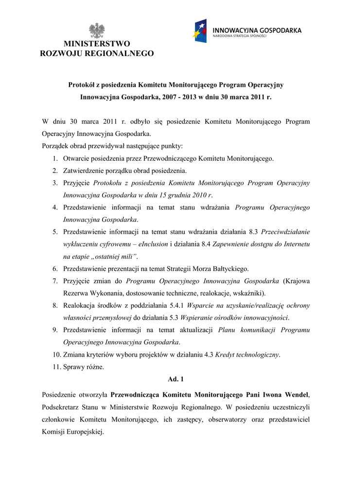 5 MINISTERSTWO ROZWOJU REGIONALNEGO E Protokół z posiedzenia Komitetu Monitorującego Program Operacyjny Innowacyjna Gospodarka, 2007 - 2013 w dniu 30 marca 2011 r. W dniu 30 marca 2011 r. odbyło się posiedzenie Komitetu Monitorującego Program Operacyjny Innowacyjna Gospodarka. Porządek obrad przewidywał następujące punkty: 1. Otwarcie posiedzenia przez Przewodniczącego Komitetu Monitorującego. 2. Zatwierdzenie porządku obrad posiedzenia. 3. Przyjęcie Protokołu z posiedzenia Komitetu Monitorującego Program Operacyjny Innowacyjna Gospodarka w dniu 15 grudnia 2010 r. 4. Przedstawienie informacji na temat stanu wdrażania Programu Operacyjnego Innowacyjna Gospodarka. 5. Przedstawienie informacji na temat stanu wdrażania działania 8.3 Przeciwdziałanie wykluczeniu cyfrowemu – eInclusion i działania 8.4 Zapewnienie dostępu do Internetu na etapie „ostatniej mili”. 6. Przedstawienie prezentacji na temat Strategii Morza Bałtyckiego. 7. Przyjęcie zmian do Programu Operacyjnego Innowacyjna Gospodarka (Krajowa Rezerwa Wykonania, dostosowanie techniczne, realokacje, wskaźniki). 8. Realokacja środków z poddziałania 5.4.1 Wsparcie na uzyskanie/realizację ochrony własności przemysłowej do działania 5.3 Wspieranie ośrodków innowacyjności. 9. Przedstawienie informacji na temat aktualizacji Planu komunikacji Programu Operacyjnego Innowacyjna Gospodarka. 10. Zmiana kryteriów wyboru projektów w działaniu 4.3 Kredyt technologiczny. 11. Sprawy różne. Ad. 1 Posiedzenie otworzyła Przewodnicząca Komitetu Monitorującego Pani Iwona Wendel, Podsekretarz Stanu w Ministerstwie Rozwoju Regionalnego. W posiedzeniu uczestniczyli członkowie Komitetu Monitorującego, ich zastępcy, obserwatorzy oraz przedstawiciel Komisji Europejskiej. Ad. 2 Pani Iwona Wendel powitała wszystkich uczestników spotkania i przedstawiła planowany porządek obrad. Pan Marek Daszkiewicz, przedstawiciel Rady Głównej Instytutów Badawczych, zgłosił propozycję uwzględnienia w porządku obrad kwestii sprawozdawczości w ramach Programu Operacyjnego Innowacyjna Gospodarka. Pani Iwona Wendel włączyła kwestię sprawozdawczości do porządku obrad jako punkt 11. Członkowie Komitetu Monitorującego przyjęli porządek obrad z zaproponowanymi zmianami. Ad. 3 Pani Iwona Wendel poinformowała, że do Protokołu z posiedzenia Komitetu Monitorującego Program Operacyjny Innowacyjna Gospodarka z dnia 15 grudnia 2010 r. została zgłoszona przez Pana Włodzimierza Hausnera, przedstawiciela Naczelnej Organizacji Technicznej, jedna uwaga o charakterze redakcyjnym i została ona uwzględniona w Protokole. Pani Iwona Wendel zaproponowała przyjęcie Protokołu. Uchwała nr 47 Komitetu Monitorującego PO IG w sprawie przyjęcia Protokołu z posiedzenia Komitetu Monitorującego Program Operacyjny Innowacyjna Gospodarka, 2007 – 2013 w dniu 15 grudnia 2010 r. została przyjęta w drodze konsensusu. Uchwała nr 47 Komitetu Monitorującego PO IG stanowi załącznik do Protokołu. Ad. 4 Pani Agnieszka Kręcisz - Borowiec, Zastępca Dyrektora Departamentu Zarządzania Programami Konkurencyjności i Innowacyjności w Ministerstwie Rozwoju Regionalnego, przedstawiła prezentację dotyczącą stanu wdrażania PO IG. Prezentacja została uzupełniona o informacje na temat postępu rzeczowego wdrażania Programu tj. stanu zaawansowania realizacji wskaźników monitorowania PO IG. Pan Włodzimierz Hausner podkreślił, że widoczny jest wyraźny postęp w realizacji Programu. Dodał, że w pierwszym kwartale dokonano prawie miliard płatności i podniósł się poziom wypłaconych beneficjentom środków. Zapytał również, czy w zaliczki wskazane w prezentacji wliczają się w płatności. Pan Kazimierz Bujakowski, przedstawiciel Unii Metropolii Polskich, zapytał ile czasu upływa od momentu certyfikowania wydatków do Komisji Europejskiej do momentu otrzymania refundacji wydatków. Ponadto, podziękował za przedstawienie danych dotyczących podpisanych umów w rozkładzie geograficznym z podziałem na regiony, 2 prosząc o uzupełnienie tych informacji o liczbę i wartość umów zawartych w 12 miastach metropolitalnych. Pani Marzena Chmielewska, przedstawicielka Polskiej Konfederacji Pracodawców Prywatnych Lewiatan, zapytała, na jakim etapie znajduje się projekt indywidualny dotyczący Centralnej Ewidencji i Informacji o Działalności Gospodarczej, którego wdrożenie umożliwi uruchomienie usługi tzw. „jednego okienka”. Pani Marzena Chmielewska zapytała również, jaka konkretnie usługa powstanie w wyniku realizacji kilku projektów, które składają się na system rejestracji i świadczenia usług dla przedsiębiorców oraz czego mogą spodziewać się beneficjenci. Pani Iwona Wendel wyjaśniła, że projekt dotyczący Centralnej Ewidencji i Informacji o Działalności Gospodarczej znajduje się na liście projektów indywidualnych. Umowa została podpisana i projekt jest realizowany. Jednocześnie dodała, że szczegółowa informacja na temat przedmiotowego projektu zostanie pozyskana od beneficjenta, czyli Ministerstwa Gospodarki, skonsultowana z Ministerstwem Spraw Wewnętrznych i Administracji oraz przesłana do członków Komitetu. Pani Agnieszka Kręcisz - Borowiec odnosząc się do pytania dotyczącego zaliczek powiedziała, że część zaliczek wskazanych w prezentacji tj. 4,2 mld zł została już certyfikowana. W odniesieniu do pytania Pana Kazimierza Bujakowskiego zapowiedziała przekazanie członkom Komitetu informacji dotyczących liczby i wartości umów podpisanych w miastach metropolitalnych w formie pisemnej. Pan Sylwester Zając, przedstawiciel Instytucji Certyfikującej, odnośnie do pytania Pana Kazimierza Bujakowskiego o certyfikację zaznaczył, że zgodnie z przepisami, Komisja Europejska w ciągu 2 miesięcy powinna przekazać refundację. W praktyce jednak stara się skracać ten termin. W przypadku ostatnich czterech deklaracji było to od 15 do 44 dni. Pan Marek Przeor
