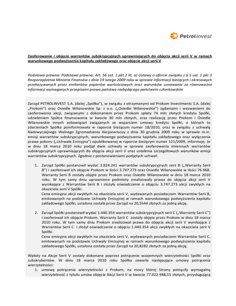 Zaoferowanie i objęcie warrantów subskrypcyjnych uprawniających do objęcia akcji serii V w ramach warunkowego podwyższenia kapitału zakładowego oraz objęcie akcji serii V Podstawa prawna: Podstawa prawna: Art. 56 ust. 1 pkt 2 lit. a) Ustawy o ofercie związku z § 5 ust. 1 pkt 3 Rozporządzenia Ministra Finansów z dnia 19 lutego 2009 roku w sprawie informacji bieżących i okresowych przekazywanych przez emitentów papierów wartościowych oraz warunków uznawania za równoważne informacji wymaganych przepisami prawa państwa niebędącego państwem członkowskim Zarząd PETROLINVEST S.A. (dalej „Spółka”), w związku z otrzymanymi od Prokom Investments S.A. (dalej „Prokom”) oraz Osiedle Wilanowskie Sp. z o.o. („Osiedle Wilanowskie”) żądaniami i wezwaniami do zaoferowania akcji, związanymi z dokonaniem przez Prokom spłaty 74 mln złotych kredytu Spółki, udzieleniem Spółce finansowania w kwocie 30 mln złotych, oraz realizacją przez Prokom i Osiedle Wilanowskie innych zobowiązań związanych ze wsparciem umowy kredytu Spółki, o których to zdarzeniach Spółka poinformowała w raporcie bieżącym numer 18/2010, oraz w związku z uchwałą Nadzwyczajnego Walnego Zgromadzenia Akcjonariuszy z dnia 30 grudnia 2009 roku w sprawie m.in. emisji warrantów subskrypcyjnych, warunkowego podwyższenia kapitału zakładowego oraz wyłączenia prawa poboru („Uchwała Emisyjna”) opublikowanej w raporcie bieżącym numer 121/2009, informuje, że w dniu 18 marca 2010 roku podjął dwie uchwały w sprawie zaoferowania imiennych warrantów subskrypcyjnych uprawniających do objęcia akcji serii V oraz ustalenia szczegółowych warunków emisji warrantów subskrypcyjnych. Zgodnie z postanowieniami podjętych uchwał: 1. Zarząd Spółki postanowił wydać 3.824.241 warrantów subskrypcyjnych serii B („Warranty Serii B”) i zaoferował ich objęcie Prokom w ilości 3.747.273 oraz Osiedle Wilanowskie w ilości 76.968. Warranty Serii B zostały objęte przez Prokom oraz Osiedle Wilanowskie w dniu 18 marca 2010 roku. W tym samy dniu uprawnione podmioty zrealizowały prawa do objęcia akcji serii V wynikające z Warrantów Serii B i złożyły oświadczenie o objęciu 3.747.273 akcji zwykłych na okaziciela serii V Spółki. Cena emisyjna akcji zwykłych na okaziciela serii V, wydawanych posiadaczom Warrantów Serii B, emitowanych na podstawie Uchwały Emisyjnej w ramach warunkowego podwyższenia kapitału zakładowego Spółki, ustalona została przez Zarząd na 20,5544 złotych za jedną akcję. 2. Zarząd Spółki postanowił wydać 1.440.354 warrantów subskrypcyjnych serii C („Warranty Serii C”) i zaoferował ich objęcie Prokom. Warranty Serii C zostały objęte przez Prokom w dniu 18 marca 2010 roku. W tym samy dniu Prokom zrealizował prawa do objęcia akcji serii V wynikające z Warrantów Serii C i złożył oświadczenie o objęciu 1.440.354 akcji zwykłych na okaziciela serii V Spółki. Cena emisyjna akcji zwykłych na okaziciela serii V, wydawanych posiadaczom Warrantów Serii C, emitowanych na podstawie Uchwały Emisyjnej w ramach warunkowego podwyższenia kapitału zakładowego Spółki, ustalona została przez Zarząd na 20,8282 złotych za jedną akcję. Wpłaty na Akcje Serii V zostały dokonane poprzez potrącenie wzajemnych wierzytelności Spółki oraz subskrybentów. W dniu 18 marca 2010 roku Spółka zawarła następujące umowy potrącenia wierzytelności: 1. umowę potrącenia wierzytelności z Prokom, na mocy której Strony potrąciły wymagalną wierzytelność z tytułu umów objęcia Akcji Serii V w kwocie 77.022.948,15 złotych, przysługującą Spółce, z wymagalnymi wierzytelnościami pieniężnymi Prokom wobec Spółki z tytułu przedterminowej spłaty przez Prokom części kredytu udzielonego Spółce, na podstawie umowy kredytu z dnia 21 marca 2007 roku, zawartej z PKO Bank Polski S.A. i Bankiem Gospodarstwa Krajowego oraz z tytułu Umowy o ustanowienie zabezpieczeń kredytu z dnia 14 maja 2009 roku. 2. umowę potrącenia wierzytelności z Osiedle Wilanowskie, na mocy której Strony potrąciły wymagalną wierzytelność z tytułu umów objęcia Akcji Serii V w kwocie 1.582.031,05 złotych, przysługującą Spółce, z wymagalnymi wierzytelnościami pieniężnymi Osiedle Wilanowskie wobec Spółki z tytułu Umowy o ustanowienie zabezpieczeń kredytu z dnia 14 maja 2009 roku. 3. umowę potrącenia wierzytelności z Prokom, na mocy której Strony potrąciły wymagalną wierzytelność z tytułu umowy objęcia Akcji Serii V w kwocie 29.999.981,18 złotych, przysługującą Spółce, z wymagalnymi wierzytelnościami pieniężnymi Prokom wobec Spółki z tytułu wpłaty na rachunek Spółki w dniu 18 marca 2010 roku kwoty 30.000.000,00 złotych, Umowy potrącenia spełniają kryterium umowy znaczącej z uwagi na fakt, że ich łączna wartość (wraz z umową potrącenia zawartą z Prokom w dniu 25 lutego 2010 roku tytułem objęcia 1.313.780 akcji serii V, o wartości 28.726.325,21 złotych) przekracza 10% wartości kapitałów własnych Spółki. Osiedle Wilanowskie Sp. z o.o. jest podmiotem zależnym od Prokom Investments S.A. Umowa zawarta z Prokom przywołana w pkt. 3 powyżej spełnia również kryterium umowy znaczącej ponieważ jej wartość przekracza 10% wartości kapitałów własnych Spółki. W wyniku dokonanego potrącenia cały wkład pieniężny należny Spółce od Prokom oraz Osiedle Wilanowskie tytułem pokrycia objętych przez subskrybentów w łącznej ilości 5.264.595 Akcji Serii V został wniesiony. Zarząd Spółki zwraca uwagę, że zaoferowanie i wydanie Warrantów Serii B i Serii C oraz emisja akcji serii V nie oznacza wykorzystania w całości kapitału warunkowego dostępnego na podstawie Uchwały Emisyjnej, który to kapitał warunkowy Zarząd zamierza wykorzystać na zapewnienie emisji warrantów subskrypcyjnych i akcji dla Europejskiego Banku Odbudowy i Rozwoju oraz innych inwestorów. 18 marca 2010 r.