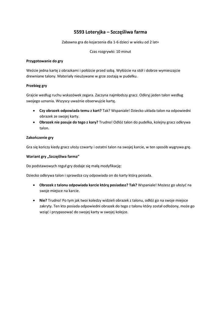 5593 Loteryjka – Szczęśliwa farma Zabawna gra do kojarzenia dla 1-6 dzieci w wieku od 2 lat+ Czas rozgrywki: 10 minut Przygotowanie do gry Weźcie jedna kartę z obrazkami i połóżcie przed sobą. Wyłóżcie na stół i dobrze wymieszajcie drewniane talony. Materiały nieużywane w grze zostają w pudełku. Przebieg gry Grajcie według ruchu wskazówek zegara. Zaczyna najmłodszy gracz. Odkryj jeden talon według swojego uznania. Wszyscy uważnie obserwujcie kartę. Czy obrazek odpowiada temu z kart? Tak? Wspaniale! Dziecko układa talon na odpowiedni obrazek ze swojej karty. Obrazek nie pasuje do tego z kary? Trudno! Odłóż talon do pudełka, kolejny gracz odkrywa talon. Zakończenie gry Gra się kończy kiedy gracz ułoży czwarty i ostatni talon na swojej karcie, w ten sposób wygrywa grę. Wariant gry „Szczęśliwa farma” Do podstawowych reguł gry dodaje się małą modyfikację: Dziecko odkrywa talon i sprawdza czy odpowiada on do karty którą posiada. Obrazek z talonu odpowiada karcie którą posiadasz? Tak? Wspaniale! Możesz go ułożyć na swoje miejsce na karcie. Nie? Trudno! Po tym jak twoi koledzy widzieli obrazek z talonu, odłóż go na swoje miejsce zakryty. Ten kto posiada odpowiedni obrazek do tego z talonu który został odłożony, może go wziąć i przypasować do swojej karty w swojej kolejce.