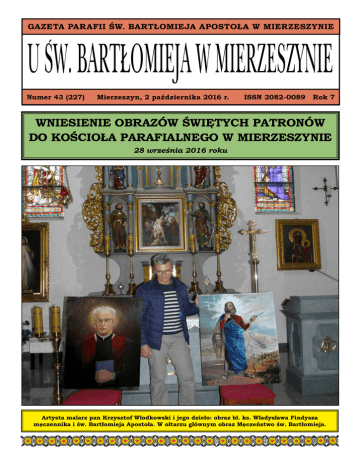 GAZETA PARAFII ŚW. BARTŁOMIEJA APOSTOŁA W MIERZESZYNIE U SW. BARTŁOMIEJA W MIERZESZYNIE ` Numer 43 (227) Mierzeszyn, 2 października 2016 r. ISSN 2082-0089 Rok 7 WNIESIENIE OBRAZÓW ŚWIĘTYCH PATRONÓW DO KOŚCIOŁA PARAFIALNEGO W MIERZESZYNIE 28 września 2016 roku Artysta malarz pan Krzysztof Włodkowski i jego dzieło: obraz bł. ks. Władysława Findysza męczennika i św. Bartłomieja Apostoła. W ołtarzu głównym obraz Męczeństwo św. Bartłomieja. U ŒW. BART£OMIEJA W MIERZESZYNIE - nr 43 (227) 2 2 października 2016 U ŒW. BART£OMIEJA W MIERZESZYNIE - nr 43 (227) 3 2 październik 2016 INTENCJE MSZALNE październik 2016 1. sobota 1500 1800 + rodzice Teresa i Sylwester Budzyńscy 2. niedziela 730 + Mieczysław Fryca: 16. rocznica śmierci 930 dzięk. błag. w intencji Lucyny i Marka Czerwińskich: 3. rocznica sakramentu małżeństwa 1100 + Klemens, Stanisław, Kazimierz, Jarosław; zmarli z rodziny Lellek 3. poniedziałek 1800 + brat Marian Wiciński 4. wtorek 1800 + Jan Kapanke: rocznica śmierci 5. środa 700 + Ewa Cieślik 6. czwartek 1800 + Ewa Cieślik 7. piątek 1800 dzięk. błag. w intencji Bernadety i Kazimierza Kolbusz: 38. rocznica sakramentu małżeństwa 1930 dzięk. błag. w intencji Mariusza Czerwińskiego: 25. rocznica urodzin 8. sobota 1500 ślub: Piotr Korycki i Ewa Piotrzkowska 1800 + rodzice Andrzej i Feliksa Bąk oraz zmarli z rodzin Bąków i Bieleckich 9. niedziela 730 + Helena Mejer, rodzice i rodzeństwo z rodzin Tarczewskich, Guźniczak, Wozińskich 930 + Franciszek Wlazło oraz rodzice i rodzeństwo z obojga stron 10. poniedziałek 11. wtorek 12. środa 13. czwartek 14. piątek 15. sobota 16. niedziela 1100 + Bronisław Falkiewicz oraz Elżbieta i Janusz Wasilewscy 1800 + Władysław Niemykin: rocznica śmierci 1800 + Brygida i Leon Kloskowscy 1800 dzięk. błag. w intencji Justyny i Sławomira Szymczyk: 21. rocznica sakramentu malżeństwa 700 + rodzice Zofia i Antoni Marchewka 1800 + Jerzy Filipski: 1. rocznica śmierci 1800 + Jadwiga Góra oraz mąż Władysław 730 dzięk. błag. w intencji Kazimierza Kąkol: 70. rocznica urodzin 930 + Elżbieta i Jan Dawidowscy 1100 + Adam Langowski 17. poniedziałek 18. wtorek 19. środa 20. czwartek 21. piątek 22. sobota 23. niedziela 1800 + Irena Falkiewicz 700 + Jan, Wiktoria, Mirosław, Zygmunt Fryca 700 + zmarli z rodzin Wohlert, Kolbusz, Szymanowskich 700 + Henryk Plata: rocznica śmierci, zmarli z rodzin Plata i Döring 1800 dzięk. błag. w intencji Ewy i Jacka Szuba: 22. rocznica sakramentu małżeństwa 1800 dzięk. błag. w intencji Grażyny i Józefa Łada: 35. rocznica sakramentu małżeństwa 730 + rodzice Władysława i Marian Bartczak, Helena i Jan Niemykin, mąż Stanisław, synowie Andrzej i Krzysztof, siostry Barbara Niedziałek i Janina Wolańska 930 + Urszula Kolberg: z okazji imienin 1100 + Kazimierz Kucmann: 10. rocznica śmierci 24. poniedziałek 25. wtorek 1800 dzięk. błag. w intencji Cecylii i Adama Groszek: jubileusz 25.rocznicy sakramentu małżeństwa 1800 dzięk. błag. w intencji Katarzyny i Grzegorza Antoniewicz: jubileusz 25. rocznicy sakramentu małżeństwa oraz w intencji dzieci Dominika i Sandry 26. środa 27. czwartek 28. piątek 29. sobota 30. niedziela 31. poniedziałek 1800 + Jan Kluskiewicz: 3. rocznica śmierci 700 + wypominkowa za zmarłych 1800 + Tadeusz Muszyński oraz zmarli z rodzin Muszyńskich i Mocarskich 1800 + Ewa Cieślik 730 + Władysław Jurek, Janusz Jurek i córka Emilia 930 + Jadwiga i Konrad Lewandowscy: rocznica śmierci 1100 + Zygmunt Walkowski i rodzice z obojga stron 1800 + Marianna Pieczykolan: rocznica śmierci oraz syn Kazimierz i mąż Stanisław U ŒW. BART£OMIEJA W MIERZESZYNIE - nr 43 (227) 2 października 2016 4 STRONA INTERNETOWA NASZEJ PARAFII: www.parafia.i3k.pl NUMER KONTA PARAFIALNEGO Parafia św. Bartłomieja Apostoła w Mierzeszynie PL34833500030303243720000001 Kod BIC/SWIFT: GBWCPLPP Bank Spółdzielczy w Pruszczu Gdańskim Oddział Trąbki Wielkie U ŚW. BARTŁOMIEJA W MIERZESZYNIE – Gazeta Parafii św. Bartłomieja Apostoła w Mierzeszynie. Redaktor naczelny: ks. Andrzej Sowiński, zastępca red. naczelnego: Irena Krzemińska, red. techniczny: Franciszek Sowiński. Wydawca: Parafia św. Bartłomieja Apostoła, ul. Wolności 17, 83-041 MIERZESZYN, tel. fax: (0048) 58 682 81 78, e-mail: [email protected] Cena: dobrowolna ofiara, liczymy także na sponsorów gazety.