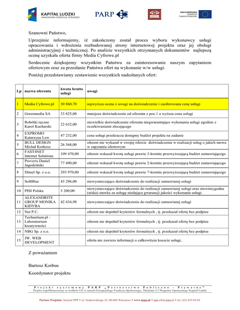 Szanowni Państwo, Uprzejmie informujemy, iż zakończony został proces wyboru wykonawcy usługi opracowania i wdrożenia rozbudowanej strony internetowej projektu oraz jej obsługi administracyjnej i technicznej. Po analizie wszystkich otrzymanych dokumentów najlepszą ocenę uzyskała oferta firmy Media Cyfrowe.pl Serdecznie dziękujemy wszystkim Państwu za zainteresowanie naszym zapytaniem ofertowym oraz za przesłanie Państwa ofert na wykonanie w/w usługi. Poniżej przedstawiamy zestawienie wszystkich nadesłanych ofert: Lp nazwa oferenta kwota brutto usługi uwagi 1 Media Cyfrowe.pl 30 860,70 najwyższa ocena z uwagi na doświadczenie i zaoferowana cenę usługi 2 Greenmedia SA 33 825,00 mniejsze doświadczenie od oferenta z poz.1 a wyższa cena usługi 3 Robótki ręczne Karol Kucharski 22 632,00 niewielkie doświadczenie oferenta niegwarantujące wykonania usługi zgodnie z oczekiwaniami zlecającego 47 232,00 cena usługi przekracza dostępny budżet projektu na zadanie 26 568,00 oferent nie wykazał w swojej ofercie doświadczenia w realizacji usług o jakich mowa w zapytaniu ofertowym 109 470,00 oferent wskazał kwotę usługi prawie 3-krotnie przewyższającą budżet zamawiającego 77 490,00 oferent wskazał kwotę usługi prawie 2-krotnie przewyższającą budżet zamawiającego 4 5 6 7 EXPROMO Katarzyna Lew BULL DESIGN Michał Korkosz FAST4NET Internet Solutions Proveris Daniel Jagodziński 8 Dituel Sp. z o.o. 293 970,00 oferent wskazał kwotę usługi prawie 7-krotnie przewyższającą budżet zamawiającego 9 SoftBlue 43 296,00 niewystarczające doświadczenie do realizacji zamawianej usługi 10 PISI Polska 5 200,00 niewystarczające doświadczenie do realizacji zamawianej usługi oraz niewiarygodna (niska) stawka za usługę niedająca gwarancji jakości wykonania usługi ALEXANDRITE 11 GROUP MONIKA KIDYBA 42 434,98 niewystarczające doświadczenie do realizacji zamawianej usługi 12 Net P.C. oferent nie dopełnił kryteriów formalnych , tj. przekazał ofertę bez podpisu Technetium.pl 13 Laboratorium kreatywności oferent nie dopełnił kryteriów formalnych , tj. przekazał ofertę bez podpisu 14 NBG Sp. z o.o. oferent nie dopełnił kryteriów formalnych , tj. przekazał ofertę bez podpisu 15 JW. WEB DEVELOPMENT oferta nie zawiera informacji o całkowitym koszcie usługi, Z poważaniem Bartosz Korbus Koordynator projektu P r o j e k t s y s t e m o w y P A R P „ P a r t n e r s t w o P u b l i c z n o - P r y w a t n e ” Projekt współfinansowany ze środków UE w ramach Europejskiego Funduszu Społecznego, Działanie 2.1 Programu Operacyjnego Kapitał Ludzki Partner Projektu: Instytut PPP ul. Noakowskiego 24, 00-668 Warszawa www.ippp.pl [email protected] tel. (22) 435-95-02