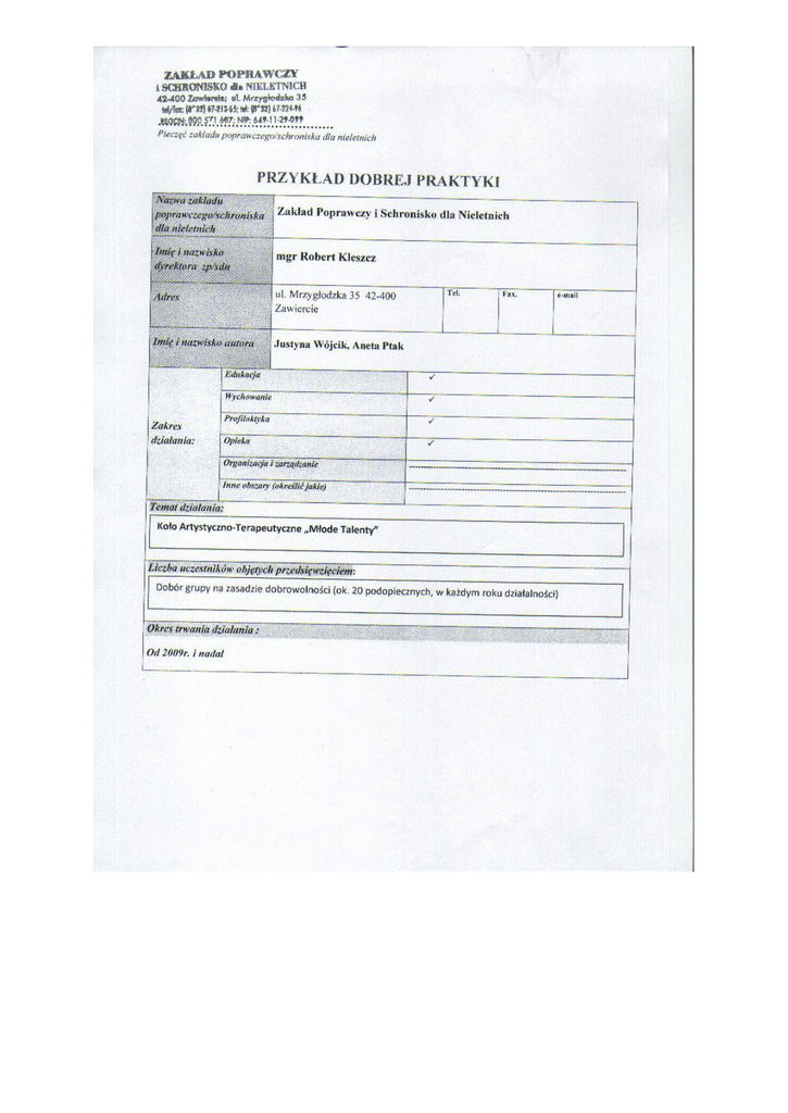 Cele podejmowanych działań: U podstaw programu Koła Artystyczno-Terapeutycznego leży antropocentryczna koncepcja edukacja. Wszelkie podejmowane działania i inicjatywy ukierunkowane są na: - rozwijanie twórczej osobowości wychowanek poprzez wdrażanie do wielostronnej aktywności na rzecz placówki; - poszerzanie wiedzy szkolnej i zainteresowań, wzbogacanie zasobu słowno-pojęciowego przy wykorzystaniu dostępnych źródeł informacji, motywowanie do korzystania ze zbiorów bibliotecznych oraz czytelni szkolnej; - uwrażliwianie na sztukę, kształcenie umiejętności rozpoznawania i wartościowania zjawisk kultury; poszerzanie sfery przeżyć, rozbudzanie wyobraźni; - pobudzanie uczennic do działań artystycznych(rozwijanie zdolności aktorskich, recytatorskich, plastycznych i wrażliwości muzycznej); - wdrażanie do kultury żywego słowa i podnoszenie kompetencji komunikacyjnych; - kultywowanie postaw patriotycznych – propagowanie wiedzy o Polsce, sławnych Polakach, poznawanie kultury regionu, rozwijanie poczucia tożsamości narodowej i szacunku do dziedzictwa narodowego; - integrację ze środowiskiem otwartym poprzez czynne uczestnictwo w imprezach kulturalno - oświatowych, obchodach rocznicowych, akademiach okolicznościowych w placówce i poza nią; - kształtowanie prawidłowych zasad współżycia społecznego i właściwej postawy w relacjach interpersonalnych (tolerancji, życzliwości, empatii, szacunku do innych, samokrytycyzmu, kontroli emocjonalnej) - wzmacnianie poczucia wartości osobistej wychowanek, umiejętności współdziałania w grupie, odpowiedzialności za podjęte działania, rzetelności w pracy. Zwięzły opis realizacji: Dobór treści repertuarowych dotyczy następujących sfer aktywności: Działania twórcze: - interpretacja głosowa i ekspresja sceniczna, „wchodzenie w rolę”, gry dramowe, spektakle profilaktyczne, wieczornice, występy okolicznościowe w placówce i poza nią. - podejmowanie aktywności plastycznej – wykonywanie plakatów, projektów scenografii spektakli, ulotek informacyjnych, materiałów promujących działalność koła. do Działania wychowawcze: - wspólne przygotowywanie – kreowanie uroczystości okolicznościowych integrujących zespół kształtujących prawidłowe relacje interpersonalne. i - stwarzanie podopiecznym warunków umożliwiających rozładowywanie emocji i napięć wewnętrznych poprzez zabawę jako źródło indywidualnych przeżyć. - wspomaganie uczennic w odkrywaniu własnego potencjału i możliwości twórczych. Oddziaływania arteterapeutyczne - kształtowanie inteligencji emocjonalnej poprzez ekspresję sceniczną i aktywność plastyczną. - modyfikowanie sposobu odbioru otaczającej rzeczywistości poprzez dostarczanie pozytywnych przeżyć w kontakcie ze środowiskiem otwartym; kształtowanie otwartej postawy wobec otoczenia, elastyczności w działaniu i tolerancji; wzmacnianie samooceny i poczucia własnej wartości. - realizowanie najważniejszych funkcji arteterapii – stymulującej, rozwijającej, korekcyjnej. FORMY REALIZACJI: - prezentacja spektakli na forum placówki i poza nią, - uczestnictwo w imprezach kulturalno- oświatowych w mieście i regionie ( wyjazdy do kina, teatrów, galerii sztuki, udział w koncertach muzycznych, spotkania z ciekawymi ludźmi). - współpraca ze środowiskiem lokalnym poprzez udział w inicjatywach lokalnych skierowanych do dzieci i młodzieży.- rejestrowanie wydarzeń z działalności koła za pomocą dostępnych środków audiowizualnych i upublicznianie tych materiałów w kwartalniku zakładowym „Azymut”, na gazetkach, podczas uroczystości ogólnozakładowych w formie prezentacji multimedialnych i występów. Uzyskane efekty: I- ciekawa alternatywa dla spędzania wolnego czasu, - przełamanie barier i zahamowań u wychowanek, - podnoszenie poczucia własnej wartości i pozytywne kreowanie własnego wizerunku. - rozładowywanie napięć emocjonalnych poprzez spontaniczne i świadome wyrażanie siebie w relacjach z otoczeniem. - kształtowanie postaw empatii wobec innych osób, nawiązywanie relacji interpersonalnych opartych na syntonii uczuciowej, - prawidłowe funkcjonowanie w grupie w atmosferze pomocy, zrozumienia i wsparcia koleżeńskiego, - poszerzanie zasobu słowno-pojęciowego i wyobraźni abstrakcyjnej, - rozwijanie zdolności samodzielnego wyrażania siebie w komunikatach werbalnych i niewerbalnych., - kształtowanie poczucia odpowiedzialności za podjęte działania. Napotkane problemy: - niskie poczucie własnej wartości u podopiecznych, - nieumiejętność bezkonfliktowego współdziałania w grupie, - brak samodyscypliny i rzetelności w działaniu, - negatywizm szkolny, ograniczony wachlarz własnych zainteresowań, - niski poziom kultury słowa i kompetencji komunikacyjnych. - Wnioski z realizacji i plany na przyszłość: - podtrzymanie wypracowanego modelu i systemu pracy koła, - budowanie atrakcyjnego wizerunku koła, - utrwalanie wzajemnych pozytywnych relacji pomiędzy prowadzącymi a młodzieżą opartych na zaufaniu, szacunku i życzliwości.
