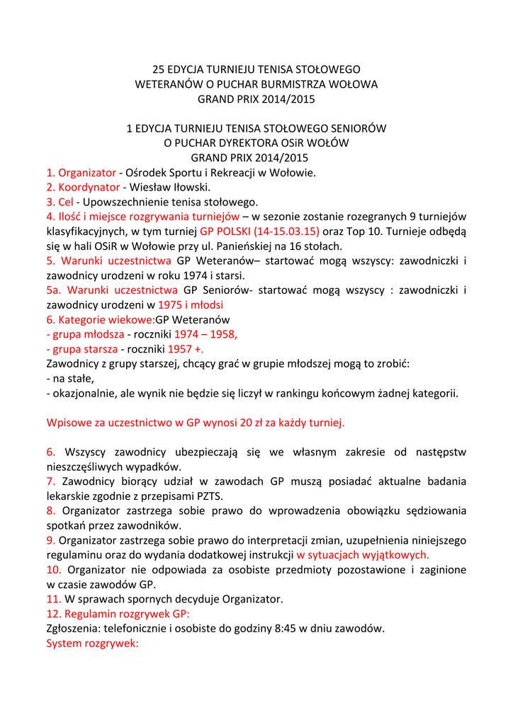 25 EDYCJA TURNIEJU TENISA STOŁOWEGO WETERANÓW O PUCHAR BURMISTRZA WOŁOWA GRAND PRIX 2014/2015 1 EDYCJA TURNIEJU TENISA STOŁOWEGO SENIORÓW O PUCHAR DYREKTORA OSiR WOŁÓW GRAND PRIX 2014/2015 1. Organizator - Ośrodek Sportu i Rekreacji w Wołowie. 2. Koordynator - Wiesław Iłowski. 3. Cel - Upowszechnienie tenisa stołowego. 4. Ilość i miejsce rozgrywania turniejów – w sezonie zostanie rozegranych 9 turniejów klasyfikacyjnych, w tym turniej GP POLSKI (14-15.03.15) oraz Top 10. Turnieje odbędą się w hali OSiR w Wołowie przy ul. Panieńskiej na 16 stołach. 5. Warunki uczestnictwa GP Weteranów– startować mogą wszyscy: zawodniczki i zawodnicy urodzeni w roku 1974 i starsi. 5a. Warunki uczestnictwa GP Seniorów- startować mogą wszyscy : zawodniczki i zawodnicy urodzeni w 1975 i młodsi 6. Kategorie wiekowe:GP Weteranów - grupa młodsza - roczniki 1974 – 1958, - grupa starsza - roczniki 1957 +. Zawodnicy z grupy starszej, chcący grać w grupie młodszej mogą to zrobić: - na stałe, - okazjonalnie, ale wynik nie będzie się liczył w rankingu końcowym żadnej kategorii. Wpisowe za uczestnictwo w GP wynosi 20 zł za każdy turniej. 6. Wszyscy zawodnicy ubezpieczają się we własnym zakresie od następstw nieszczęśliwych wypadków. 7. Zawodnicy biorący udział w zawodach GP muszą posiadać aktualne badania lekarskie zgodnie z przepisami PZTS. 8. Organizator zastrzega sobie prawo do wprowadzenia obowiązku sędziowania spotkań przez zawodników. 9. Organizator zastrzega sobie prawo do interpretacji zmian, uzupełnienia niniejszego regulaminu oraz do wydania dodatkowej instrukcji w sytuacjach wyjątkowych. 10. Organizator nie odpowiada za osobiste przedmioty pozostawione i zaginione w czasie zawodów GP. 11. W sprawach spornych decyduje Organizator. 12. Regulamin rozgrywek GP: Zgłoszenia: telefonicznie i osobiste do godziny 8:45 w dniu zawodów. System rozgrywek: - Wszystkie mecze odbywają się do 3 wygranych setów. - 1. etap: grupy 5 lub 6 osobowe, każdy z każdym. - 2. etap dla mniej niż 48 zawodników - zawodnicy z miejsc 1-3 oraz 4-6 grają pucharowo odpowiednio o wszystkie miejsca, - 2 etap dla więcej niż 48 zawodników – zawodnicy z miejsc 1-2, 3-4, 5-6 grają pucharowo odpowiednio o wszystkie miejsca. 13. Do klasyfikacji końcowej cyklu branych jest pod uwagę 7 najlepszych wyników. Po turniejach od 2 do 4 odrzucany będzie jeden najgorszy wynik, a po turniejach od 5 do 9 dwa najgorsze wyniki. Punktacja: 1/100 pkt, 2/95 pkt, 3/ 91 pkt, 4/88 pkt, 5/87 pkt, 6/86 pkt, 7/85 pkt, 8/84 pkt, 9/83 pkt, 10/82 pkt, itd. Przy równej ilości punktów w klasyfikacji końcowej o kolejności decydują najlepsze lokaty uzyskane w turniejach. Podczas zawodów obowiązują przepisy PZTS. 14. Środki uzyskane z wpisowego przeznaczone zostaną na koszty organizacyjne. 15. Nagrody w turniejach od 1 do 9: - nagrody i dyplomy dla zawodników z miejsc 1 – 3 z każdej grupy, - dyplomy dla zawodników z miejsc 4 – 8. W klasyfikacji końcowej GP Wołowa Weteranów i Seniorów w każdej grupie wiekowej zawodnicy z miejsc 1-3 otrzymają puchary i dyplomy, a z miejsc 4–8 dyplomy. 16. Turnieje TOP 10 odbędą się po zakończeniu GP Weteranów i Seniorów Prawwo startu mają zawodnicy z miejsc 1-9 generalnej klasyfikacji oraz zawodnik zaproszony przez organizatora z każdej grupy wiekowej. Turnieje przeprowadzone będą w jednym terminie, oddzielnie w dwóch grupach wiekowych, systemem każdy z każdym. TOP 10 nagrody: - dla najlepszego zawodnika - STATUETKA-PUCHAR i dyplom, - dla zawodników z miejsc 2 do 10 dyplomy. 17. DANE KONTAKTOWE: - KOORDYNATOR: Wiesław Iłowski, 668 499 246, e-mail: [email protected], - SĘDZIA GŁÓWNY: Marian Żak, 606 838 658, e-mail: [email protected], - OSiR WOŁÓW: 71 389 27 34 e-mail: [email protected]. TERMINY TURNIEJÓW GP TERMINY TURNIEJÓW GP WOŁOWA Weteranów WOŁOWA Seniorów 1. 14.09.14, 2. 12.10.14, 3. 09.11.14, 4. 07.12.14 1. 28.09.14 2. 26.10.14 3. 16.11.14 4. 14.12.14 5. 11.01.15 6. 22.02.15 7. 14-15.03.15 turniej połączony z GP POLSKI, 8. 12.04.15 9. 10.05.15 10. 30.05.15 - TOP 10. 5. 18.01.15 6. 15.02.15 7. 29.03.15 8.19.04.15 9. 17.05.15 10. 30.05.15 TOP 10