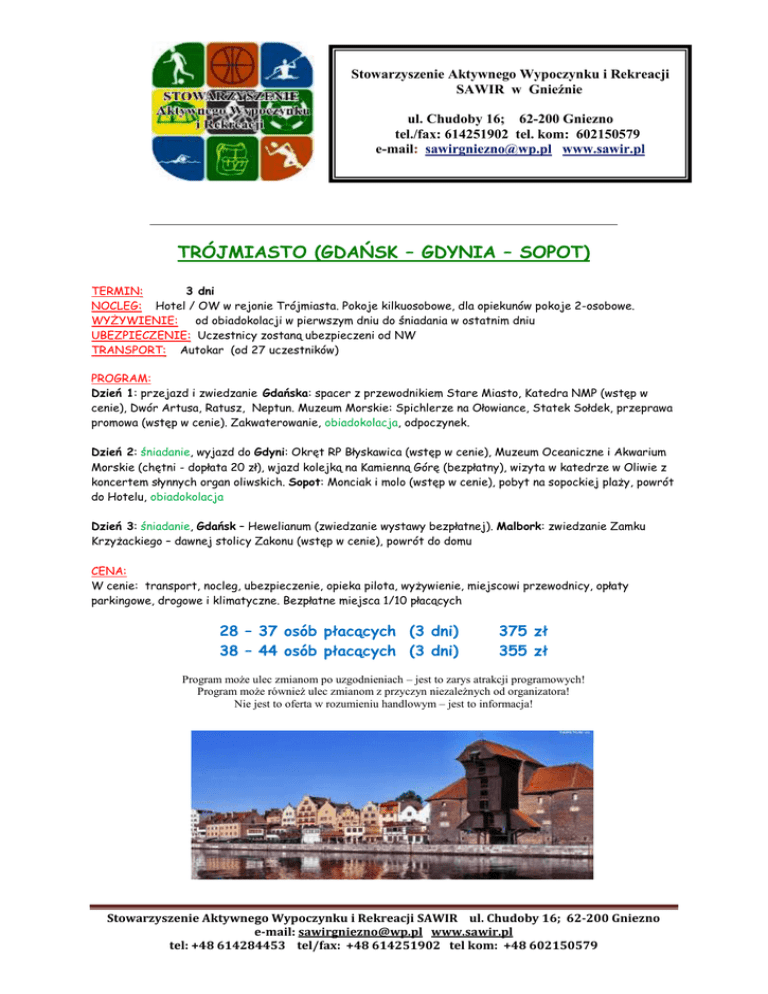 Stowarzyszenie Aktywnego Wypoczynku i Rekreacji SAWIR w Gnieźnie ul. Chudoby 16; 62-200 Gniezno tel./fax: 614251902 tel. kom: 602150579 e-mail: [email protected] www.sawir.pl [Wpisz cytat z dokumentu lub podsumowanie interesującej kwestii. Pole tekstowe można umieścić w dowolnym miejscu w dokumencie. Użyj karty Narzędzia do ryso TRÓJMIASTO (GDAŃSK – GDYNIA – SOPOT) TERMIN:: 3 dni NOCLEG:: Hotel / OW w rejonie Trójmiasta. Pokoje kilkuosobowe, dla opiekunów pokoje 2-osobowe. WYŻYWIENIE: od obiadokolacji w pierwszym dniu do śniadania w ostatnim dniu UBEZPIECZENIE:: Uczestnicy zostaną ubezpieczeni od NW TRANSPORT:: Autokar (od 27 uczestników) PROGRAM: Dzień 1: przejazd i zwiedzanie Gdańska: spacer z przewodnikiem Stare Miasto, Katedra NMP (wstęp w cenie), Dwór Artusa, Ratusz, Neptun. Muzeum Morskie: Spichlerze na Ołowiance, Statek Sołdek, przeprawa promowa (wstęp w cenie). Zakwaterowanie, obiadokolacja, odpoczynek. Dzień 2: śniadanie, wyjazd do Gdyni: Okręt RP Błyskawica (wstęp w cenie), Muzeum Oceaniczne i Akwarium Morskie (chętni - dopłata 20 zł), wjazd kolejką na Kamienną Górę (bezpłatny), wizyta w katedrze w Oliwie z koncertem słynnych organ oliwskich. Sopot: Monciak i molo (wstęp w cenie), pobyt na sopockiej plaży, powrót do Hotelu, obiadokolacja Dzień 3: śniadanie, Gdańsk – Hewelianum (zwiedzanie wystawy bezpłatnej). Malbork: zwiedzanie Zamku Krzyżackiego – dawnej stolicy Zakonu (wstęp w cenie), powrót do domu CENA: W cenie: transport, nocleg, ubezpieczenie, opieka pilota, wyżywienie, miejscowi przewodnicy, opłaty parkingowe, drogowe i klimatyczne. Bezpłatne miejsca 1/10 płacących 28 – 37 osób płacących (3 dni) 38 – 44 osób płacących (3 dni) 375 zł 355 zł Program może ulec zmianom po uzgodnieniach – jest to zarys atrakcji programowych! Program może również ulec zmianom z przyczyn niezależnych od organizatora! Nie jest to oferta w rozumieniu handlowym – jest to informacja! Stowarzyszenie Aktywnego Wypoczynku i Rekreacji SAWIR ul. Chudoby 16; 62-200 Gniezno e-mail: [email protected] www.sawir.pl tel: +48 614284453 tel/fax: +48 614251902 tel kom: +48 602150579