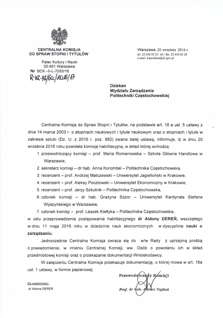 CENTRALNA KOMISJA DO SPRAW STOPNI I TYTUŁÓW Warszawa, 20 września 2016 r. tel. 22 656 65 23: tel./ fax. 22 656 63 28 e-mail: [email protected] Pałac Kultury i Nauki 00-901 Warszawa Nr BCK —ll-L-7093/16 Dziekan Wydziału Zarządzania Politechniki Częstochowskiej Centralna Komisja do Spraw Stopni i Tytułów, na podstawie art. 18 a ust. 5 ustawy z dnia 14 marca 2003 r. o stopniach naukowych i tytule naukowym oraz o stopniach i tytule w zakresie sztuki (Dz. U. z 2016 r. poz. 882) zwana dalej ustawą, informuje, iż w dniu 20 września 2016 roku powołała komisję habilitacyjną, w skład której wchodzą: 1. przewodniczący komisji - prof. Maria Romanowska - Szkoła Główna Handlowa w Warszawie, 2. sekretarz komisji - dr hab. Anna Korombel - Politechnika Częstochowska, 3. recenzent - prof. Andrzej Matczewski - Uniwersytet Jagielloński w Krakowie, 4. recenzent - prof. Aleksy Pocztowski - Uniwersytet Ekonomiczny w Krakowie, 5. recenzent - prof. Jerzy Szkutnik - Politechnika Częstochowska, 6. członek komisji - dr hab. Grażyna Szpor - Uniwersytet Kardynała Stefana W yszyńskiego w Warszawie, 7. członek komisji - prof. Leszek Kiełtyka - Politechnika Częstochowska, w celu przeprowadzenia postępowania habilitacyjnego dr Aldony DEREŃ, wszczętego w dniu 11 maja 2016 roku w dziedzinie nauk ekonomicznych w dyscyplinie nauki o zarządzaniu. Jednocześnie Centralna Komisja zwraca się do w/w Rady z uprzejmą prośbą o powiadomienie, w imieniu Centralnej Komisji, ww. Osób o powołaniu ich w skład przedmiotowej komisji oraz o przekazanie dokumentacji Wnioskodawcy. W załączeniu Centralna Komisja przekazuje dokumentację, o której mowa w art. 18a ust. 1 ustawy, w formie papierowej. Do wiadomości: dr Aldona DEREŃ