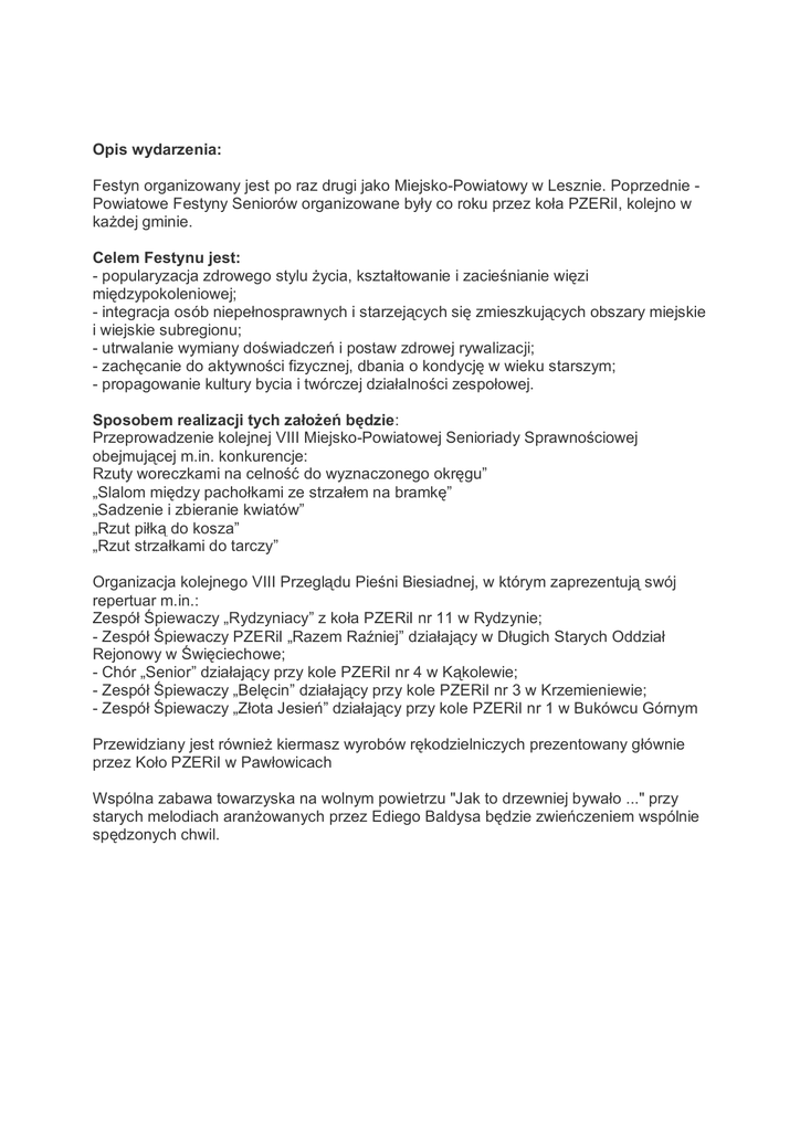 Opis wydarzenia: Festyn organizowany jest po raz drugi jako Miejsko-Powiatowy w Lesznie. Poprzednie Powiatowe Festyny Seniorów organizowane były co roku przez koła PZERiI, kolejno w każdej gminie. Celem Festynu jest: - popularyzacja zdrowego stylu życia, kształtowanie i zacieśnianie więzi międzypokoleniowej; - integracja osób niepełnosprawnych i starzejących się zmieszkujących obszary miejskie i wiejskie subregionu; - utrwalanie wymiany doświadczeń i postaw zdrowej rywalizacji; - zachęcanie do aktywności fizycznej, dbania o kondycję w wieku starszym; - propagowanie kultury bycia i twórczej działalności zespołowej. Sposobem realizacji tych założeń będzie: Przeprowadzenie kolejnej VIII Miejsko-Powiatowej Senioriady Sprawnościowej obejmującej m.in. konkurencje: Rzuty woreczkami na celność do wyznaczonego okręgu” „Slalom między pachołkami ze strzałem na bramkę” „Sadzenie i zbieranie kwiatów” „Rzut piłką do kosza” „Rzut strzałkami do tarczy” Organizacja kolejnego VIII Przeglądu Pieśni Biesiadnej, w którym zaprezentują swój repertuar m.in.: Zespół Śpiewaczy „Rydzyniacy” z koła PZERiI nr 11 w Rydzynie; - Zespół Śpiewaczy PZERiI „Razem Raźniej” działający w Długich Starych Oddział Rejonowy w Święciechowe; - Chór „Senior” działający przy kole PZERiI nr 4 w Kąkolewie; - Zespół Śpiewaczy „Belęcin” działający przy kole PZERiI nr 3 w Krzemieniewie; - Zespół Śpiewaczy „Złota Jesień” działający przy kole PZERiI nr 1 w Bukówcu Górnym Przewidziany jest również kiermasz wyrobów rękodzielniczych prezentowany głównie przez Koło PZERiI w Pawłowicach Wspólna zabawa towarzyska na wolnym powietrzu "Jak to drzewniej bywało ..." przy starych melodiach aranżowanych przez Ediego Baldysa będzie zwieńczeniem wspólnie spędzonych chwil.