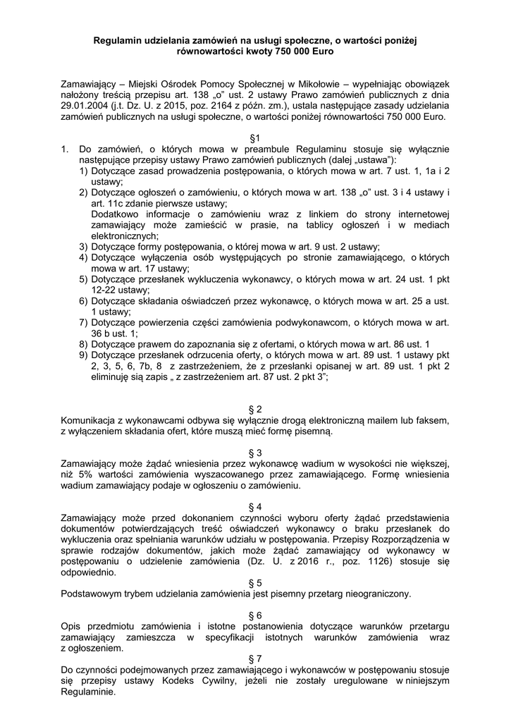 Regulamin udzielania zamówień na usługi społeczne, o wartości poniżej równowartości kwoty 750 000 Euro Zamawiający – Miejski Ośrodek Pomocy Społecznej w Mikołowie – wypełniając obowiązek nałożony treścią przepisu art. 138 „o” ust. 2 ustawy Prawo zamówień publicznych z dnia 29.01.2004 (j.t. Dz. U. z 2015, poz. 2164 z późn. zm.), ustala następujące zasady udzielania zamówień publicznych na usługi społeczne, o wartości poniżej równowartości 750 000 Euro. 1. §1 Do zamówień, o których mowa w preambule Regulaminu stosuje się wyłącznie następujące przepisy ustawy Prawo zamówień publicznych (dalej „ustawa”): 1) Dotyczące zasad prowadzenia postępowania, o których mowa w art. 7 ust. 1, 1a i 2 ustawy; 2) Dotyczące ogłoszeń o zamówieniu, o których mowa w art. 138 „o” ust. 3 i 4 ustawy i art. 11c zdanie pierwsze ustawy; Dodatkowo informacje o zamówieniu wraz z linkiem do strony internetowej zamawiający może zamieścić w prasie, na tablicy ogłoszeń i w mediach elektronicznych; 3) Dotyczące formy postępowania, o której mowa w art. 9 ust. 2 ustawy; 4) Dotyczące wyłączenia osób występujących po stronie zamawiającego, o których mowa w art. 17 ustawy; 5) Dotyczące przesłanek wykluczenia wykonawcy, o których mowa w art. 24 ust. 1 pkt 12-22 ustawy; 6) Dotyczące składania oświadczeń przez wykonawcę, o których mowa w art. 25 a ust. 1 ustawy; 7) Dotyczące powierzenia części zamówienia podwykonawcom, o których mowa w art. 36 b ust. 1; 8) Dotyczące prawem do zapoznania się z ofertami, o których mowa w art. 86 ust. 1 9) Dotyczące przesłanek odrzucenia oferty, o których mowa w art. 89 ust. 1 ustawy pkt 2, 3, 5, 6, 7b, 8 z zastrzeżeniem, że z przesłanki opisanej w art. 89 ust. 1 pkt 2 eliminuję sią zapis „ z zastrzeżeniem art. 87 ust. 2 pkt 3”; §2 Komunikacja z wykonawcami odbywa się wyłącznie drogą elektroniczną mailem lub faksem, z wyłączeniem składania ofert, które muszą mieć formę pisemną. §3 Zamawiający może żądać wniesienia przez wykonawcę wadium w wysokości nie większej, niż 5% wartości zamówienia wyszacowanego przez zamawiającego. Formę wniesienia wadium zamawiający podaje w ogłoszeniu o zamówieniu. §4 Zamawiający może przed dokonaniem czynności wyboru oferty żądać przedstawienia dokumentów potwierdzających treść oświadczeń wykonawcy o braku przesłanek do wykluczenia oraz spełniania warunków udziału w postępowania. Przepisy Rozporządzenia w sprawie rodzajów dokumentów, jakich może żądać zamawiający od wykonawcy w postępowaniu o udzielenie zamówienia (Dz. U. z 2016 r., poz. 1126) stosuje się odpowiednio. §5 Podstawowym trybem udzielania zamówienia jest pisemny przetarg nieograniczony. §6 Opis przedmiotu zamówienia i istotne postanowienia dotyczące warunków przetargu zamawiający zamieszcza w specyfikacji istotnych warunków zamówienia wraz z ogłoszeniem. §7 Do czynności podejmowanych przez zamawiającego i wykonawców w postępowaniu stosuje się przepisy ustawy Kodeks Cywilny, jeżeli nie zostały uregulowane w niniejszym Regulaminie.