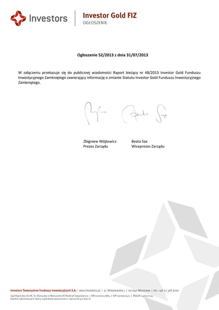 Ogłoszenie 52/2013 z dnia 31/07/2013 W załączeniu przekazuje się do publicznej wiadomości Raport bieżący nr 48/2013 Investor Gold Funduszu Inwestycyjnego Zamkniętego zawierający informację o zmianie Statutu Investor Gold Funduszu Inwestycyjnego Zamkniętego. Zbigniew Wójtowicz Prezes Zarządu Beata Sax Wiceprezes Zarządu INVESTOR GOLD FIZ RB_FI_E 48 2013 korekta KOMISJANADZORUFINANSOWEGO Raport bieżący funduszu inwestycyjnego nr 48 / 2013 (numer kolejny raportu / rok) Data przekazania: 2013-07-31 Nazwa podmiotu: INVESTOR GOLD FUNDUSZ INWESTYCYJNY ZAMKNIĘTY Temat raportu: Zmiana Statutu Investor Gol d Funduszu Inwestycyjnego Zamkniętego Podstawa prawna § 42 ust. 1 pkt 37 oie - inne zdarzenia, przewidziane statutem funduszu WIADOMOŚĆ Informujemy, że w dniu 31 lipca 2013 r. Investors Towarzystwo Funduszy Inwestycyjnych S.A. z siedzibą w Warszawie przyjęło zmiany Statutu Investor Gold Funduszu Inwestycyjnego Zamkniętego w formie aktu notarialnego. Przedmiotowe zmiany Statutu Investor Gold Funduszu Inwestycyjnego Zamkniętego znajdują się w załączeniu. Wypis aktu notarialnego z dnia 31 lipca 2013 r. zawierającego zmiany Statutu Investor Gold Funduszu Inwestycyjnego Zamkniętego, Repertorium A Nr 3349/2013, sporządzony przed notariuszem Iloną Marchocką, prowadzącą Kancelarię Notarialną w Warszawie, przy Al. Szucha 8, jest dostępny w siedzibie Investors Towarzystwa Funduszy Inwestycyjnych S.A. Pli k Opi s ZmStatInvGOLD2013.07.31.pdf PODPISYOSÓBREPREZENTUJĄCYCHPODMIOT Data Imię i Nazwisko Stanowisko/Funkcja 2013-07-31 Zbigniew Wójtowicz Prezes Zarządu 2013-07-31 Piotr Dziadek Wi ceprezes Zarządu Podpis Komisja Nadzoru Finansowego 1 Zmiana Statutu Investor Gold Funduszu Inwestycyjnego Zamkniętego z dnia 31 lipca 2013 r. §1. W Statucie Investor Gold Funduszu Inwestycyjnego Zamkniętego (Fundusz) wprowadza się następujące zmiany: 1) art. 22 otrzymuje nowe następujące brzmienie: 1. Wartość pozycji wynikających z nabytych Instrumentów pochodnych, których cena zależy bezpośrednio lub pośrednio od ceny rynkowej metali szlachetnych, o których mowa w art. 21 ust. 1, stanowi nie więcej niż 200% Aktywów Netto Funduszu. Nie mniej niż 80% i nie więcej niż 100% łącznej wartości pozycji wynikających z Instrumentów pochodnych, których cena zależy bezpośrednio lub pośrednio od ceny rynkowej metali szlachetnych, o których mowa w art. 21 ust. 1, stanowią Instrumenty pochodne, których cena zależy bezpośrednio lub pośrednio od ceny rynkowej złota i srebra. Nie więcej niż 20% wartości pozycji wynikających z nabytych Instrumentów pochodnych, których cena zależy bezpośrednio lub pośrednio od ceny rynkowej metali szlachetnych, o których mowa w art. 21 ust. 1, stanowią Instrumenty pochodne, których cena zależy bezpośrednio lub pośrednio od ceny rynkowej platyny i palladu. Fundusz może zajmować długie pozycje w instrumentach pochodnych na metale szlachetne. Fundusz nie może zajmować krótkich pozycji w instrumentach pochodnych na metale szlachetne. 2. Wartość pozycji wynikających ze wszystkich nabytych lub sprzedanych Instrumentów pochodnych, których cena zależy bezpośrednio lub pośrednio od ceny rynkowej walut obcych stanowi nie więcej niż 200% Aktywów Netto Funduszu. Fundusz może zajmować zarówno długie, jak i krótkie pozycje w Instrumentach pochodnych, których cena zależy bezpośrednio lub pośrednio od ceny rynkowej walut obcych. 3. Suma lokat Funduszu w rodzaje aktywów, o których mowa w art. 21 ust. 2 pkt a) i pkt b) stanowi nie więcej niż 100% wartości Aktywów Netto Funduszu. 4. Wartość pozycji Funduszu ustalona zgodnie z ust. 1 wraz z sumą lokat Funduszu, o której mowa w ust. 3, nie może łącznie przekroczyć 200% Wartości Aktywów Netto Funduszu, z tym zastrzeżeniem, że całkowite zaangażowanie Funduszu w Instrumenty pochodne, w tym Niewystandaryzowane instrumenty pochodne nie spowoduje naruszenia ograniczeń, o których mowa w ust. 17 i ust 18. 5. (skreślony). 5a. Dokonywanie lokat w Niewystandaryzowane instrumenty pochodne będzie miało na celu ograniczenie ryzyka kursowego. 6. Papiery wartościowe lub instrumenty rynku pieniężnego wyemitowane przez jeden podmiot nie mogą stanowić łącznie więcej niż 20% wartości Aktywów Funduszu. Ograniczeń, o których mowa w zdaniu poprzednim, nie stosuje się do papierów wartościowych emitowanych, poręczonych lub gwarantowanych przez Skarb Państwa, Narodowy Bank Polski, państwa należące do OECD albo międzynarodowe instytucje finansowe, których członkiem jest Rzeczpospolita Polska lub co najmniej jedno z państw należących do OECD. 7. Depozyty w jednym banku krajowym, banku zagranicznym lub instytucji kredytowej nie mogą stanowić więcej niż 20% wartości Aktywów Funduszu. 8. Waluta obca jednego państwa lub euro nie może stanowić więcej niż 20% wartości Aktywów Funduszu. 1 9. Fundusz może lokować nie więcej niż 20% wartości Aktywów Funduszu w jednostki uczestnictwa lub certyfikaty inwestycyjne funduszy inwestycyjnych lub tytuły uczestnictwa emitowane przez instytucje wspólnego inwestowania mające siedzibę za granicą. 10. (skreślony). 11. (skreślony). 12. Fundusz, zawierając umowę, której przedmiotem są Niewystandaryzowane instrumenty pochodne, ustala wartość ryzyka kontrahenta, rozumianą jako ustaloną przez Fundusz wartość niezrealizowanego zysku z transakcji, przy czym przy ustalaniu wartości niezrealizowanego zysku nie uwzględnia się opłat bądź świadczeń ponoszonych przez Fundusz przy zawarciu transakcji, w szczególności wartości premii zapłaconej przy zakupie opcji. 13. Jeżeli Fundusz posiada otwarte pozycje w Niewystandaryzowanych instrumentach pochodnych z tytułu kilku transakcji zawartych z tym samym podmiotem, wartość ryzyka kontrahenta może być wyznaczana jako dodatnia różnica niezrealizowanych zysków i strat na wszystkich takich transakcjach o ile: a) transa