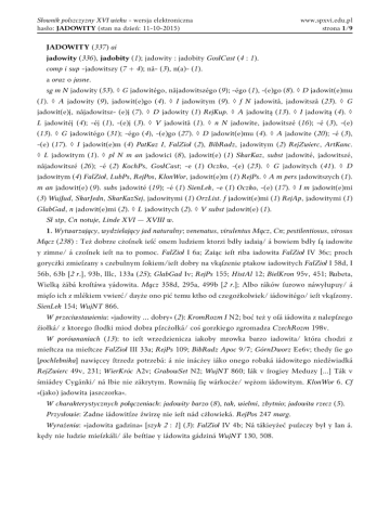 Słownik polszczyzny XVI wieku - wersja elektroniczna hasło: JADOWITY (stan na dzień: 11-10-2015) www.spxvi.edu.pl strona 1/9 JADOWITY (337) ai jadowity (336), jadobity (1); jadowity : jadobity GosłCast (4 : 1). comp i sup -jadowitszy (7 + 4); nå- (3), n(a)- (1). a oraz o jasne. sg m N jadowity (53). ◊ G jadowitégo, nåjadowitszégo (9); -égo (1), -(e)go (8). ◊ D jadowit(e)mu (1). ◊ A jadowity (9), jadowit(e)go (4). ◊ I jadowitym (9). ◊ f N jadowitå, jadowitszå (23). ◊ G jadowit(e)j, nåjadowitsz- (e)j (7). ◊ D jadowity (1) RejKup. ◊ A jadowitą (13). ◊ I jadowitą (4). ◊ L jadowitéj (4); -éj (1), -(e)j (3). ◊ V jadowitå (1). ◊ n N jadowite, jadowitszé (16); -é (3), -(e) (13). ◊ G jadowitégo (31); -égo (4), -(e)go (27). ◊ D jadowit(e)mu (4). ◊ A jadowite (20); -é (3), -(e) (17). ◊ I jadowit(e)m (4) PatKaz I, FalZioł (2), BibRadz, jadowitym (2) RejZwierc, ArtKanc. ◊ L jadowitym (1). ◊ pl N m an jadowici (8), jadowit(e) (1) SkarKaz, subst jadowité, jadowitszé, nåjadowitszé (26); -é (2) KochPs, GosłCast; -e (1) Oczko, -(e) (23). ◊ G jadowitych (41). ◊ D jadowitym (4) FalZioł, LubPs, RejPos, KlonWor, jadowit(e)m (1) RejPs. ◊ A m pers jadowitszych (1). m an jadowit(e) (9). subs jadowité (19); -é (1) SienLek, -e (1) Oczko, -(e) (17). ◊ I m jadowit(e)mi (3) WujJud, SkarJedn, SkarKazSej, jadowitymi (1) OrzList. f jadowit(e)mi (1) RejAp, jadowitymi (1) GlabGad, n jadowit(e)mi (2). ◊ L jadowitych (2). ◊ V subst jadowit(e) (1). Sł stp, Cn notuje, Linde XVI — XVIII w. 1. Wytwarzający, wydzielający jad naturalny; venenatus, virulentus Mącz, Cn; pestilentiosus, virosus Mącz (238) : Też dobrze cżoſnek ieſć onem ludziem ktorzi bdły iadaią/ á bowiem bdły ſą iadowite y zimne/ á czoſnek ieſt na to pomoc. FalZioł I 6a; Zaiąc ieſt riba iadowita FalZioł IV 36c; proch gorycżki zmieſzany s czebulnym ſokiem/ieſt dobry na vkąſzenie ptakow iadowitych FalZioł I 58d, I 56b, 63b [2 r.], 93b, lllc, 133a (25); GlabGad Iv; RejPs 155; HistAl 12; BielKron 95v, 451; Rubeta, Wielką żábá kroſtáwa yádowita. Mącz 358d, 295a, 499b [2 r.]; Albo ráków ſurowo náwyłupuy/ á mięſo ich z mlékiem vwierć/ dayże ono pić temu ktho od czegożkolwiek/ iádowitégo/ ieſt vkąſzony. SienLek 154; WujNT 866. W przeciwstawieniu: »jadowity ... dobry« (2): KromRozm I N2; boć też y oſá iádowita z nalepſzego źiołká/ z ktorego ſłodki miod dobra pſzcżołká/ coś gorzkiego zgromadza CzechRozm 198v. W porównaniach (13): to ieſt wrzedzienicza iakoby mrowka barzo iadowita/ która chodzi z mieſtcza na mieſtcze FalZioł III 33a; RejPs 109; BibRadz Apoc 9/7; GórnDworz Ee6v; thedy ſie go [pochlebnika] nawięcey ſtrzedz potrzebá: á nie inácżey iáko onego robaká iádowitego niedźwiadká RejZwierc 49v, 231; WierKróc A2v; GrabowSet N2; WujNT 860; Iák v ſrogiey Meduzy [...] Ták v śmiádey Cygánki/ ná łbie nie zákrytym. Rownáią ſię wárkocże/ wężom iádowitym. KlonWor 6. Cf »(jako) jadowita jaszczorka«. W charakterystycznych połączeniach: jadowity barzo (8), tak, wielmi, zbytnio; jadowita rzecz (5). Przysłowie: Zadne iádowitſze źwirzę nie ieſt nád cżłowieká. RejPos 247 marg. Wyrażenia: »jadowita gadzina« [szyk 2 : 1] (3): FalZioł IV 4b; Ná tákieyżeć puſzczy był y Ian á. kędy nie ludzie mieſzkáli/ ále beſtiae y iádowita gádziná WujNT 130, 508. Słownik polszczyzny XVI wieku - wersja elektroniczna hasło: JADOWITY (stan na dzień: 11-10-2015) www.spxvi.edu.pl strona 2/9 »(jako) jadowita jaszczorka« [szyk 2 : 1] (3): A tu rozumiey kogo tu Pan ſprzećiwnemi ſobie álbo niewierniki ſwemi á práwie iádowitemi iáſzcżorkámi zowie. RejAp 192v; [śmierć] kąſáłá á zárażáłá/ iáko iádowita iáſzcżorká/ ten nędzny narod ludzki RejPos 221; ReszPrz 61. »mrowka jadowita« [szyk 3 : 1] (4): FalZioł III 33a; Ani ták Gryfi lotni złotá ſwego chronią/ A Mrowki iádowite kruſzcow ſwoich bronią. KmitaSpit A2; Solifuga, Nieyáki rodzay mrówek yádowitych. Mącz 399d, 365d. »jadowity robak« [szyk 14 : 9] (23): Też gdy by kto miał wſobie iad robaka ktorygo [!] iadowitego/ to ieſt z vkąſzenia węża albo iaſzcżorki/ dayże mu prochu thego ſmolnika FalZioł I 9d, I 2c, 91c, II 13c, IV 8b, 15c (15); GroicPorz iiv; Mącz 28a, 36d; SienLek 154; RejAp 78; RejZwierc 49v; SkarŻyw 167; Calep 810a. »jadowity smok« = venenatus dracon PolAnt [szyk 4 : 3] (7): potłumiałeś ony mocarze/ ktorzy byli podobni ku iádowitem ſmokom ſrogoſćiami ſwemi RejPs 109; RejWiz 10v; BibRadz Sap 16/10; W tey rzece Nilus/ rodzą ſie Kokodrilli iádowići ſmocy z iáiá/ ktore będzie ták wielkie iáko gęſie. BielKron 270; RejAp I03v; WierKróc A2v; GrabowSet N2. »wąż jadowity« = aspis Murm, Mącz [szyk 9 : 4] (13): Aspis. Eyne kleyne vergiffte ſchlang Máły yádowyty wąż Murm 96; BartBydg 15; FalZioł IV 33b; Węże wielkie ále nie iádowite. BielKron 44lv, 451; Haemorrhois, Czerwona biegunká/ też nieyáki rodzay wężów barzo yádowitych zá którego vkąſzeniem kreẃ ciecze á nie może być záſtánowiona. Mącz 152a, 18a, 319a; Prot B3v; wiem to pewnie/ żeby ſie hnet záraz ták nim brzydzono/ iáko iednym iádowitym wężem/ álbo by przeſzedl w poſmiech GórnDworz Ee6v; Niecnotá Wąż iádowity/ Co leży ná drodze zwity RejZwierc 231; GosłCast 60; KlonWor 6. »jadowite zwierzę« [szyk 12 : 7] (19): [orłowy kamień] zwierzęta iadowite odpądza, á przeto Orłowie then kamień kładą do gniazda: aby iayca y dzieci od zwierząt iadowitych były zachowany FalZioł IV 48d, I 23c, 41d, 47b, 52a, II 10a (17); RejPs 217v; [Bóg] ſtworzył muchy/ chrobáctwo/ źwirzętá iádowite/ drapieżne BielKron lv. »jadowite żądło« [szyk 2 : 2] (4): OSſa ieſt robak żądła iadowitego. FalZioł IV 28c, 15c; W tym żądło iádowité Niedźwiadek połozył: W tym niepochybny Strzelec tęgi łuk náłożył. KochPhaen 19; GosłCast 41. 
