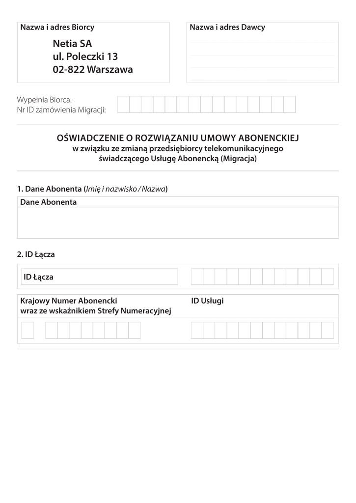 Nazwa i adres Biorcy Nazwa i adres Dawcy Netia SA ul. Poleczki 13 02-822 Warszawa Wypełnia Biorca: Nr ID zamówienia Migracji: OŚWIADCZENIE O ROZWIĄZANIU UMOWY ABONENCKIEJ w związku ze zmianą przedsiębiorcy telekomunikacyjnego świadczącego Usługę Abonencką (Migracja) 1. Dane Abonenta (Imię i nazwisko / Nazwa) Dane Abonenta 2. ID Łącza ID Łącza Krajowy Numer Abonencki wraz ze wskaźnikiem Strefy Numeracyjnej ID Usługi 3. Oświadczenie o wypowiedzeniu umowy / umów na Usługi Abonenckie: Oświadczam, że w związku ze zmianą dostawcy usług, rozwiązuję Umowę Abonencką dotyczącą: usługi głosowej w następującym trybie: rozwiązania umowy wraz z upływem okresu jej obowiązywania rozwiązania umowy wraz z upływem okresu jej wypowiedzenia * w sytuacji, gdy dotychczasowy dostawca Usługi Abonenckiej (Dawca) świadczący na moją rzecz usługę nie wskaże żadnego terminu realizacji podczas procesu migracji, jako terminu zakończenia usługi wskazuję: – – (pole obowiązkowe, data określona pomiędzy 7 dni roboczych a 120 dni kalendarzowych licząc od dnia złożenia niniejszego oświadczenia) , przy czym jestem świadomy konsekwencji – – z dniem wynikających z przedterminowego wypowiedzenia umowy, w tym obowiązku w zakresie zapłaty kar umownych z zachowaniem dotychczasowego numeru usługi internetowej (lub innej szerokopasmowej) w następującym trybie: rozwiązania umowy wraz z upływem okresu jej obowiązywania rozwiązania umowy wraz z upływem okresu jej wypowiedzenia * w sytuacji, gdy dotychczasowy dostawca Usługi Abonenckiej (Dawca) świadczący na moją rzecz usługę nie wskaże żadnego terminu realizacji podczas procesu migracji, jako terminu zakończenia usługi wskazuję: – – (pole obowiązkowe, data określona pomiędzy 7 dni roboczych a 120 dni kalendarzowych licząc od dnia złożenia niniejszego oświadczenia) , przy czym jestem świadomy konsekwencji – – z dniem wynikających z przedterminowego wypowiedzenia umowy, w tym obowiązku w zakresie zapłaty kar umownych Oświadczam, że w przypadku, gdy planowana data rozpoczęcia świadczenia Usługi Abonenckiej przez Biorcę będzie późniejsza niż data rozwiązania obecnej Umowy Abonenckiej wyrażam zgodę na przedłużenie świadczenia dotychczasowej Usługi Abonenckiej do czasu uruchomienia Usługi Abonenckiej przez Biorcę. 4. Termin realizacji Zamówienia a) Wskazuje się, że data realizacji zamówienia musi mieścić się w przedziale od 7 dni roboczych do 120 dni kalendarzowych od daty złożenia Oświadczenia i nie powinna przypadać na dzień ustawowo wolny od pracy. b) W przypadku, gdy wskazana w pkt 3. data nie będzie spełniać powyższych warunków, realizacja wniosku o rozwiązanie Umowy Abonenckiej i uruchomienie usługi przez Biorcę nie będzie możliwa, a dotychczasowa Usługa Abonencka będzie świadczona zgodnie z obowiązującą Umową Abonencką. 5. Oświadczenie w przypadku braku możliwości realizacji usługi u nowego dostawcy usług („Migracji”) Oświadczam, iż w przypadku braku możliwości realizacji Migracji, cofam niniejsze oświadczenie o rozwiązaniu Umowy Abonenckiej i wyrażam zgodę, aby dotychczasowa Usługa Abonencka była świadczona zgodnie z dotychczasową Umową Abonencką. 6. Oświadczenie w zakresie danych osobowych Zgodnie z ustawą z dnia 29 sierpnia 1997 roku o ochronie danych osobowych (tj. Dz.U. z 2002 r. Nr 101, poz. 926 z późn. zm.), wyrażam zgodę na przetwarzanie moich danych osobowych, wskazanych w pkt 1. powyżej w zakresie niezbędnym do dokonania modyfikacji zasad świadczenia Usługi Abonenckiej. podpis Abonenta / osoby reprezentującej przedsiębiorstwo / instytucję Miejscowość Data