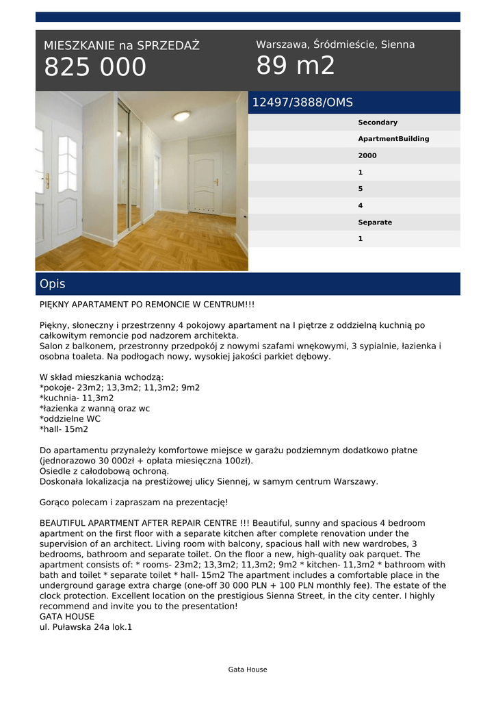 Warszawa, Śródmieście, Sienna MIESZKANIE na SPRZEDAŻ 89 m2 825 000 12497/3888/OMS Secondary ApartmentBuilding 2000 1 5 4 Separate 1 Opis PIĘKNY APARTAMENT PO REMONCIE W CENTRUM!!! Piękny, słoneczny i przestrzenny 4 pokojowy apartament na I piętrze z oddzielną kuchnią po całkowitym remoncie pod nadzorem architekta. Salon z balkonem, przestronny przedpokój z nowymi szafami wnękowymi, 3 sypialnie, łazienka i osobna toaleta. Na podłogach nowy, wysokiej jakości parkiet dębowy. W skład mieszkania wchodzą: *pokoje- 23m2; 13,3m2; 11,3m2; 9m2 *kuchnia- 11,3m2 *łazienka z wanną oraz wc *oddzielne WC *hall- 15m2 Do apartamentu przynależy komfortowe miejsce w garażu podziemnym dodatkowo płatne (jednorazowo 30 000zł + opłata miesięczna 100zł). Osiedle z całodobową ochroną. Doskonała lokalizacja na prestiżowej ulicy Siennej, w samym centrum Warszawy. Gorąco polecam i zapraszam na prezentację! BEAUTIFUL APARTMENT AFTER REPAIR CENTRE !!! Beautiful, sunny and spacious 4 bedroom apartment on the first floor with a separate kitchen after complete renovation under the supervision of an architect. Living room with balcony, spacious hall with new wardrobes, 3 bedrooms, bathroom and separate toilet. On the floor a new, high-quality oak parquet. The apartment consists of: * rooms- 23m2; 13,3m2; 11,3m2; 9m2 * kitchen- 11,3m2 * bathroom with bath and toilet * separate toilet * hall- 15m2 The apartment includes a comfortable place in the underground garage extra charge (one-off 30 000 PLN + 100 PLN monthly fee). The estate of the clock protection. Excellent location on the prestigious Sienna Street, in the city center. I highly recommend and invite you to the presentation! GATA HOUSE ul. Puławska 24a lok.1 Gata House 02-512 Warszawa Agnieszka Abada tel. 666 346 089 tel. 224000370 email: [email protected] Gata House Powered by TCPDF (www.tcpdf.org)