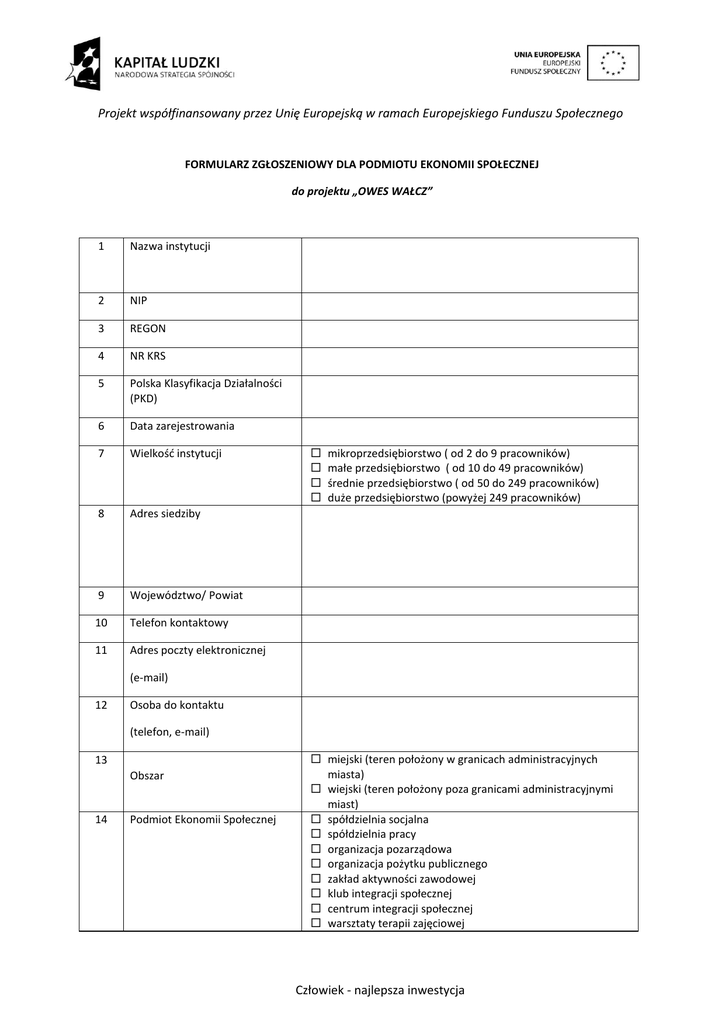 Projekt współfinansowany przez Unię Europejską w ramach Europejskiego Funduszu Społecznego FORMULARZ ZGŁOSZENIOWY DLA PODMIOTU EKONOMII SPOŁECZNEJ do projektu „OWES WAŁCZ” 1 Nazwa instytucji 2 NIP 3 REGON 4 NR KRS 5 Polska Klasyfikacja Działalności (PKD) 6 Data zarejestrowania 7 Wielkośd instytucji 8 Adres siedziby 9 Województwo/ Powiat 10 Telefon kontaktowy 11 Adres poczty elektronicznej mikroprzedsiębiorstwo ( od 2 do 9 pracowników) małe przedsiębiorstwo ( od 10 do 49 pracowników) średnie przedsiębiorstwo ( od 50 do 249 pracowników) duże przedsiębiorstwo (powyżej 249 pracowników) (e-mail) 12 Osoba do kontaktu (telefon, e-mail) 13 Obszar 14 Podmiot Ekonomii Społecznej miejski (teren położony w granicach administracyjnych miasta) wiejski (teren położony poza granicami administracyjnymi miast) spółdzielnia socjalna spółdzielnia pracy organizacja pozarządowa organizacja pożytku publicznego zakład aktywności zawodowej klub integracji społecznej centrum integracji społecznej warsztaty terapii zajęciowej Człowiek - najlepsza inwestycja Projekt współfinansowany przez Unię Europejską w ramach Europejskiego Funduszu Społecznego spółdzielnia inwalidów i niewidomych inne ……………………………………………………………………….. 15 Liczba osób zatrudnionych: 16 Liczba osób współpracujących: 17 Proszę podad 3 główne źródła finansowania podmiotu 18 Czy podmiot prowadzi odpłatną działalnośd pożytku publicznego? Tak Nie 19 Czy podmiot prowadzi działalnośd gospodarczą? Nie 21 Wykaz osób (zgłaszanych na szkolenia, doradztwo i usługi specjalistyczne Tak (proszę dołączyd bilans, rachunek zysków i strat, informację dodatkową z ostatnich 3 lat) Imię i nazwisko: (stronę 3 i 4 niniejszego formularza należy wypełnid oddzielnie dla każdej zgłaszanej osoby) Imię i nazwisko: Imię i nazwisko: Imię i nazwisko: Imię i nazwisko: Data i podpis osoby upoważnionej do reprezentowania organizacji: Do formularza należy załączyd: 1. Statut organizacji; 2. Formularz testu pomocy publicznej (załącznik nr 4 do regulaminu). Człowiek - najlepsza inwestycja Projekt współfinansowany przez Unię Europejską w ramach Europejskiego Funduszu Społecznego FORMULARZ ZGŁOSZENIOWY DLA OSÓB WYZNACZONYCH Z PODMIOTU EKONOMII SPOŁECZNEJ do projektu „OWES WAŁCZ” 1 Imię 2 Nazwisko 3 PESEL brak podstawowe gimnazjalne ponadgimnazjalne(średnie lub zasadnicze zawodowe) pomaturalne (wyższe niż średnie, ale nie wyższe) wyższe 4 Wykształcenie 5 Opieka nad dziedmi do lat 7 lub opieka nad osobą zależną tak nie 6 Niepełnosprawnośd tak nie 7 Miejsce zamieszkania (ulica, nr domu/lokalu, kod pocztowy, miejscowośd) 8 Powiat 9 Obszar 10 Telefon stacjonarny 11 Telefon komórkowy 12 Adres poczty elektronicznej (e-mail) 13 Zatrudniony w miejski (teren położony w granicach administracyjnych miasta) wiejski (teren położony poza granicami administracyjnymi miast) mikroprzedsiębiorstwie (od 2 do 9 pracowników) małym przedsiębiorstwie (od 10 do 49 pracowników) średnim przedsiębiorstwie (od 50 do 249 pracowników) dużym przedsiębiorstwie (powyżej 249 pracowników) administracji publicznej (administracji rządowej, samorządowej i ich jednostkach organizacyjnych) organizacji pozarządowej Inne ………………………………………………………………………. Człowiek - najlepsza inwestycja Projekt współfinansowany przez Unię Europejską w ramach Europejskiego Funduszu Społecznego Ja niżej podpisany potwierdzam prawdziwośd podanych przeze mnie danych zawartych w niniejszej Deklaracji, jak również w innych dokumentach dotyczących Projektu. Jednocześnie jestem świadomy/a odpowiedzialności karnej wynikającej z przepisów z art. 233 § 1 Kodeksu Karnego za oświadczanie nieprawdy lub zatajenie prawdy, w związku z art. 75 § 2 Kodeksu Postępowania Administracyjnego i oświadczam, że powyższe dane są zgodne z prawdą. Oświadczam, że spełniam kryteria kwalifikacyjne pozwalające na udział w projekcie i zapoznałem/am się z Regulaminem OWES i przyjmuję jego warunki bez zastrzeżeo. Data i podpis osoby zgłaszanej Człowiek - najlepsza inwestycja Projekt współfinansowany przez Unię Europejską w ramach Europejskiego Funduszu Społecznego DEKLARACJA UCZESTNICTWA W PROJEKCIE 1. Deklaruję uczestnictwo w projekcie „OWES WAŁCZ” realizowanym w ramach Programu Operacyjnego Kapitał Ludzki Poddziałanie 7.2.2. 2. Zobowiązuję się do: Przeprowadzenia diagnozy potrzeb, z udziałem doradcy OWES, mającej na celu opracowanie indywidualnej ścieżki wsparcia w ramach OWES Regularnego uczestnictwa w zajęciach szkoleniowych, doradczych zgodnie z wyznaczoną ścieżką wsparcia Wypełniania ankiet niezbędnych w procesie monitorowania projektu Udziału w badaniu ewaluacyjnym w trakcie i po zakooczeniu realizacji projektu. 3. Zostałam/em poinformowany, że przysługują mi: bezpłatne szkolenia i bezpłatne materiały szkoleniowe; bezpłatne doradztwo; catering na szkoleniach; bezpłatne usługi: księgowe, prawne, biznesowe. ……………………………………………… ………………………………………………….. Miejsce, data podpis uczestnika projektu OŚWIADCZENIE UCZESTNIKA PROJEKTU W związku z przystąpieniem do Projektu „OWES WAŁCZ” realizowanego w ramach Programu Operacyjnego Kapitał Ludzki oświadczam, iż przyjmuję do wiadomości, że: 1) administratorem moich danych osobowych jest Minister Rozwoju Regionalnego pełniący funkcję Instytucji Zarządzającej dla Programu Operacyjnego Kapitał Ludzki, mający siedzibę przy ul. Wspólna 2/4, 00-926 Warszawa; 2) podstawę prawną przetwarzania moich danych osobowych stanowi art. 23 ust. 1 pkt 2 lub art. 27 ust.2 pkt 2 ustawy z dnia 29 sierpnia 1997 r. o ochronie danych osobowych (Dz. U. z 2002 r. Nr 101 poz. 926 z późn. zm.) 3) moje dane osobowe będą przetwarzane wyłącznie w celu udzielen