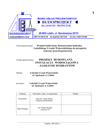 1 BIURO USŁUG PROJEKTOWYCH BUDOPROJEKT inŜ. JANUSZ FRONCZYK 20-004 Lublin, ul. Narutowicza 22/13 www.budoprojekt.lublin.pl [email protected] NIP:712-100-57-38 Tytuł opracowania: tel.-fax(0-81) 743-72-92 Projekt budowlany dostosowania budynku Lubelskiego Urzędu Wojewódzkiego do przepisów ochrony przeciwpoŜarowej Temat opracowania: PROJEKT BUDOWLANY INSTALACJA WODOCIĄGOWA - ZASILENIE HYDRANTÓW Obiekt: Lubelski Urząd Wojewódzki ul. Spokojna 4, Lublin Inwestor: Lubelski Urząd Wojewódzki ul. Spokojna 4, Lublin Funkcja Projektant Sprawdzający tel. kom. 0-505 176 909 Nazwisko i imię / nr uprawnień Podpis mgr inŜ. Anna Mazur LUB/0124/PWOS/04 inŜ. Feliks Dragan 2369/Lb/74 ___________________________________________________________________________________ Lublin, XII-2011 r. ZAWARTOŚĆ OPRACOWANIA DO PROJEKTU INSTALACJI WODOCIĄGOWEJ W ZAKRESIE ZASILENIA WEWNĘTRZNYCH HYDRANTÓW PRZECIWPOśAROWYCH DLA DOSTOSOWANIA BUDYNKU LUBELSKIEGO URZĘDU WOJEWÓDZKIEGO DO PRZEPISÓW OCHRONY PRZECIWPOśAROWEJ CZĘŚĆ OPISOWA 1. 2. 3. 4. 5. 6. 7. 8. Temat i lokalizacja obiektu. Cel i zakres opracowania dokumentacji. Podstawa opracowania dokumentacji. Opis budynku i zakres prac projektowych. Obliczenia. Opis rozwiązania instalacji wodociągowej. Kanalizacja saniatrna i wentylacja pomieszczeń wodomierzy. Uwagi końcowe. CZĘŚĆ RYSUNKOWA LP. NR RYS. NAZWA RYSUNKU SKALA 1 1 PLAN SYTUACYJNY 1:500 2 2 RZUT NISKIEGO PARTERU 1:100 3 3 RZUT PARTERU 1:100 4 4 RZUT I PIĘTRA 1:100 5 5 RZUT II PIĘTRA 1:100 6 6 RZUT PODDASZA 1:100 7 7 AKSONOMETRIA INSTALACJI HYDRANTOWEJ 1:100/1:100 8 8 POMIESZCZENIE ISTNIEJĄCEGO WODOMIERZA 1:25 OPIS TECHNICZNY DO PROJEKTU INSTALACJI WODOCIĄGOWEJ W ZAKRESIE ZASILENIA WEWNĘTRZNYCH HYDRANTÓW PRZECIWPOśAROWYCH DLA DOSTOSOWANIA BUDYNKU LUBELSKIEGO URZĘDU WOJEWÓDZKIEGO DO PRZEPISÓW OCHRONY PRZECIWPOśAROWEJ 1. TEMAT I LOKALIZACJA OBIEKTU. Tematem opracowania jest instalacja wodociągowa w zakresie zasilenia projektowanych hydrantów przeciwpoŜarowych dla dostosowania budynku Lubelskiego Urzędu Wojewódzkiego w Lublinie, przy ul Spokojnej 4, do przepisów ochrony przeciwpoŜarowej. Opracowanie w zakresie branŜy budowlanej ma na celu dostosowanie klatek schodowych dla potrzeb ewakuacyjnych z wydzieleniem ich przegrodami p.poŜ. od dróg ewakuacyjnych i ochrony przed zadymieniem. 2. CEL I ZAKRES OPRACOWANIA DOKUMENTACJI. Celem opracowania jest sporządzenie dokumentacji projektowo-kosztorysowej instalacji wodociągowej w zakresie zasilenia wewnętrznych hydrantów przeciwpoŜarowych dla projektu dostosowania Lubelskiego Urzędu Wojewódzkiego dla potrzeb ochrony przeciwpoŜarowej. 3. PODSTAWA OPRACOWANIA DOKUMENTACJI • • • • • • • • • • Zlecenie Inwestora: Lubelski Urząd Wojewódzki, ul. Spokojna 4, Lublin. Ekspertyza techniczna dotycząca stanu ochrony przeciwpoŜarowej budynku Lubelskiego Urzędu Wojewódzkiego w Lublinie przy ul. Spokojnej 4, sporządzona przez mgr inŜ. arch. M. Furmańczyka i mgr inŜ. R. Tarczyńskiego w lutym 2010 r. Postanowienie Lubelskiego Komendanta Wojewódzkiego Państwowej StraŜy PoŜarnej z dn. 31.03.2011 r. Warunki techniczne dostawy wody do posesji Spokojna 4, wydane przez MPWiK pismem KT-5004-956/2011 z dnia 28.12.2011r. dotyczące aktualnej rzędnej linii ciśnień w sieci wodociągowej w rejonie miejsca włączenia istniejącego przyłącza wodociągowego w sieć wodociągową w ul. Spokojnej, Podkłady architektoniczno – budowlane. Inwentaryzacja na terenie obiektu. Ustalenia z Inwestorem. Rozporządzenie Ministra Infrastruktury z dnia 12 kwietnia 2002 roku w sprawie warunków technicznych, jakim powinny odpowiadać budynku i ich usytuowanie (Dz.U. Nr 75 poz. 690 wraz z późniejszymi zmianami), Rozporządzeniem Ministra Spraw Wewnętrznych i Administracji z dnia 7 czerwca 2010 roku, w sprawie ochrony przeciwpoŜarowej budynków, innych obiektów i terenów (Dz. U. Nr 109, poz. 719), Rozporządzenie Ministra Spraw Wewnętrznych i Administracji z dnia 24 lipca 2009 roku w sprawie przeciwpoŜarowego zaopatrzenia w wodę oraz dróg poŜarowych (Dz.U. nr 124 poz. 1030), • • Polska Norma PN-EN 671-1 Stałe urządzenia gaśnicze. Hydranty wewnętrzne. Hydranty wewnętrzne z węŜem półsztywnym, Polska Norma PN-EN 671-2 Stałe urządzenia gaśnicze. Hydranty wewnętrzne. Hydranty wewnętrzne z węŜem płasko składanym. 4. OPIS BUDYNKU I ZAKRES PRAC PROJEKTOWYCH. Budynek Urzędu Wojewódzkiego jest obiektem o czterech kondygnacjach nadziemnych z poddaszem uŜytkowym w skrzydłach bocznych. W niewielkiej części w budynku znajduje się podziemny schron. Elewacja budynku objęta jest ochroną konserwatorską. Obiekt zaprojektowany został w 1923 r. W latach pięćdziesiątych ubiegłego stulecia dobudowano do bryły budynku dwa skrzydła i wykonano schron poziemny. Budynek wykonano w konstrukcji tradycyjnej, ze ścianami z cegły ceramicznej pełnej na zaprawie cementowo-wapiennej, stropy Kleina z płytą z cegły opartą na dźwigarach stalowych, dach dwuspadowy o konstrukcji drewnianej, w większości kryty dachówką oraz blachą. Poziom niskiego parteru przeznaczony jest w większości na pomieszczenia gospodarczomagazynowe. W lewym skrzydle usytuowano część pomieszczeń biurowych. W prawym skrzydle funkcjonuje stołówka dla pracowników. Parter budynku prawie w całości przeznaczony jest na powierzchnię biurową. Na parterze usytuowana jest takŜe reprezentacyjna Sala Kolumnowa, kiosk, biuro obsługi klienta i portiernia. Pierwsze piętro zajmują urzędy Lubelskiego Urzędu Wojewódzkiego, Urzędu Marszałkowskiego, Sejmiku Wojewódzkiego oraz wydziały tych instytucji. Drugie piętro w całości przeznaczone jest na pomieszczenia biurowe. Część pomieszczeń biurowych zlokalizowano takŜe na poddaszu dobudowywanych skrzydeł budynku. Pozostała część poddasza jest nieuŜytkowa. Komunikacja pionowa odbywa się dwiema głównymi klatkami schodowymi prowadzonymi z hallu na parterze na I i I