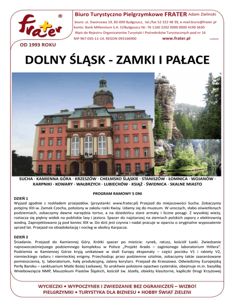 Biuro Turystyczno Pielgrzymkowe FRATER Adam Zielinski biuro: ul. Dworcowa 19, 85-009 Bydgoszcz, tel./fax 52 322 48 39, e-mail:[email protected] konto: Bank Millennium S.A. O/Bydgoszcz Nr: 76 1160 2202 0000 0000 4190 3630 Wpis do Rejestru Organizatorów Turystyki i Pośredników Turystycznych pod nr 16 NIP 967-035-11-14, REGON 093166900 www.frater.pl 14/09/02 DOLNY ŚLĄSK - ZAMKI I PAŁACE SUCHA · KAMIENNA GÓRA · KRZESZÓW · CHEŁMSKO ŚLĄSKIE · STANISZÓW · ŁOMNICA · WOJANÓW · KARPNIKI · KOWARY · WAŁBRZYCH · LUBIECHÓW · KSIĄŻ · ŚWIDNICA · SKALNE MIASTO PROGRAM RAMOWY 5 DNI DZIEŃ 1 Wyjazd zgodnie z rozkładem przejazdów. (przystanki: www.frater.pl) Przejazd do miejscowości Sucha. Zobaczymy potężny XIII-w. Zamek Czocha, położony w zakolu rzeki Kwisy. Udamy się do muzeum. W uroczych, słabo oświetlonych podziemiach, zobaczymy dawne narzędzia tortur, a na dziedzińcu stare armaty i liczne posągi. Z wysokiej wieży, roztacza się piękny widok na pobliskie lasy i jeziora. Spacer do najstarszej na ziemiach polskich zapory z elektrownią wodną. Zaprojektowano ją pod koniec XIX w. Do dziś jest czynna i nadal pracuje w oparciu o oryginalne wyposażenie sprzed lat. Przejazd na obiadokolację i nocleg w okolicy Karpacza. DZIEŃ 2 Śniadanie. Przejazd do Kamiennej Góry. Krótki spacer po mieście: rynek, ratusz, kościół Łaski. Zwiedzanie najnowocześniejszego podziemnego kompleksu w Polsce „Projekt Arado – zaginionego laboratorium Hitlera”. Podziemia w Kamiennej Górze kryją unikatowe w skali Europy eksponaty – części pocisku V1 i rakiety V2, niemieckiego radaru i niemieckiej enigmy. Przechodząc przez podziemne sztolnie, zobaczymy także zaaranżowane pomieszczenia, tj. laboratorium, halę produkcyjną, zalany korytarz. Przejazd do Krzeszowa. Odwiedzimy Europejską Perłę Baroku – sanktuarium Matki Bożej Łaskawej. To urokliwie położone opactwo cysterskie, obejmuje m.in. bazylikę Wniebowzięcia NMP, Mauzoleum Piastów Śląskich, kościół św. Józefa, obiekty klasztorne, kapliczki Drogi Krzyżowej Biuro Turystyczno Pielgrzymkowe FRATER Adam Zielinski biuro: ul. Dworcowa 19, 85-009 Bydgoszcz, tel./fax 52 322 48 39, e-mail:[email protected] konto: Bank Millennium S.A. O/Bydgoszcz Nr: 76 1160 2202 0000 0000 4190 3630 Wpis do Rejestru Organizatorów Turystyki i Pośredników Turystycznych pod nr 16 NIP 967-035-11-14, REGON 093166900 www.frater.pl 14/09/02 oraz pawilon Na Wodzie. Panorama okolic z wieży bazyliki. Przejazd do Chełmska Śląskiego. Zobaczymy „Dwunastu Apostołów”– domy tkaczy, odwiedzimy warsztat tkacki, możliwość zakupu wyrobów z lnu. Spacer po urokliwym rynku z figurą św. Jana Nepomucena. Powrót na obiadokolację i nocleg. DZIEŃ 3 Śniadanie. Wycieczka Szlakiem Pałaców i Ogrodów Dolnośląskich. Zobaczymy przepięknej urody pałace i ogrody w stylu angielskim w Staniszowie, Łomnicy, Wojanowie i Karpnikach. Udamy się do Kowar. Zwiedzimy Park Miniatur Zabytków Dolnego Śląska, prezentujący najpiękniejsze obiekty tego terenu. Miniatury zostały wykonane za pomocą najnowszych technik modelarskich. Powrót na obiadokolację i nocleg. DZIEŃ 4 Śniadanie. Przejazd do Wałbrzycha. W Lubiechowie zobaczymy palmiarnię z kolekcją egzotycznych gatunków roślin, a w Książu zwiedzimy Zamek Hochbergów – największy obiekt warowny na Dolnym Śląsku. Wnętrza zamku, to ponad 400 sal. Zamek otoczony jest tarasami z ogrodami. Kompleks obejmuje wieżę widokową, ruiny dawnej twierdzy, hipodrom, ujeżdżalnie i słynną w całym kraju stadninę koni. Zwiedzanie trasą „Śladami Hochbergów”- zobaczymy salony barokowe oraz najstarsze pomieszczenia zamkowe. Spacer po parku przypałacowym. Przejazd do Świdnicy. Spacer po mieście. Zwiedzimy gotycką katedrę św. Stanisława i Wacława, ewangelicki kościół Łaski i Pokoju wpisany na Listę UNESCO, a także rynek ze średniowiecznym, niezmienionym układem ulic. Powrót na obiadokolację I nocleg. DZIEŃ 5 Śniadanie. Przejazd do Adrspach. Wędrówka po Skalnym Mieście, z monumentalnymi formami skalnymi z piaskowca płytowego. Znajdują się tutaj skały o romantycznych nazwach jak: Kochankowie, Starosta i Starościna, Głowa Cukru, Ząb Karkonosza, Dzban i inne. Uroku dodaje skalny wodospad oraz piękne dwa skalne jeziorka, po których można przepływać łodziami. Najdoskonalszym zbiorowiskiem leśnym, są tutaj reliktowe bory z wrzosem, czarną jagodą oraz chronionym bagnem zwyczajnym. Wyjazd w drogę powrotną. Obiad pożegnalny, połączony z podsumowaniem wyjazdu. Zakończenie wycieczki w godzinach wieczornych. TERMIN: 2015 ROK ZAPEWNIAMY: • przejazd luksusowym autokarem • 4 noclegi w hotelu **/*** pokoje 2-3 os. z łazienkami, małżeństwa pokoje 2 os. • 4 śniadania, 4 obiadokolacje, 1 obiad • opiekę i informację turystyczną pilota • ubezpieczenie NNW do 5000 zł UWAGI: • Program może ulec drobnym zmianom • Niezbędny dokument - dowód lub paszport • Na wstępy, przewodników i wydatki programowe - 130 zł • dopłata do pok. 1 os - 200 zł Biuro Turystyczno Pielgrzymkowe FRATER Adam Zielinski biuro: ul. Dworcowa 19, 85-009 Bydgoszcz, tel./fax 52 322 48 39, e-mail:[email protected] konto: Bank Millennium S.A. O/Bydgoszcz Nr: 76 1160 2202 0000 0000 4190 3630 Wpis do Rejestru Organizatorów Turystyki i Pośredników Turystycznych pod nr 16 NIP 967-035-11-14, REGON 093166900 www.frater.pl 14/09/02