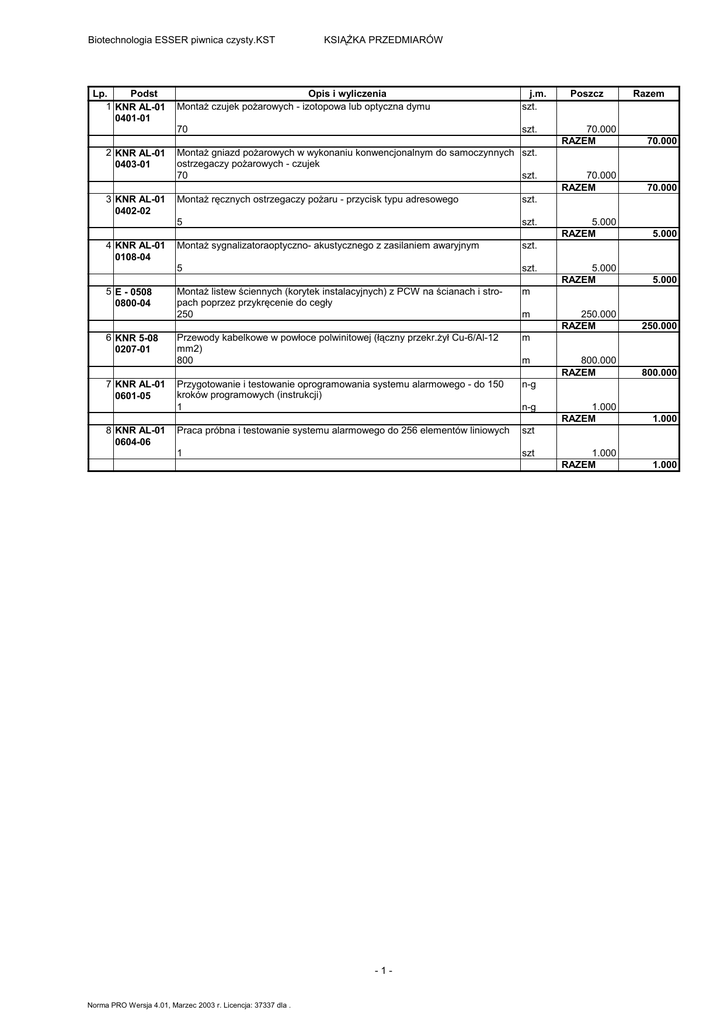 Biotechnologia ESSER piwnica czysty.KST Lp. Podst 1 KNR AL-01 0401-01 2 KNR AL-01 0403-01 3 KNR AL-01 0402-02 4 KNR AL-01 0108-04 5 E - 0508 0800-04 6 KNR 5-08 0207-01 7 KNR AL-01 0601-05 8 KNR AL-01 0604-06 KSIĄśKA PRZEDMIARÓW Opis i wyliczenia MontaŜ czujek poŜarowych - izotopowa lub optyczna dymu j.m. szt. 70 szt. MontaŜ gniazd poŜarowych w wykonaniu konwencjonalnym do samoczynnych szt. ostrzegaczy poŜarowych - czujek 70 szt. MontaŜ ręcznych ostrzegaczy poŜaru - przycisk typu adresowego szt. 5 szt. MontaŜ sygnalizatoraoptyczno- akustycznego z zasilaniem awaryjnym szt. 5 szt. MontaŜ listew ściennych (korytek instalacyjnych) z PCW na ścianach i stropach poprzez przykręcenie do cegły 250 m Przewody kabelkowe w powłoce polwinitowej (łączny przekr.Ŝył Cu-6/Al-12 mm2) 800 m Przygotowanie i testowanie oprogramowania systemu alarmowego - do 150 kroków programowych (instrukcji) 1 n-g Praca próbna i testowanie systemu alarmowego do 256 elementów liniowych szt 1 szt -1- Norma PRO Wersja 4.01, Marzec 2003 r. Licencja: 37337 dla . m m n-g Poszcz Razem 70.000 RAZEM 70.000 70.000 RAZEM 70.000 5.000 RAZEM 5.000 5.000 RAZEM 5.000 250.000 RAZEM 250.000 800.000 RAZEM 800.000 1.000 RAZEM 1.000 1.000 RAZEM 1.000 Biotechnologia ESSER piwnica czysty.KST L Podstawa p. 1 KNR AL-01 0401-01 1* 2* 2 KNR AL-01 0403-01 Opis jm MontaŜ czujek poŜarowych - izotopowa lub optyczna dymu obmiar = 70szt. szt. -- R -robocizna 1.55r-g/szt. r-g -- M -Czujka optyczna dymu dwusensorowa kompa- szt tybilna z istniejącą centralą w Budynku Głównym 1szt/szt. Razem koszty bezpośrednie: Ceny jednostkowe MontaŜ gniazd poŜarowych w wykonaniu konszt. wencjonalnym do samoczynnych ostrzegaczy poŜarowych - czujek obmiar = 70szt. Nakłady Koszt jedn. 108.5000 0.000 70.0000 0.000 56.7000 0.000 2* -- M -Gniazdo czujki 1szt/szt. szt 70.0000 0.000 1* 2* 4 KNR AL-01 0108-04 1* -- R -robocizna 0.9r-g/szt. r-g -- M -Przycisk poŜarowy ROP z obudową kompatybil- szt na z istniejącą centralą w Budynku Głównym 1szt/szt. Razem koszty bezpośrednie: Ceny jednostkowe MontaŜ sygnalizatoraoptyczno- akustycznego z szt. zasilaniem awaryjnym obmiar = 5szt. -- R -robocizna 4.75r-g/szt. -- M -Sygnalizator akustyczny kompatybilna z istniejącą centralą w Budynku Głównym 1szt/szt. Razem koszty bezpośrednie: Ceny jednostkowe 5 E - 0508 0800- MontaŜ listew ściennych (korytek instalacyjnych) z PCW na ścianach i stropach poprzez 04 przykręcenie do cegły obmiar = 250m 2* 1* 2* 3* 4* -- R -robocizna 0.442r-g/m -- M -listwa ścienna 1.04m/m kołki rozporowe 2.7szt/m materiały pomocnicze 2.5% Razem koszty bezpośrednie: Ceny jednostkowe 0.000 4.5000 0.000 0.00 5.0000 0.000 0.000 0.00 0.000 szt 5.0000 0.000 0.000 0.000 0.000 0.00 0.000 23.7500 0.000 0.00 0.000 r-g 0.000 0.000 0.00 0.000 0.000 0.00 0.000 0.000 m r-g 110.5000 0.000 m 260.0000 0.000 0.00 szt 675.0000 0.000 0.00 % 2.5000 0.000 0.00 -2- Norma PRO Wersja 4.01, Marzec 2003 r. Licencja: 37337 dla . 0.00 0.00 r-g S 0.00 0.000 -- R -robocizna 0.81r-g/szt. 3 KNR AL-01 0402-02 M 0.000 1* Razem koszty bezpośrednie: Ceny jednostkowe MontaŜ ręcznych ostrzegaczy poŜaru - przycisk szt. typu adresowego obmiar = 5szt. R 0.000 0.000 0.000 0.000 Biotechnologia ESSER piwnica czysty.KST L Podstawa p. 6 KNR 5-08 0207-01 1* 2* 3* 7 KNR AL-01 0601-05 1* 8 KNR AL-01 0604-06 1* Opis jm Przewody kabelkowe w powłoce polwinitowej (łączny przekr.Ŝył Cu-6/Al-12 mm2) obmiar = 800m Nakłady Koszt jedn. R M S m -- R -robocizna 0.0363*0.955=0.034667r-g/m r-g -- M -przewody kabelkowe YnTKSekw m 1.04m/m materiały pomocnicze % 2.5% Razem koszty bezpośrednie: Ceny jednostkowe Przygotowanie i testowanie oprogramowania n-g systemu alarmowego - do 150 kroków programowych (instrukcji) obmiar = 1n-g -- R -robocizna 105.3r-g/n-g r-g Razem koszty bezpośrednie: Ceny jednostkowe Praca próbna i testowanie systemu alarmowego do 256 elementów liniowych obmiar = 1szt szt -- R -robocizna 61r-g/szt r-g 27.7336 0.000 832.0000 0.000 0.00 2.5000 0.000 0.00 105.3000 61.0000 Razem koszty bezpośrednie: Ceny jednostkowe 0.00 0.000 0.000 0.000 0.00 0.000 0.000 0.000 0.00 0.000 0.000 0.000 0.000 0.000 0.000 0.000 0.000 PODSUMOWANIE RAZEM Robocizna CAŁY KOSZTORYS Materiały Sprzęt RAZEM OGÓŁEM Słownie: zero i 00/100 zł -3- Norma PRO Wersja 4.01, Marzec 2003 r. Licencja: 37337 dla .