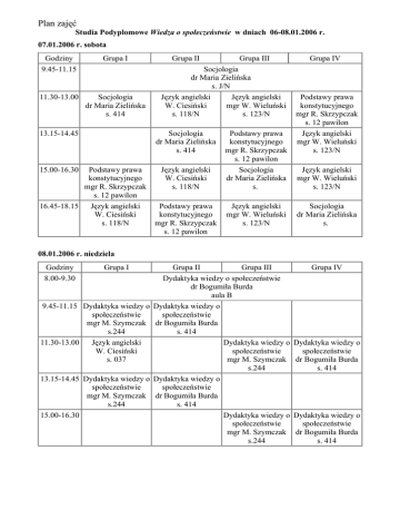 Plan zajęć Studia Podyplomowe Wiedza o społeczeństwie w dniach 06-08.01.2006 r. 07.01.2006 r. sobota Godziny 9.45-11.15 Grupa I 11.30-13.00 Socjologia dr Maria Zielińska s. 414 Grupa II Socjologia dr Maria Zielińska s. J/N Język angielski Język angielski W. Ciesiński mgr W. Wieluński s. 118/N s. 123/N 13.15-14.45 Socjologia dr Maria Zielińska s. 414 15.00-16.30 Język angielski W. Ciesiński s. 118/N Podstawy prawa konstytucyjnego mgr R. Skrzypczak s. 12 pawilon 16.45-18.15 Język angielski W. Ciesiński s. 118/N Grupa III Podstawy prawa konstytucyjnego mgr R. Skrzypczak s. 12 pawilon Podstawy prawa konstytucyjnego mgr R. Skrzypczak s. 12 pawilon Socjologia dr Maria Zielińska s. Język angielski mgr W. Wieluński s. 123/N Grupa IV Podstawy prawa konstytucyjnego mgr R. Skrzypczak s. 12 pawilon Język angielski mgr W. Wieluński s. 123/N Język angielski mgr W. Wieluński s. 123/N Socjologia dr Maria Zielińska s. 08.01.2006 r. niedziela Godziny 8.00-9.30 Grupa I 9.45-11.15 Dydaktyka wiedzy o społeczeństwie mgr M. Szymczak s.244 11.30-13.00 Język angielski W. Ciesiński s. 037 13.15-14.45 Dydaktyka wiedzy o społeczeństwie mgr M. Szymczak s.244 15.00-16.30 Grupa II Grupa III Dydaktyka wiedzy o społeczeństwie dr Bogumiła Burda aula B Dydaktyka wiedzy o społeczeństwie dr Bogumiła Burda s. 414 Dydaktyka wiedzy o społeczeństwie mgr M. Szymczak s.244 Dydaktyka wiedzy o społeczeństwie dr Bogumiła Burda s. 414 Dydaktyka wiedzy o społeczeństwie mgr M. Szymczak s.244 Grupa IV Dydaktyka wiedzy o społeczeństwie dr Bogumiła Burda s. 414 Dydaktyka wiedzy o społeczeństwie dr Bogumiła Burda s. 414