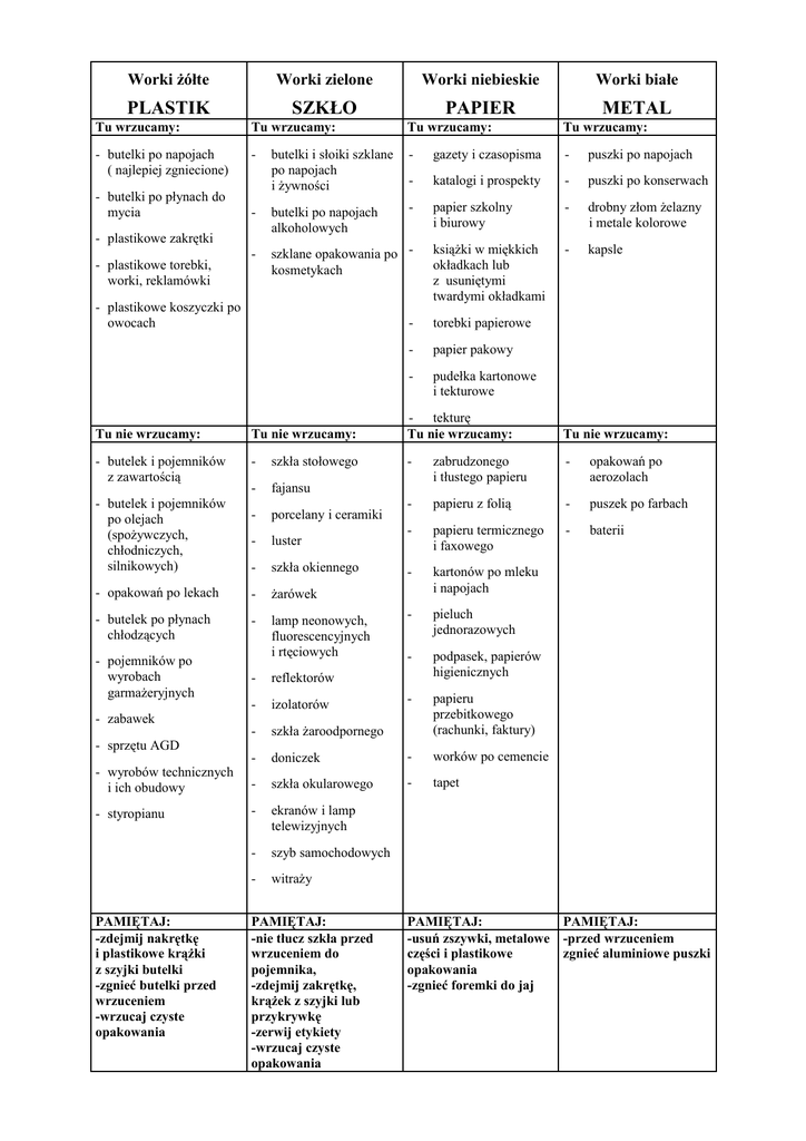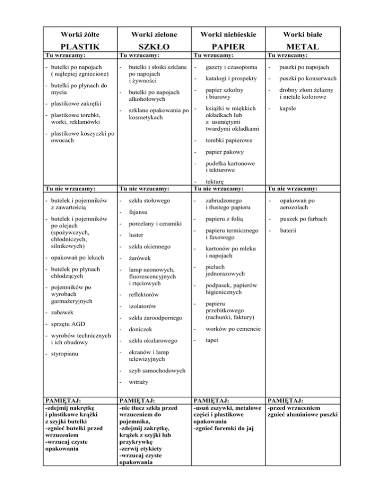 Worki żółte Worki zielone PLASTIK Worki niebieskie SZKŁO Worki białe PAPIER METAL Tu wrzucamy: Tu wrzucamy: Tu wrzucamy: Tu wrzucamy: - butelki po napojach ( najlepiej zgniecione) - butelki i słoiki szklane po napojach i żywności - gazety i czasopisma - puszki po napojach - katalogi i prospekty - puszki po konserwach - butelki po napojach alkoholowych - papier szkolny i biurowy - drobny złom żelazny i metale kolorowe - szklane opakowania po kosmetykach książki w miękkich okładkach lub z usuniętymi twardymi okładkami - kapsle - butelki po płynach do mycia - plastikowe zakrętki - plastikowe torebki, worki, reklamówki - plastikowe koszyczki po owocach - torebki papierowe - papier pakowy - pudełka kartonowe i tekturowe Tu nie wrzucamy: Tu nie wrzucamy: - tekturę Tu nie wrzucamy: Tu nie wrzucamy: - butelek i pojemników z zawartością - szkła stołowego - - - fajansu zabrudzonego i tłustego papieru opakowań po aerozolach - porcelany i ceramiki - papieru z folią - puszek po farbach - luster - papieru termicznego i faxowego - baterii - szkła okiennego - - opakowań po lekach - żarówek kartonów po mleku i napojach - butelek po płynach chłodzących - lamp neonowych, fluorescencyjnych i rtęciowych - pieluch jednorazowych - podpasek, papierów higienicznych - papieru przebitkowego (rachunki, faktury) - butelek i pojemników po olejach (spożywczych, chłodniczych, silnikowych) - pojemników po wyrobach garmażeryjnych - zabawek - sprzętu AGD - wyrobów technicznych i ich obudowy - styropianu PAMIĘTAJ: -zdejmij nakrętkę i plastikowe krążki z szyjki butelki -zgnieć butelki przed wrzuceniem -wrzucaj czyste opakowania - reflektorów - izolatorów - szkła żaroodpornego - doniczek - worków po cemencie - szkła okularowego - tapet - ekranów i lamp telewizyjnych - szyb samochodowych - witraży PAMIĘTAJ: -nie tłucz szkła przed wrzuceniem do pojemnika, -zdejmij zakrętkę, krążek z szyjki lub przykrywkę -zerwij etykiety -wrzucaj czyste opakowania PAMIĘTAJ: PAMIĘTAJ: -usuń zszywki, metalowe -przed wrzuceniem części i plastikowe zgnieć aluminiowe puszki opakowania -zgnieć foremki do jaj